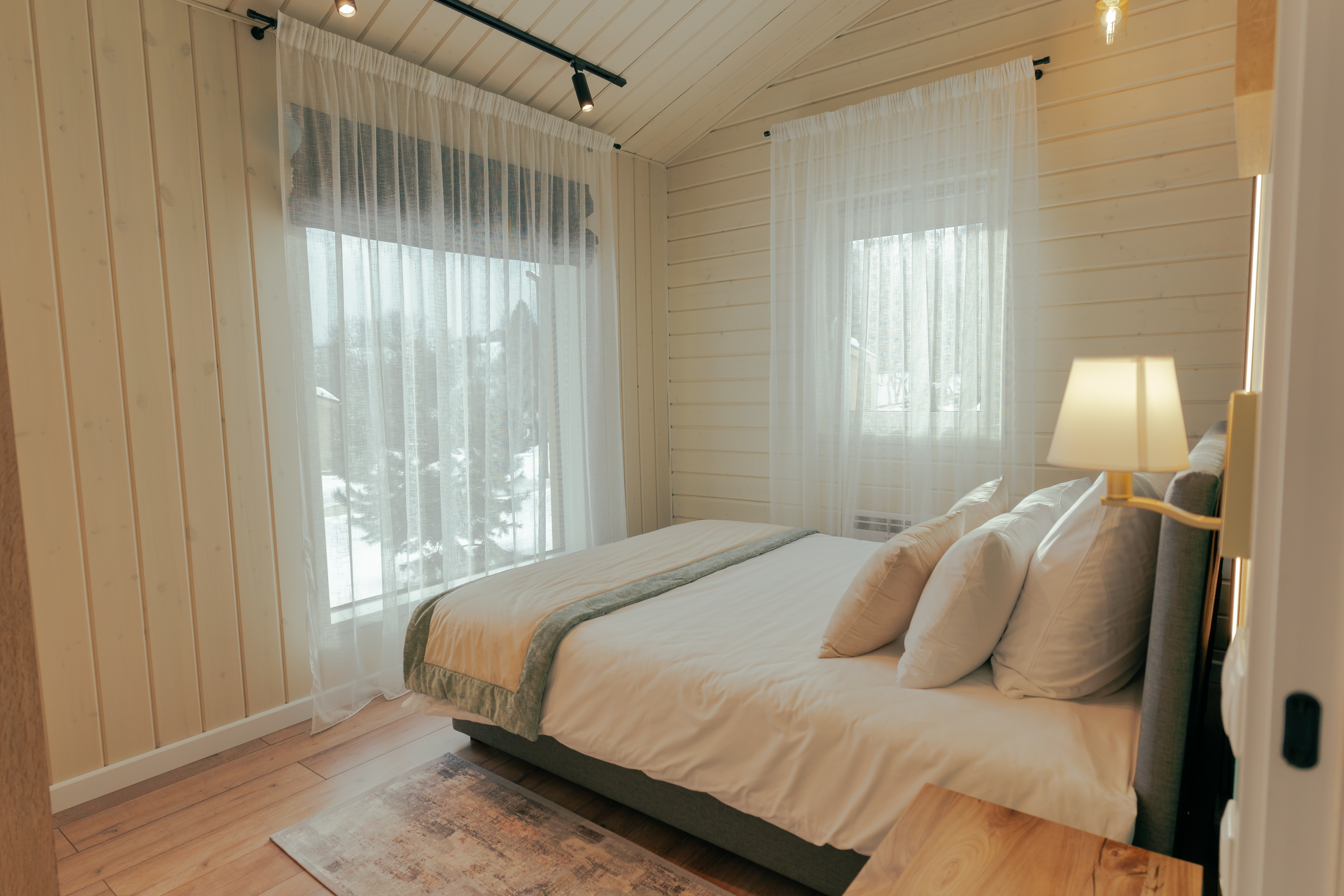 Просторный лодж с панорамными окнами, увеличенной меблированной террасой, гостиной и двумя спальнями – для комфортного размещения от 2 до 6 гостей.