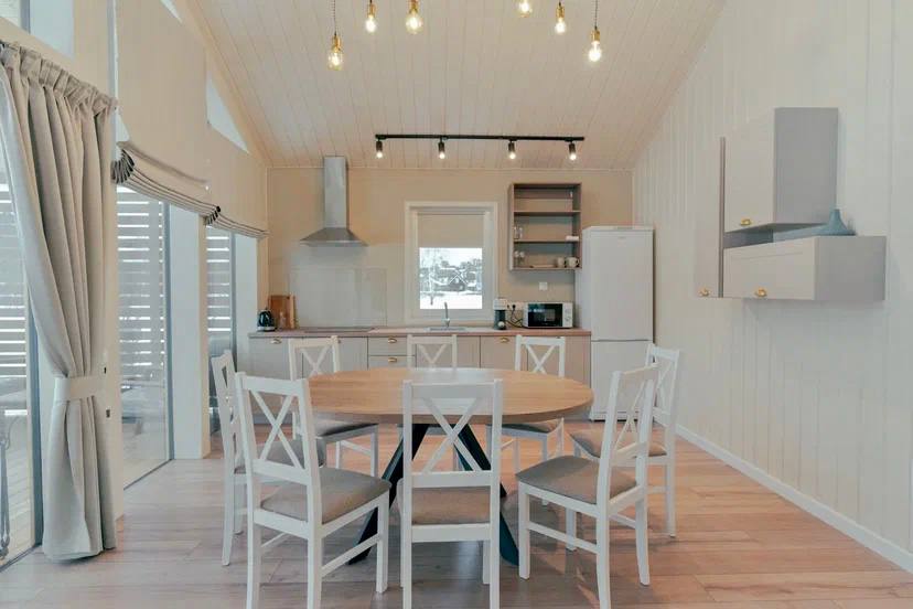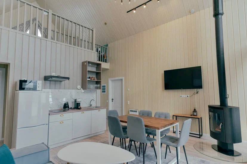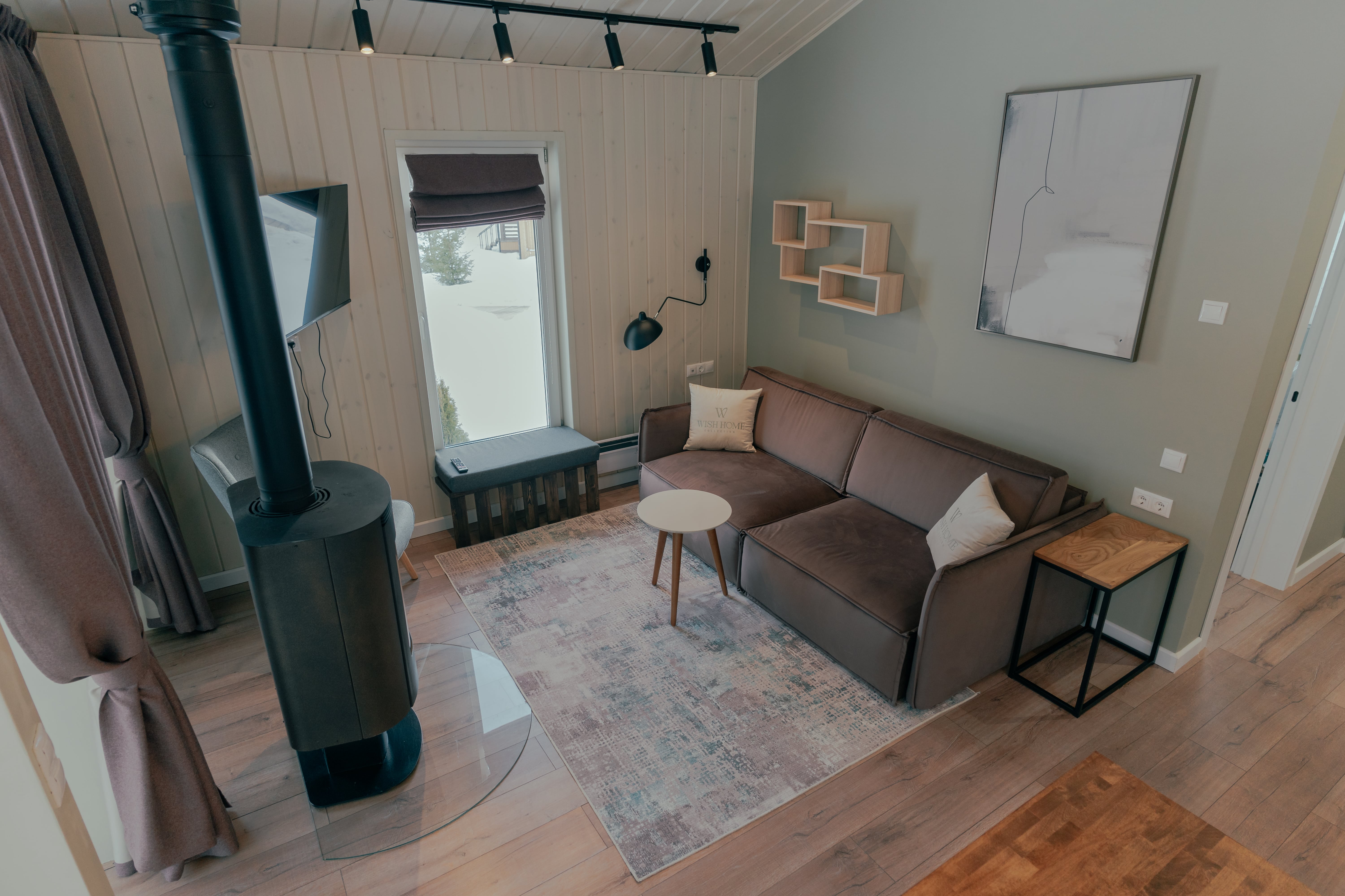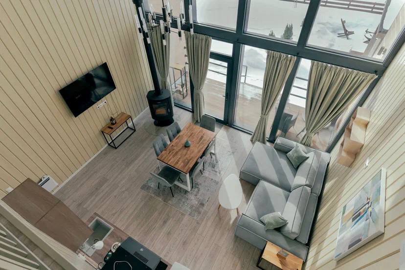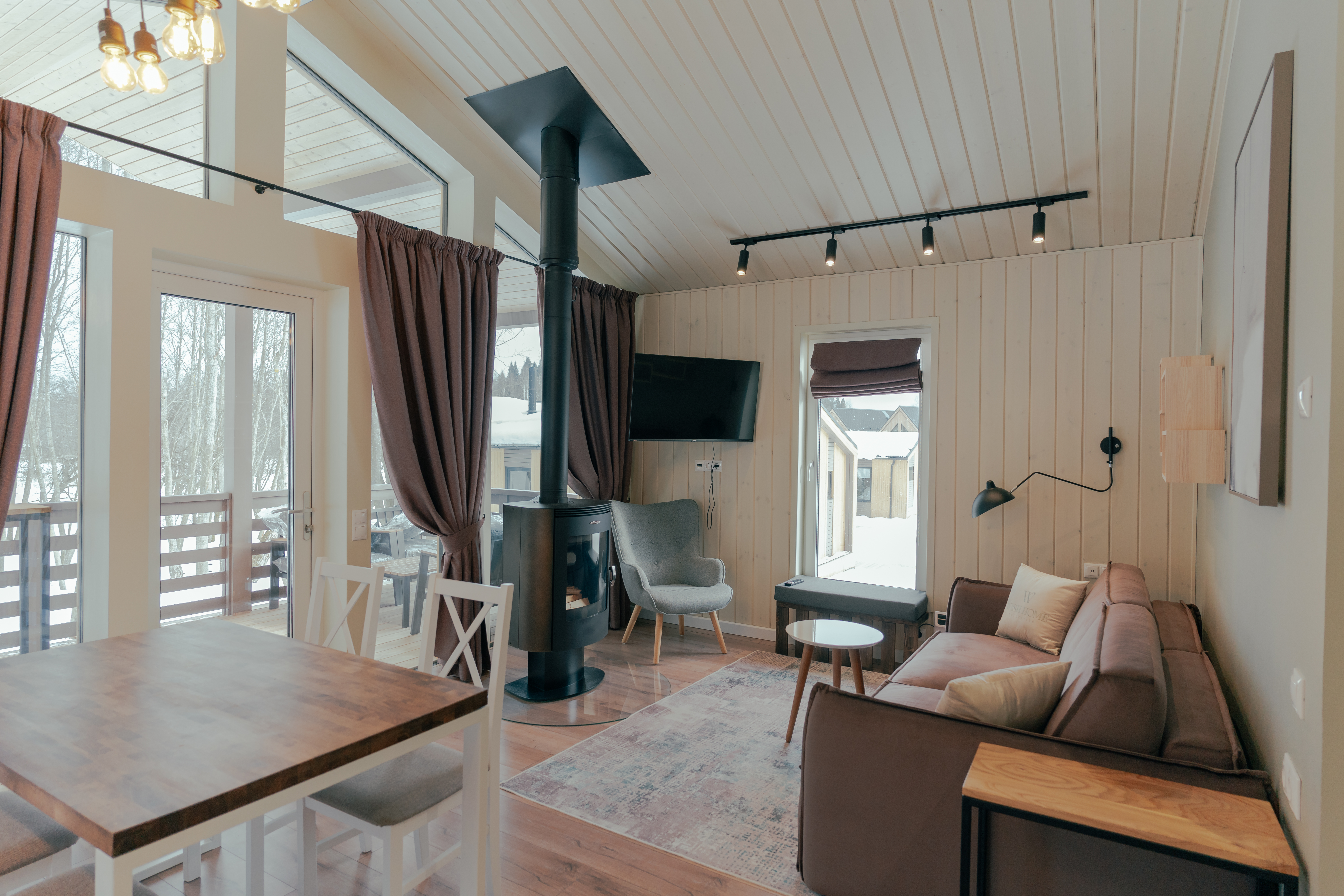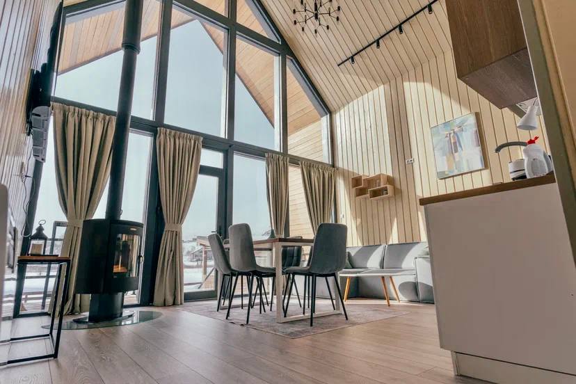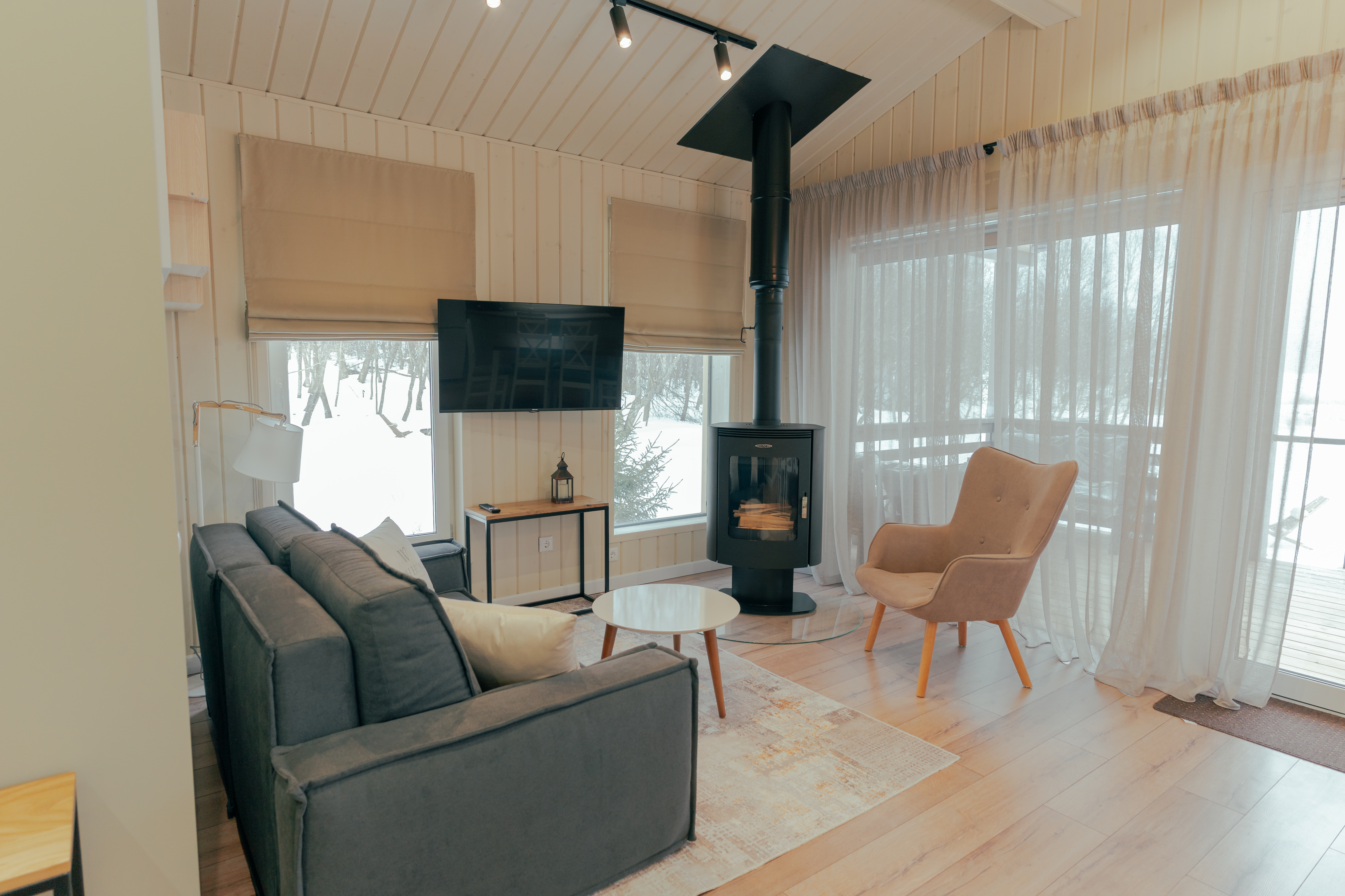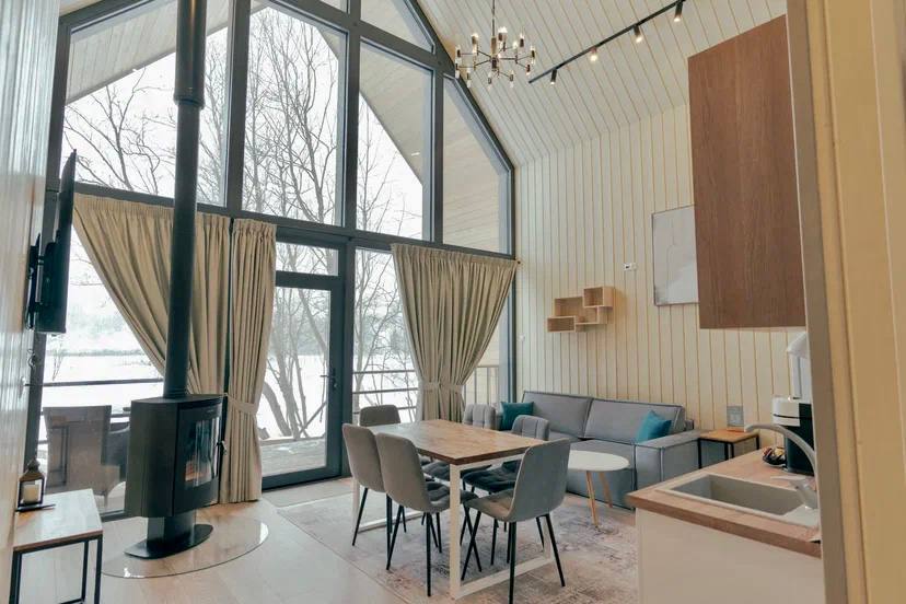 В гостиной каждого лоджа – дровяной камин с зоной отдыха и обеденная зона с функциональной кухней, оснащенной всем необходимым для приготовления семейного обеда или романтического ужина.