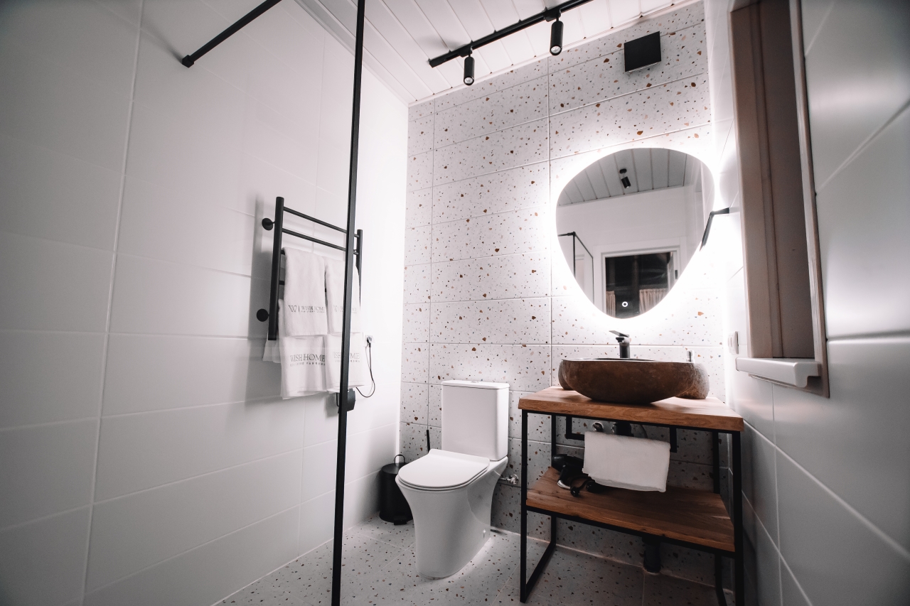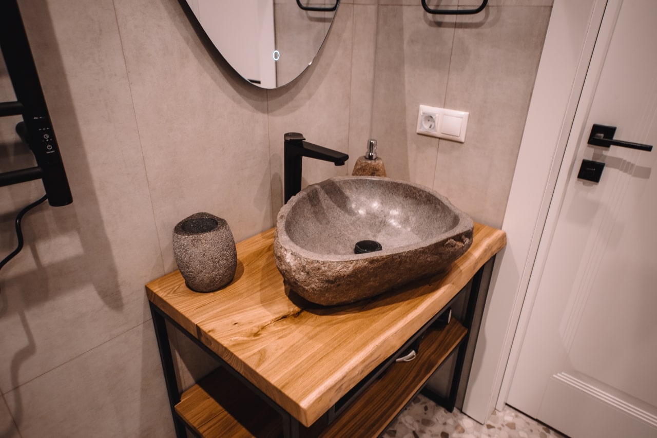 Интерьер выполнен в скандинавском стиле с использованием экологичных материалов, натуральных фактур, которые дополняют ощущение единения с природой.