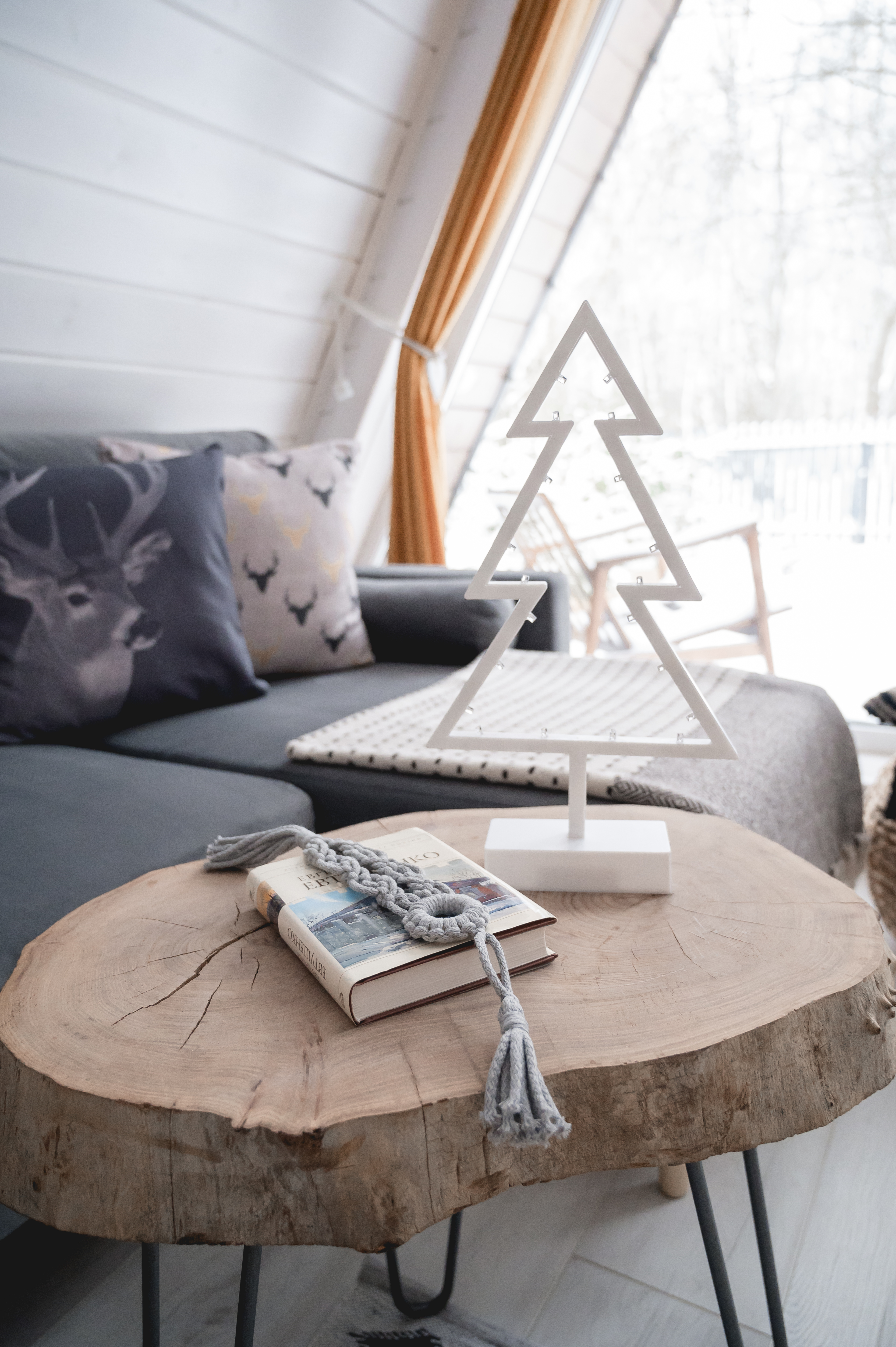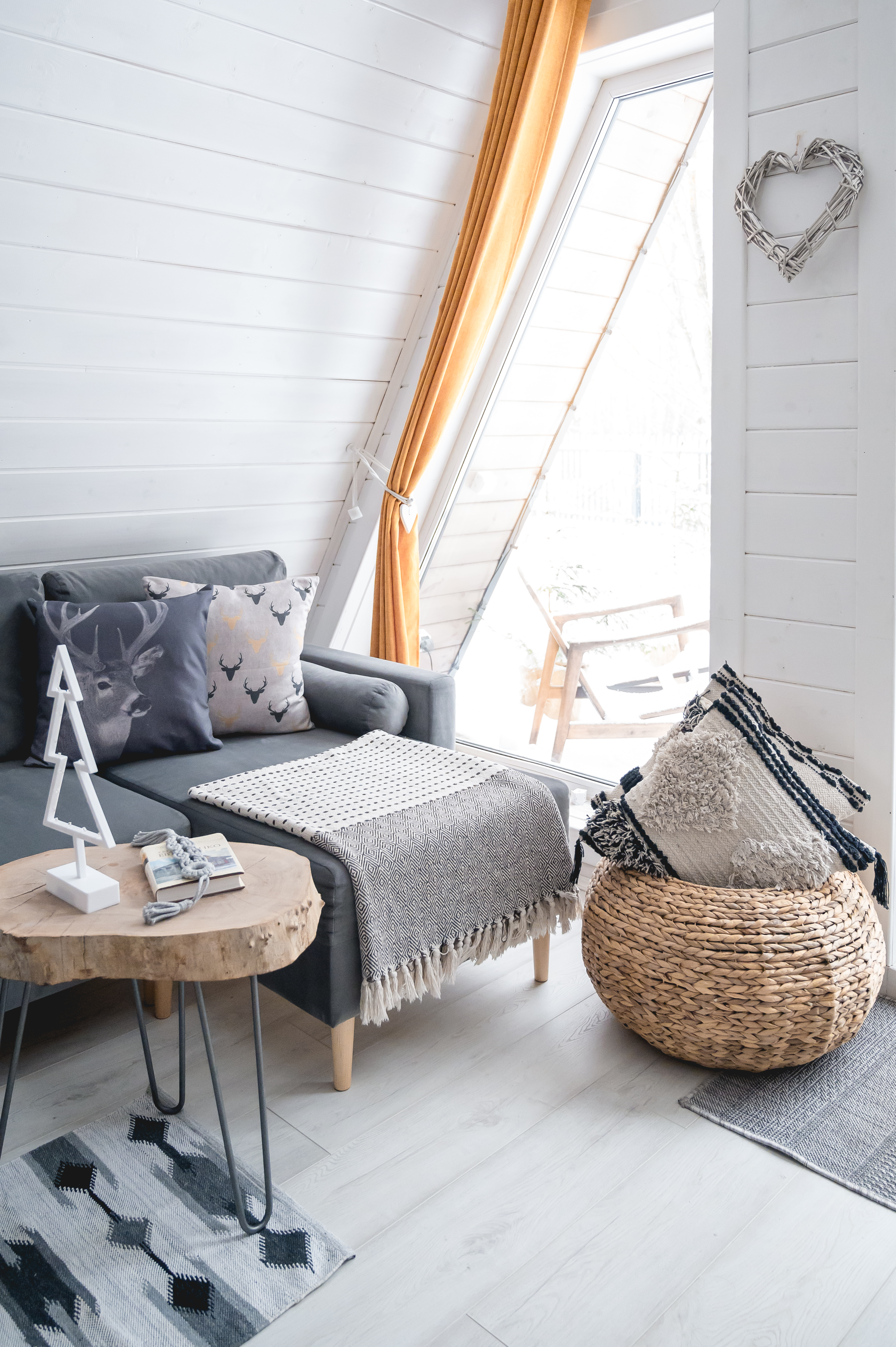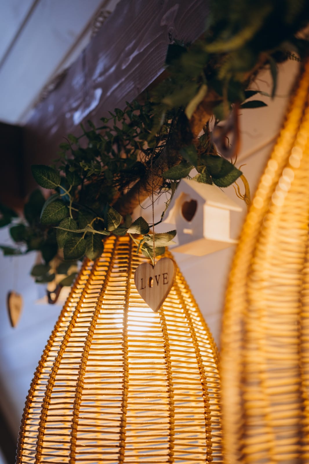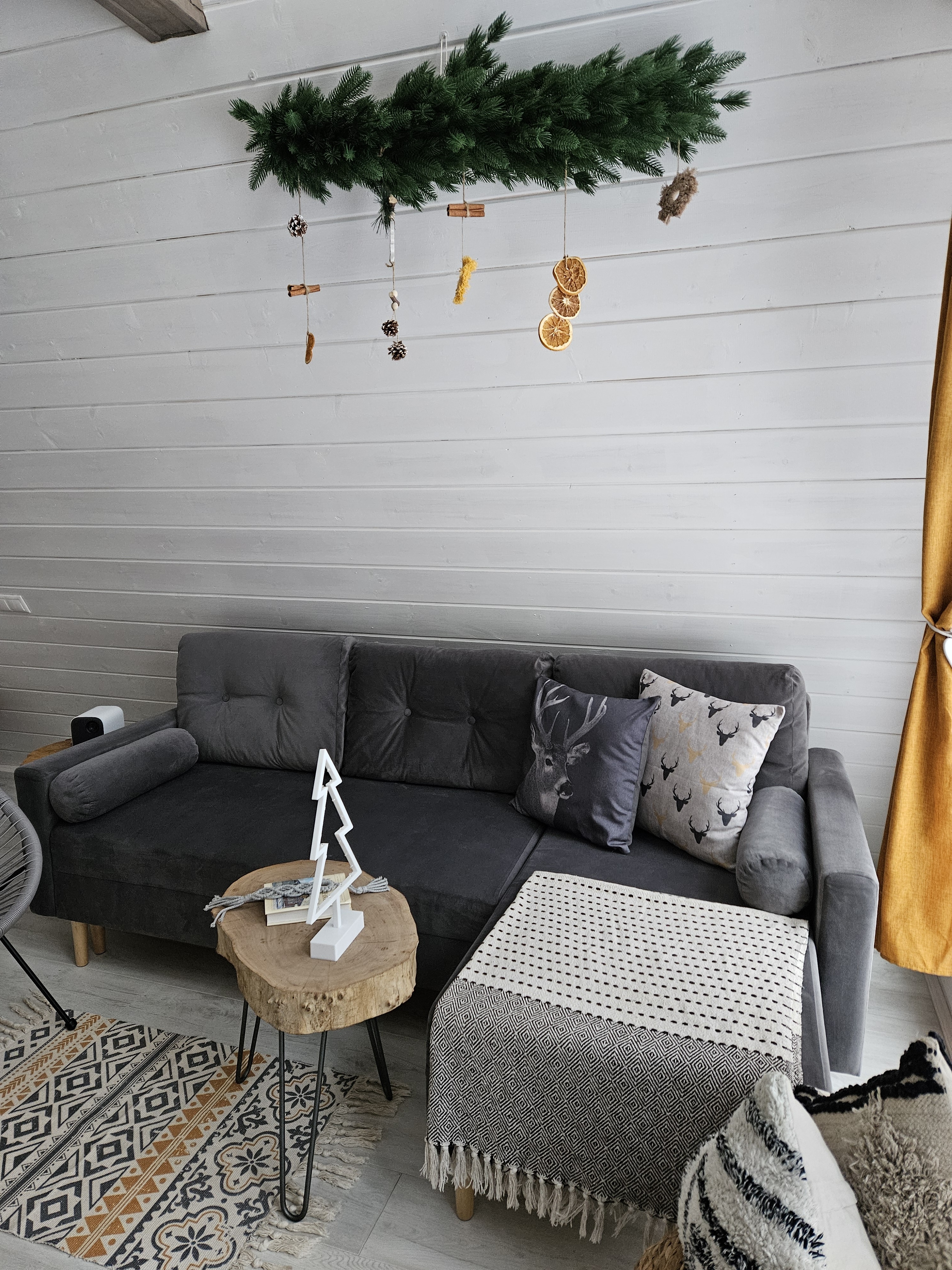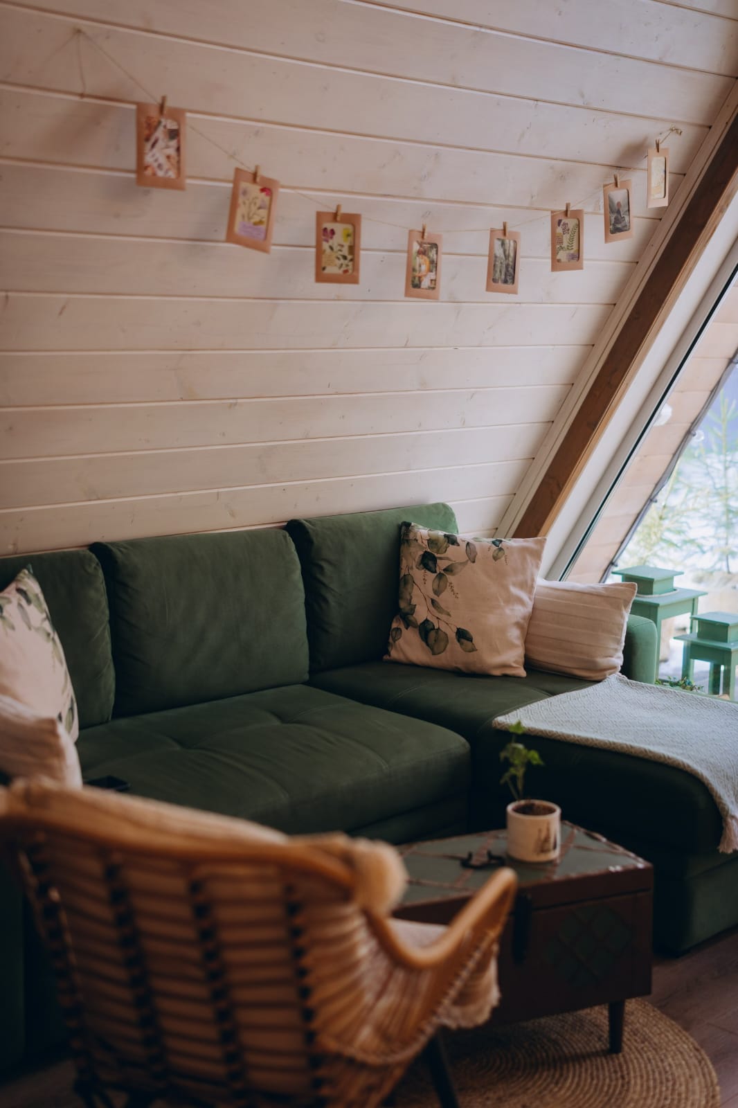 Над диваном есть гирлянда с фоторамками – можно взять фото или открытки и сделать сюрприз любимому человеку;