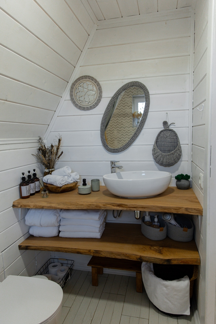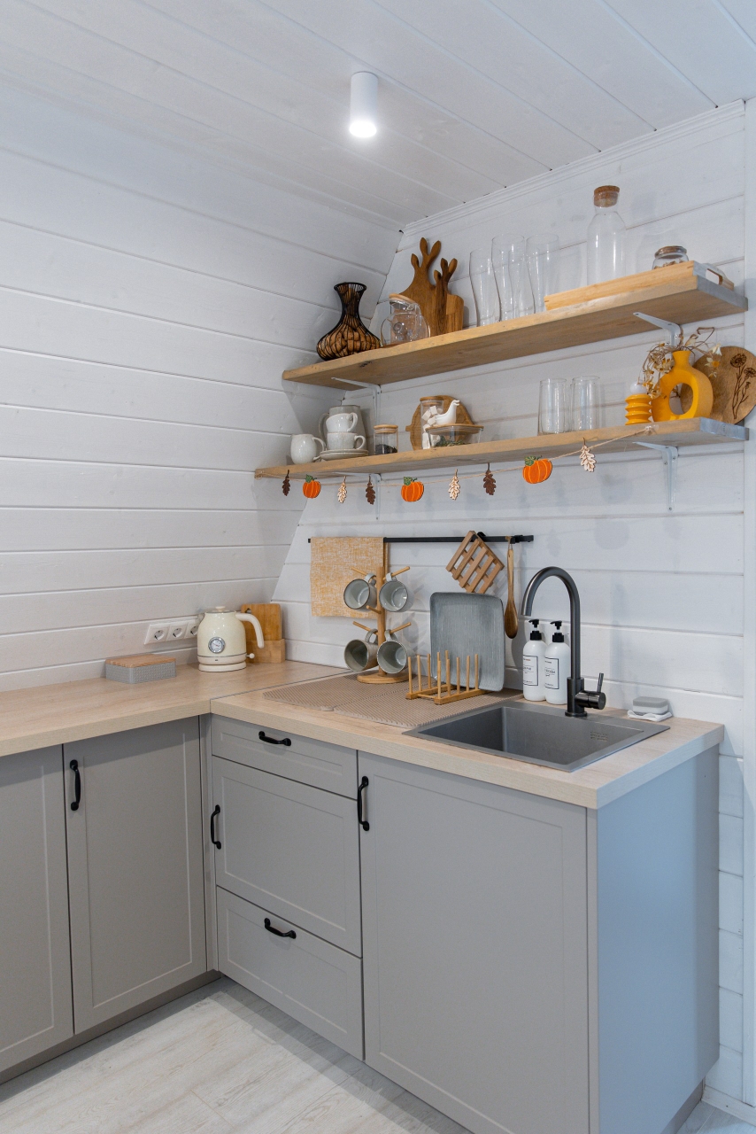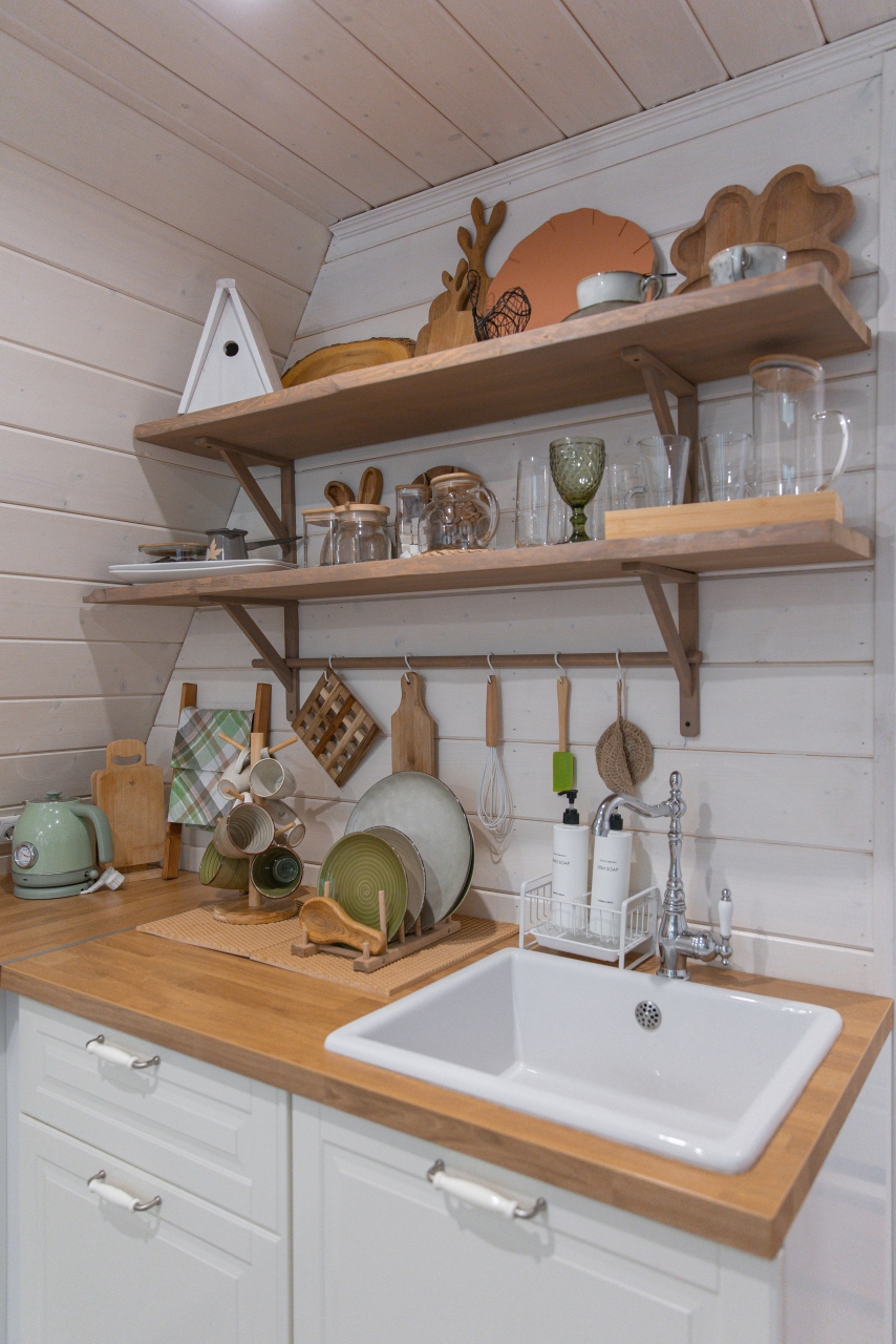 - Кухня со всем необходимым: маленький холодильник, однокомфорочная индукционная плита, СВЧ, электрический чайник, вафельница (в домике с сундуком), посуда для приготовления и красивой сервировки;