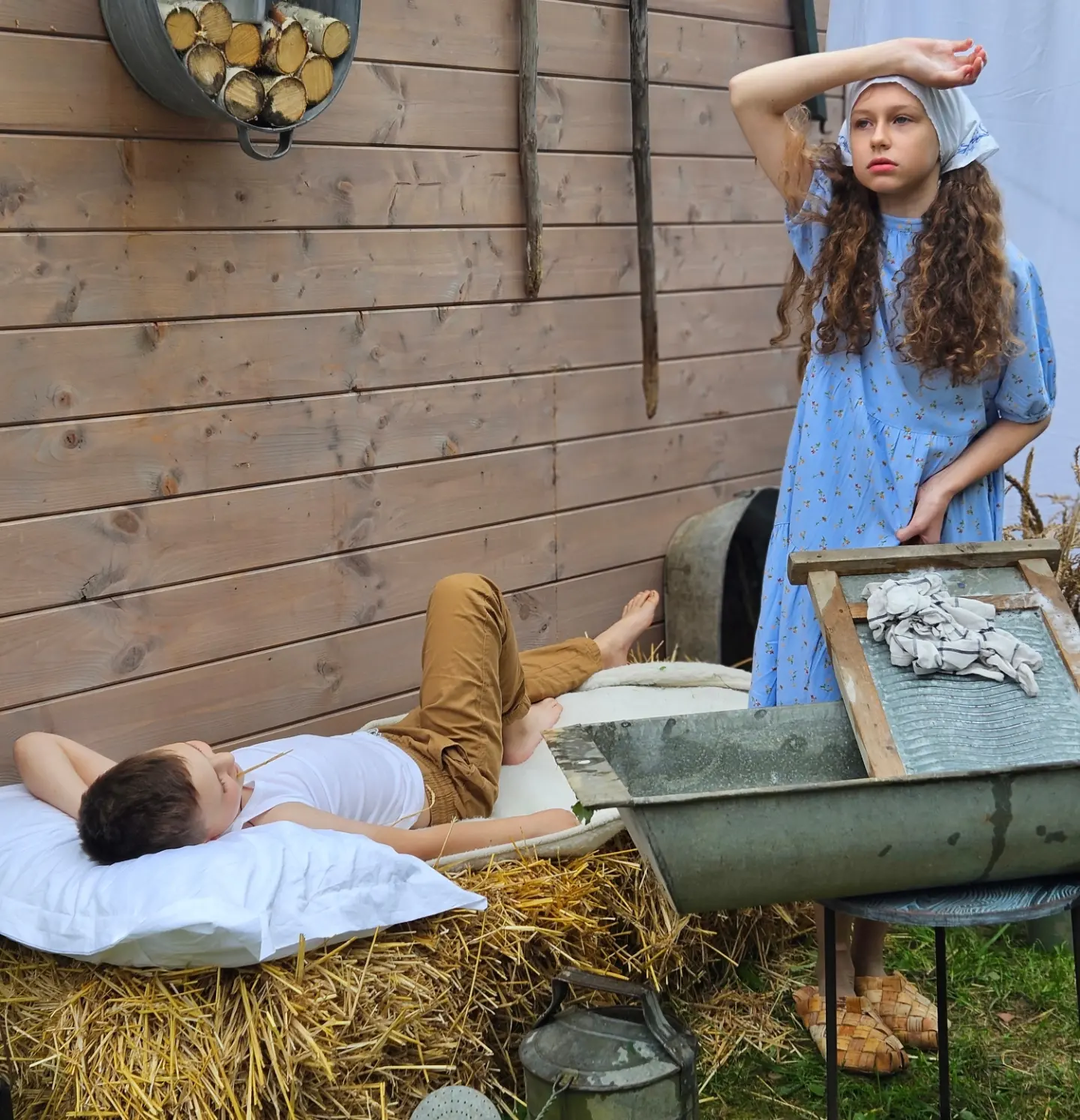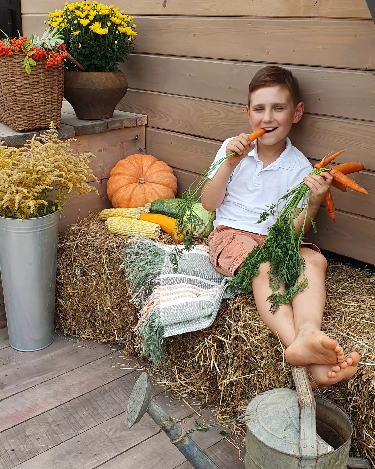 отдельные пледы для организации зоны пикника на траве + корзинка для пикника, соломенные шляпы, деревянные подносы, подушки, авоськи и блюда.