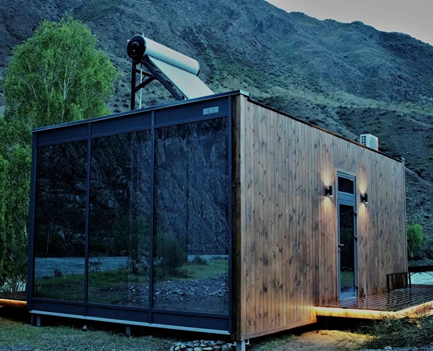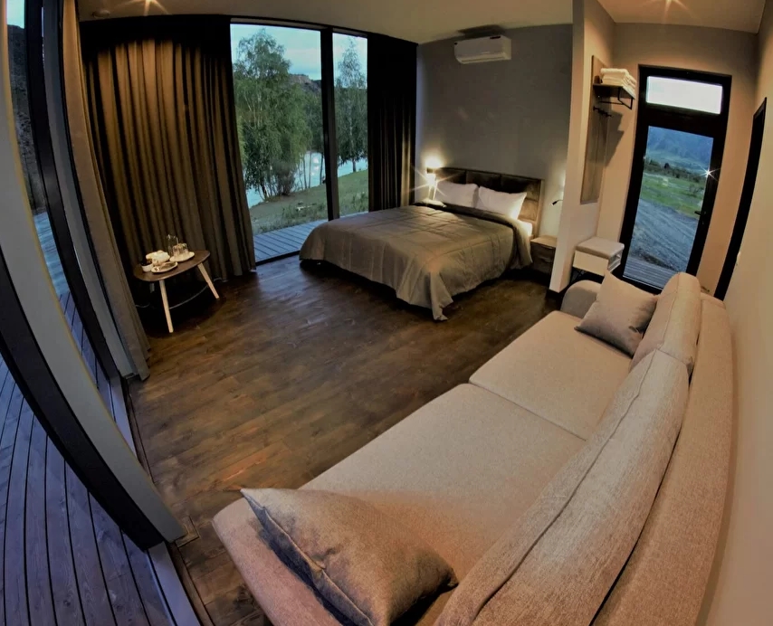 - Панорамное стена-окно с видом на катунь и долину.