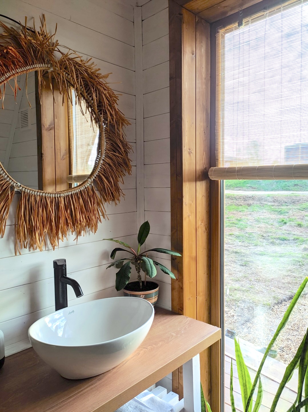 - Аутентичный санузел с панорамным окном во весь рост и тропическим душем.