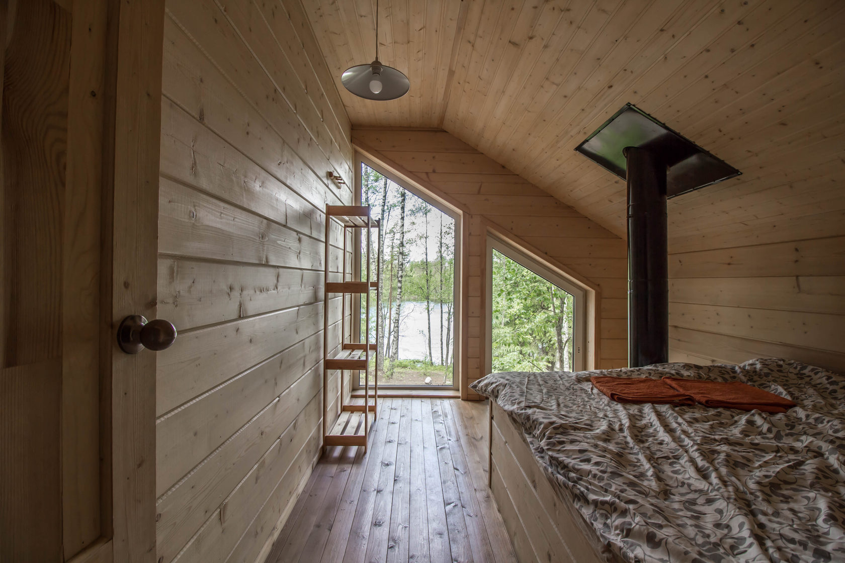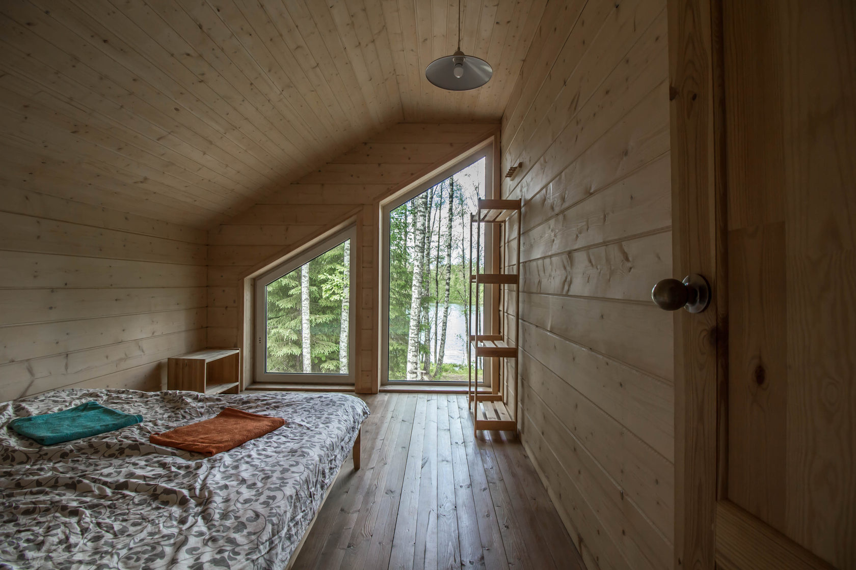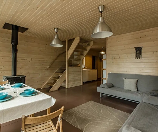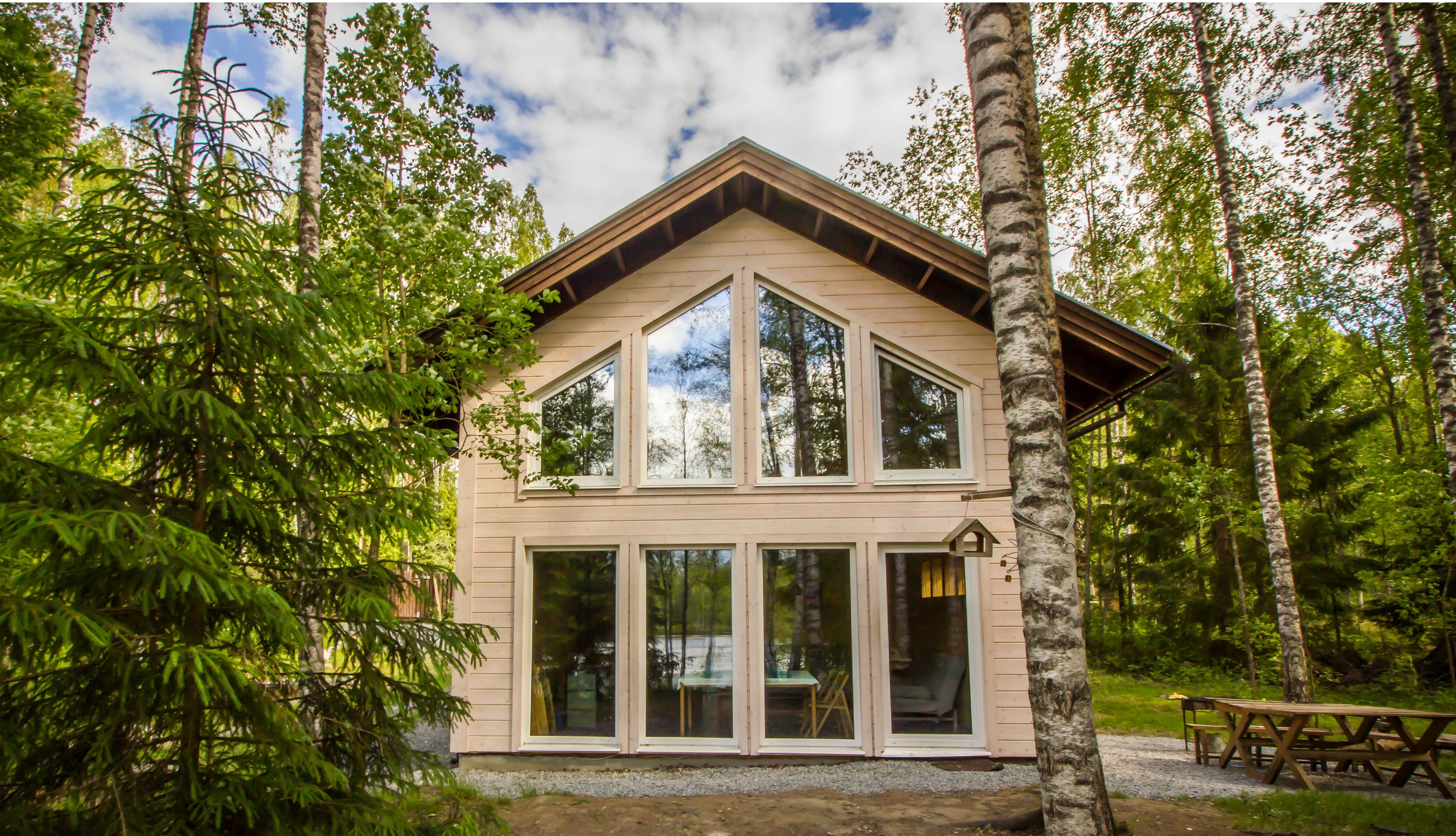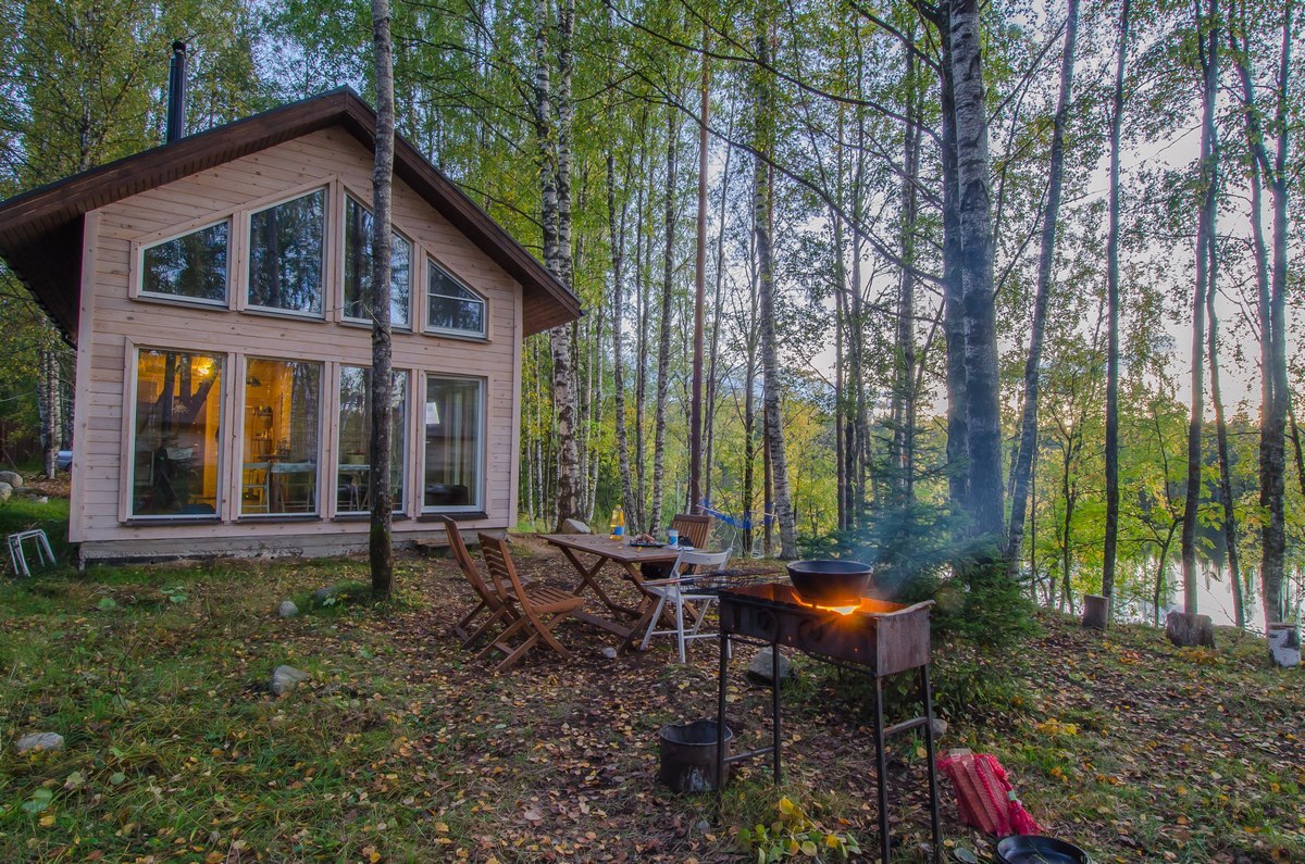 Коттедж имеет панораму первого этажа с прямым видом на озеро, в 12 метрах от воды и уединенную зону отдыха со столом и мангалом. Общая площадь составляет 100 м2.