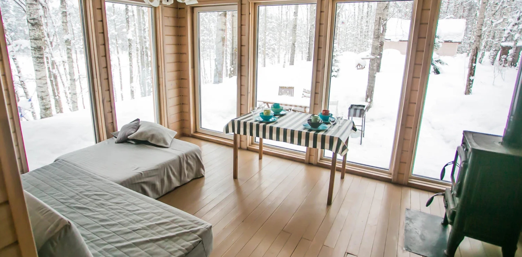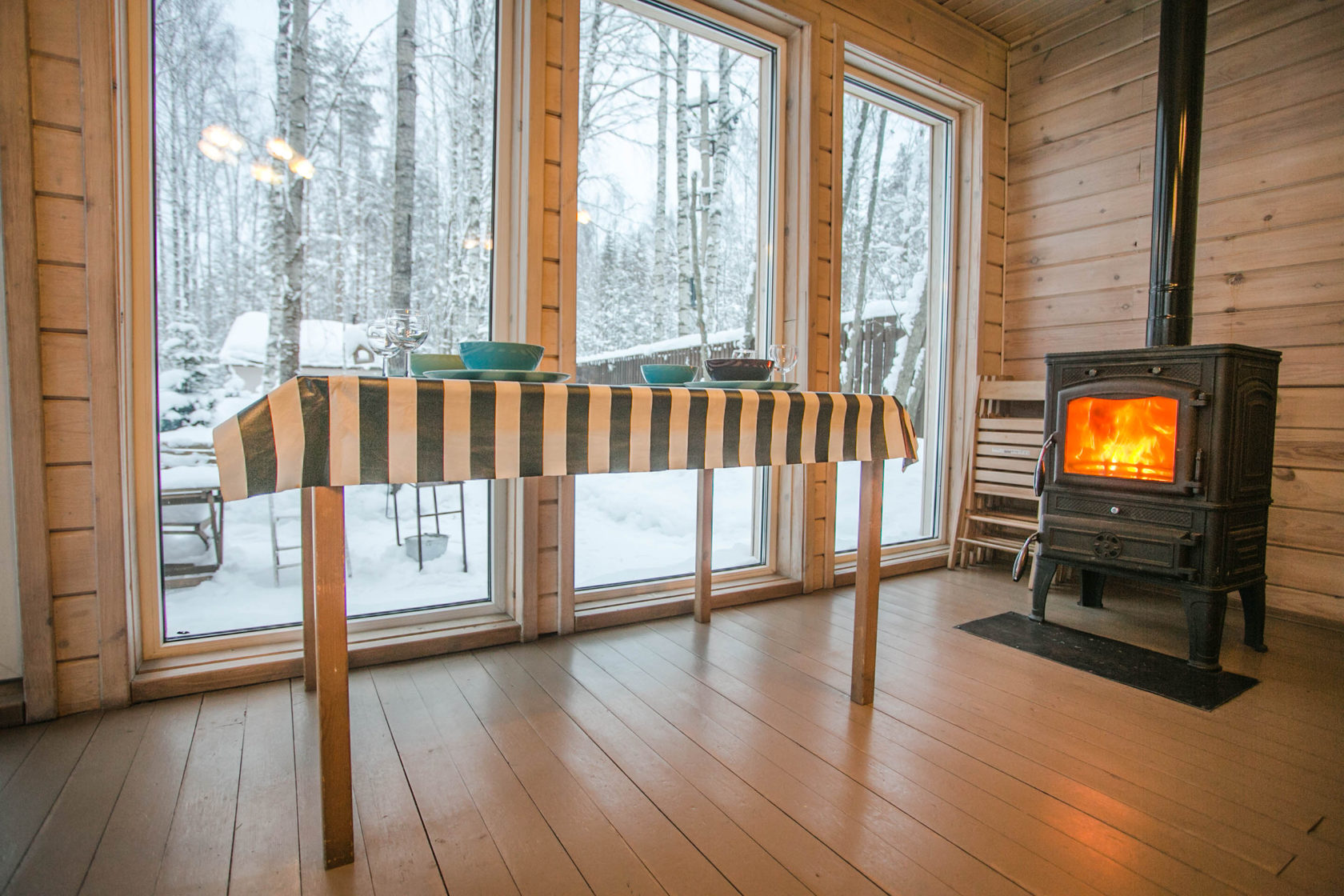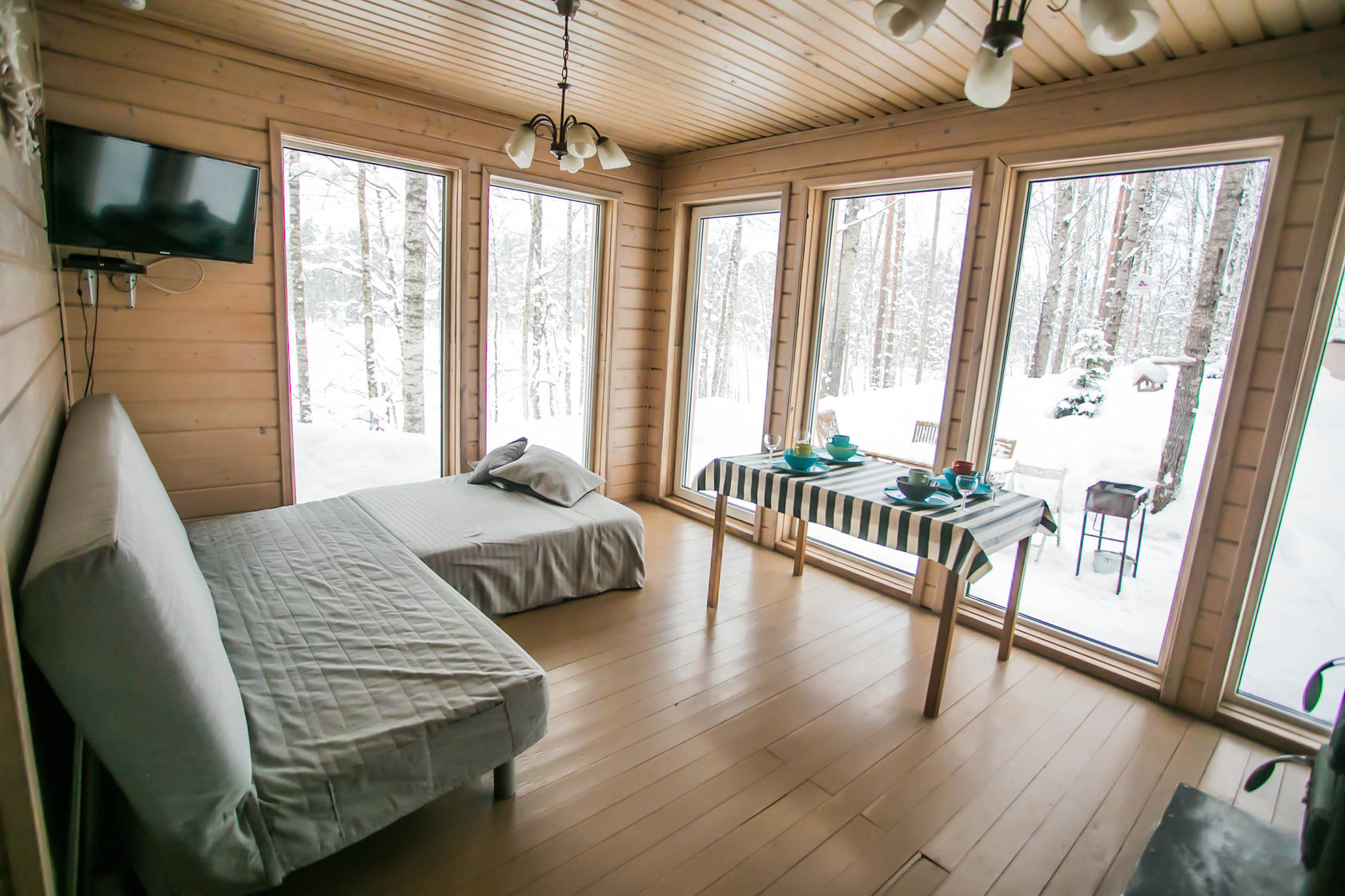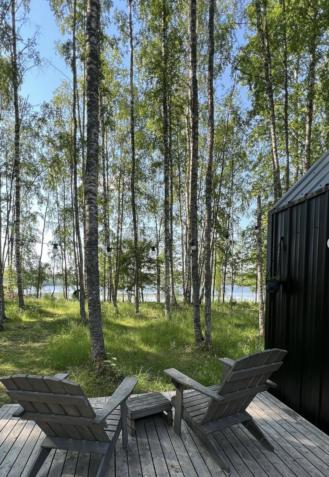 Коттедж имеет панораму первого этажа с прямым видом на озеро, в 12 метрах от воды и уединенную зону отдыха со столом и мангалом. Общая площадь составляет 100 м2.