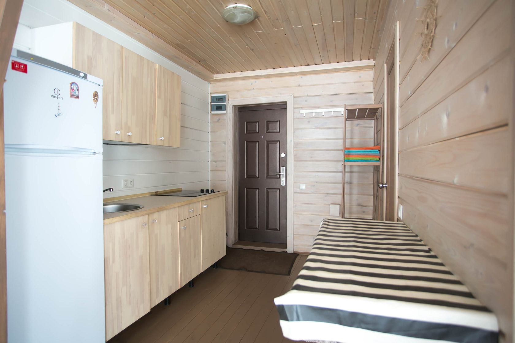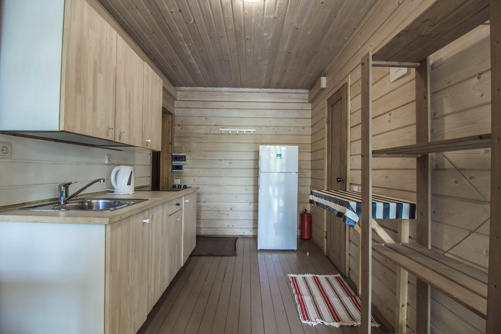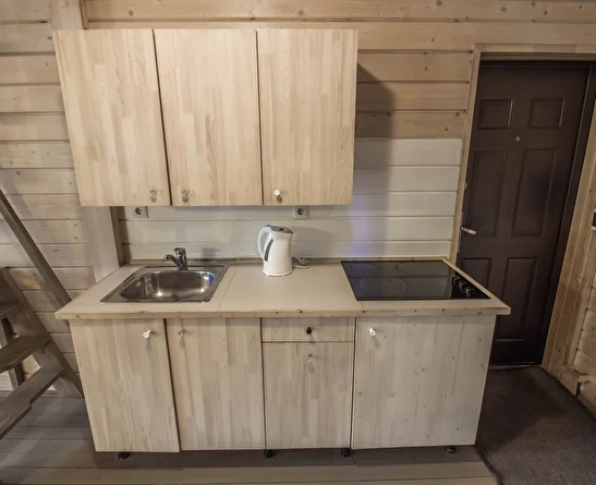 - Кухонная зона: плита, холодильник, чайник, набор посуды.