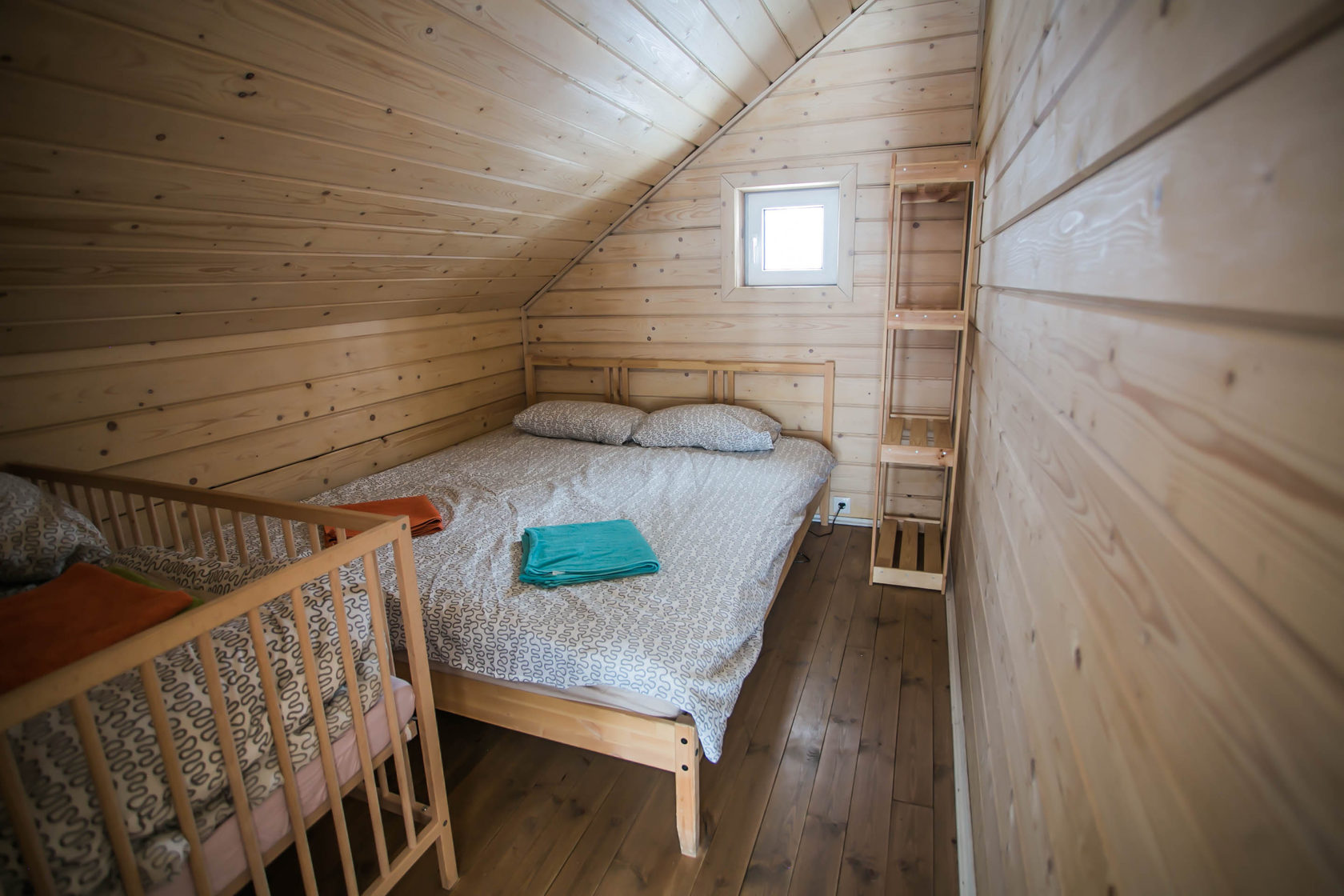- Две спальни имеют панорамные окна. Детская кроватка одна на коттедж