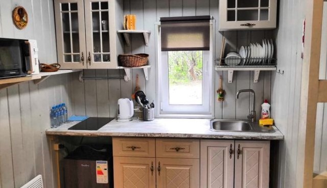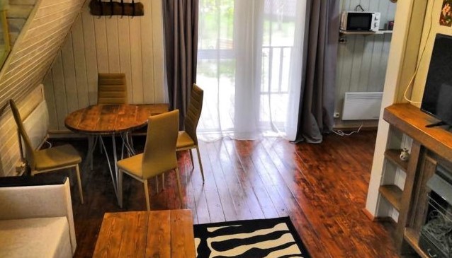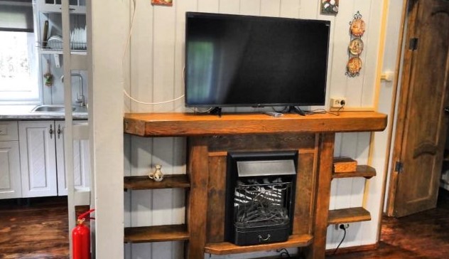 - Первый этаж - кухня, ванная комната, диван, кровать двухспальная, стол и стулья, шкаф, телевизор