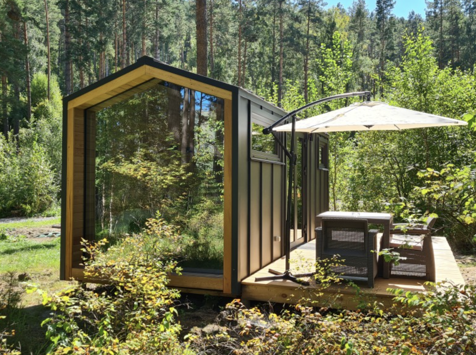Собственный уголок для единения с природой под двускатной крышей. Открытая терраса.