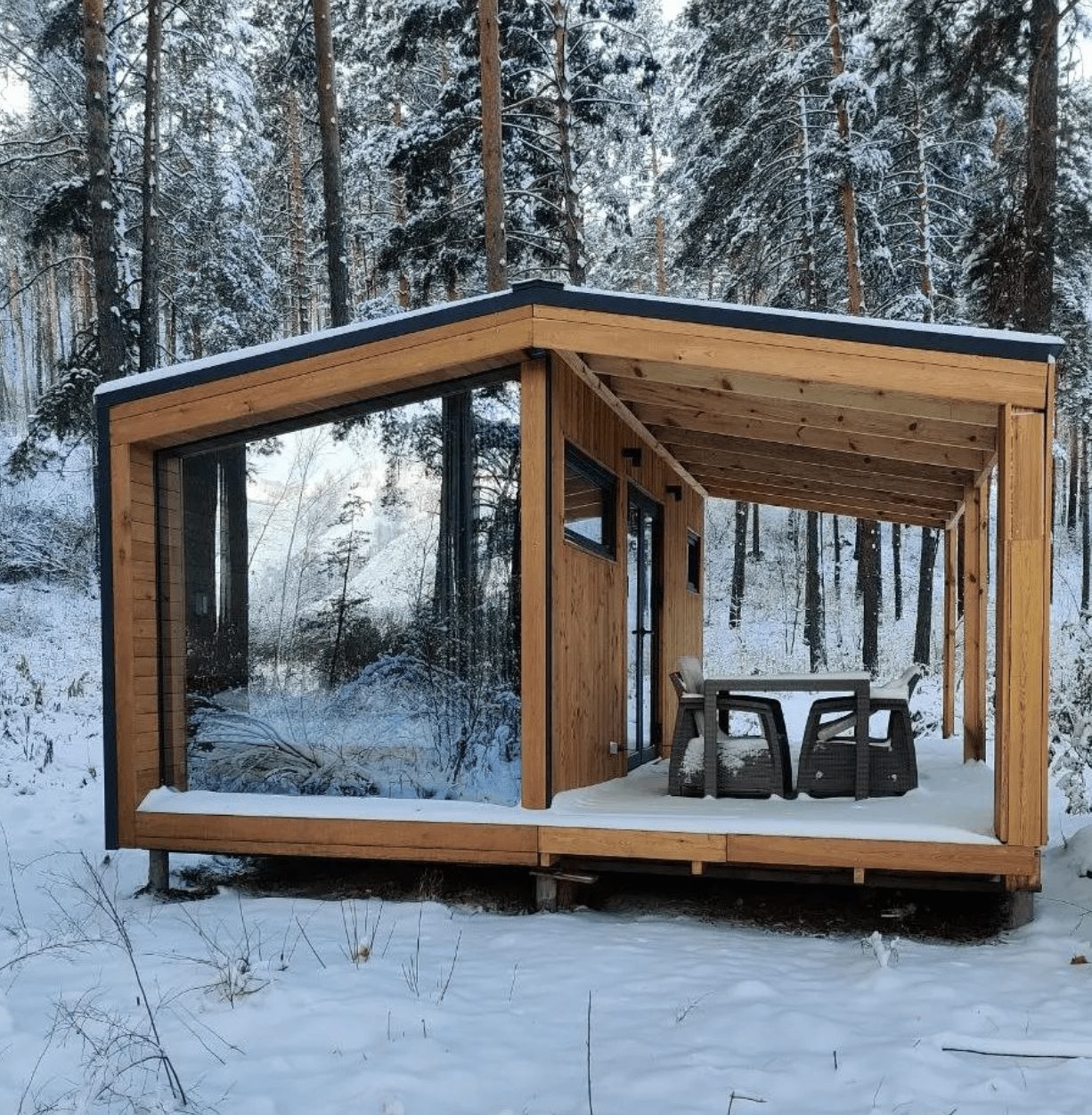 Компактное пространство под односкатной крышей, «взмывающей» к звездам. Крытая терраса.