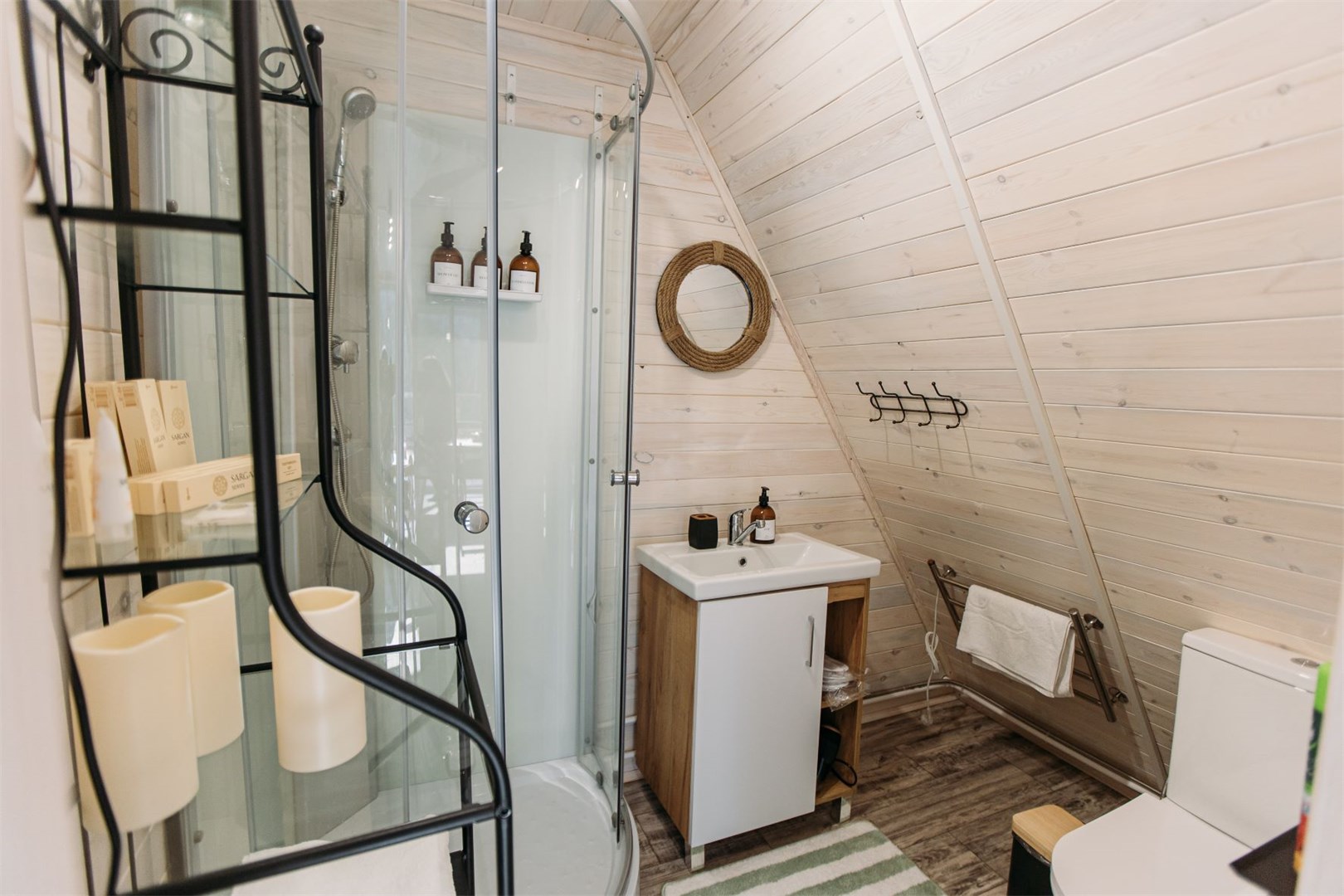 Санузел с душевой кабиной, раковиной, туалетом, банными полотенцами, халатами, тапочками, всеми необходимыми средствами гигиены;
