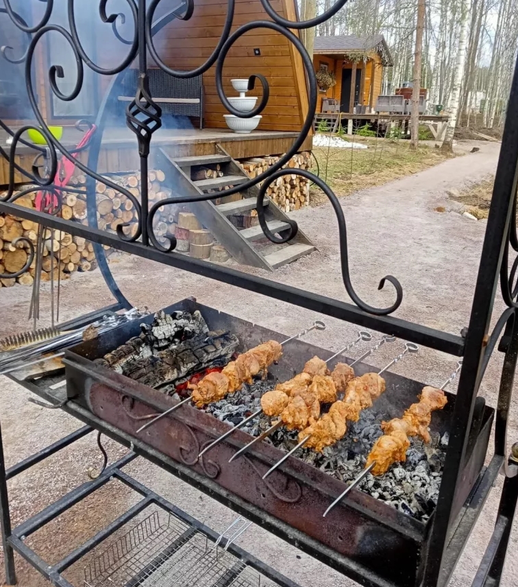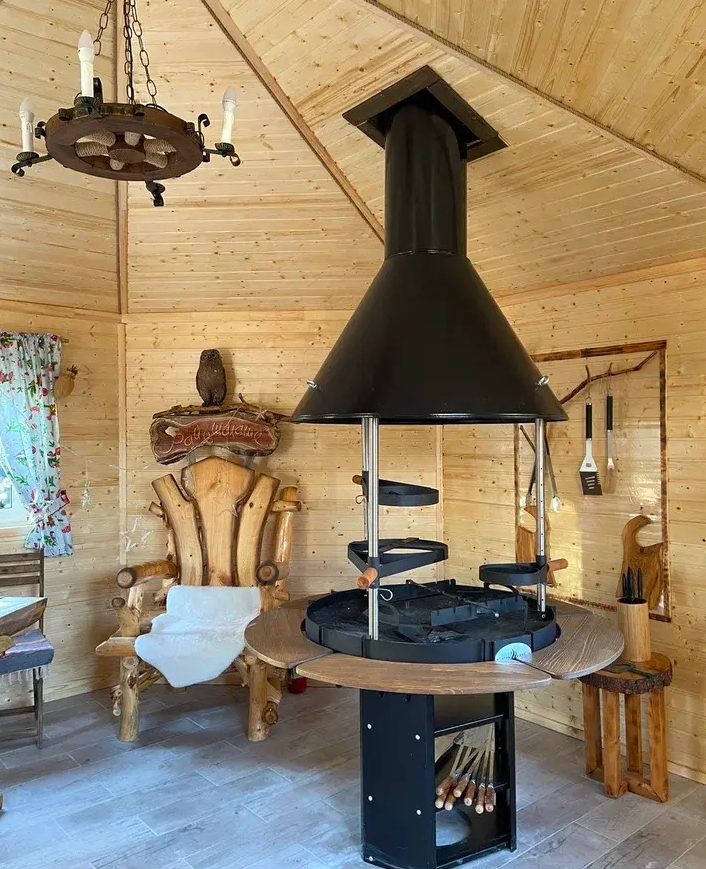 - Гриль-беседка с круговой жаровней. В ней можно отпраздновать день рождения на 6—8 человек. При этом насладиться процессом готовки блюд на круговой жаровне. Для этого есть все необходимое: шампуры, решетки, большая вилка, лопатка и щипцы. В гриль-беседке есть телевизор. Можно включить мультики деткам или музыкальные клипы взрослым.