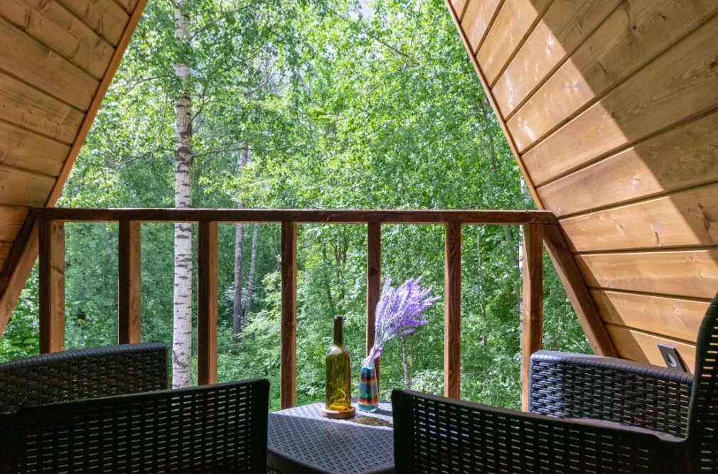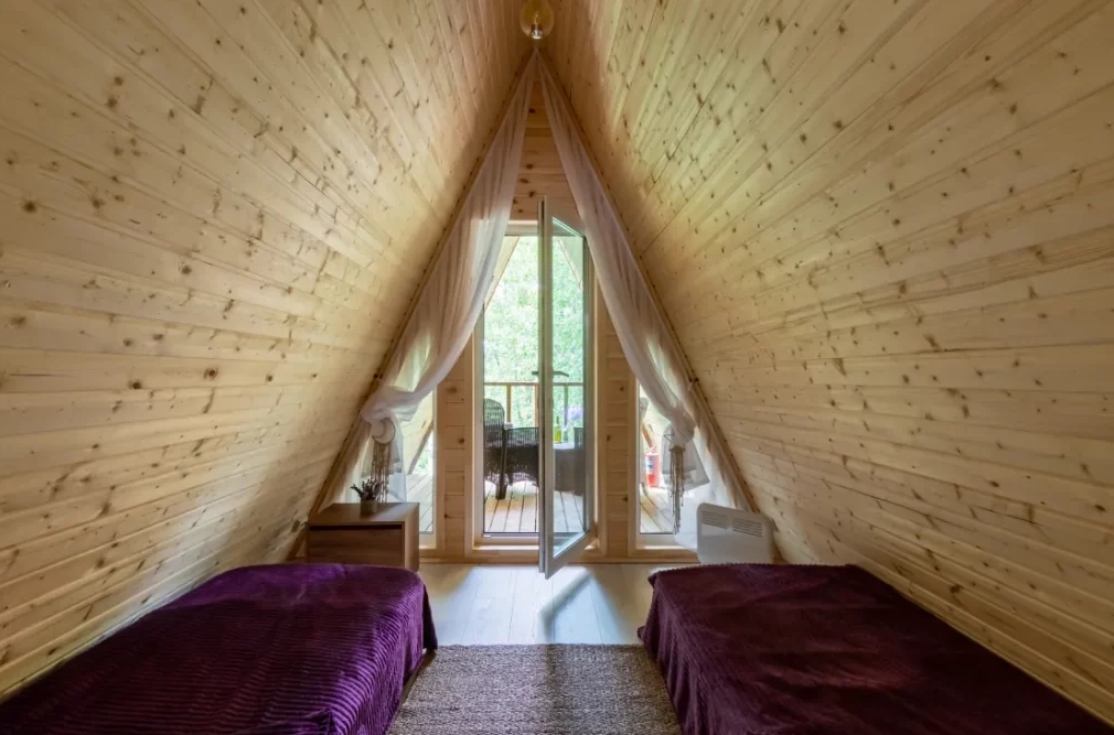 - Вторая с двумя одноместными кроватями, которые можно сдвинуть. Здесь есть балкон с видом на лес.
