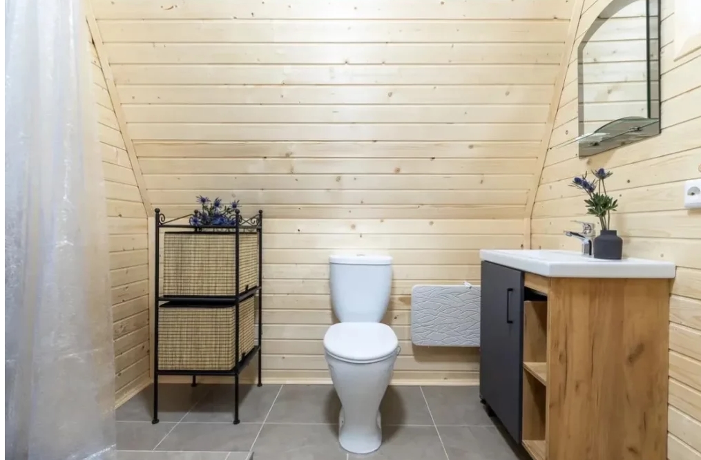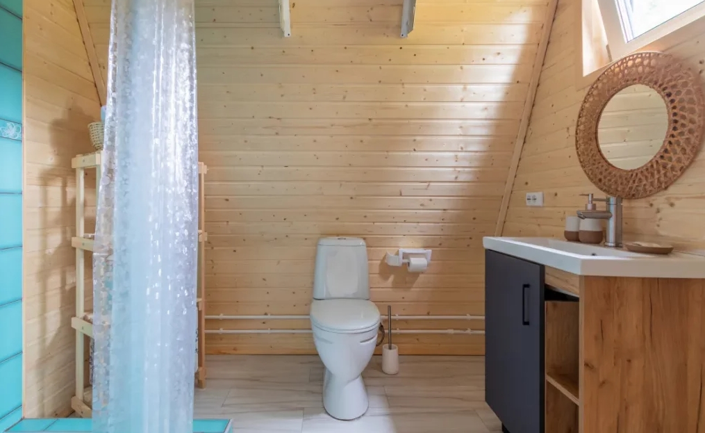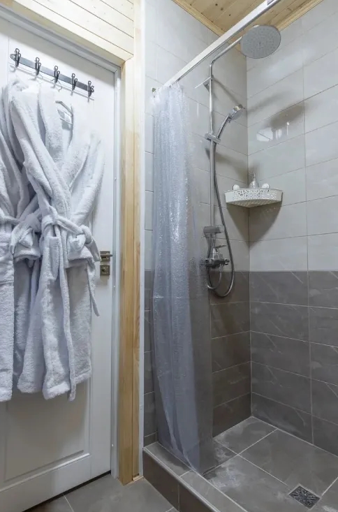 Санузел и душевая с горячей водой находятся в шале. Здесь есть все для личной гигиены: гель для душа, фен и белоснежные полотенца.