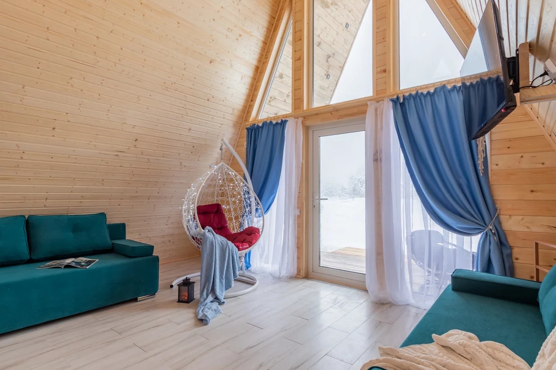 В гостиной можно посмотреть Смарт ТВ на мягком диване или в подвесном коконе.