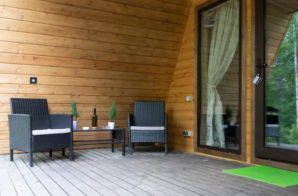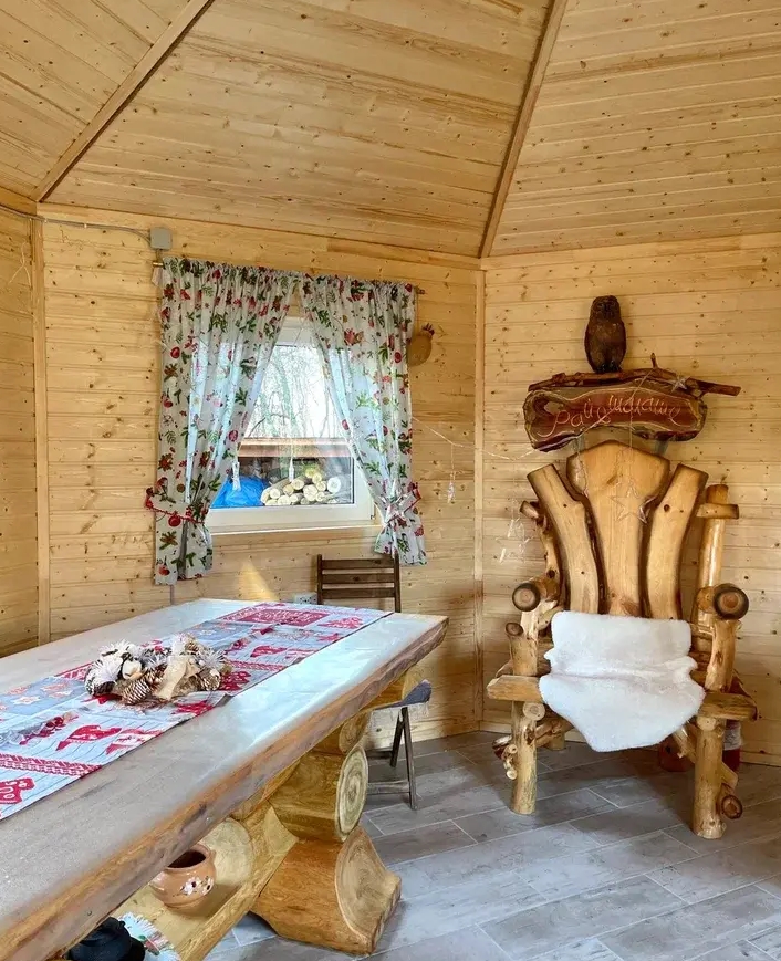 Пообедать можно прямо на террасе, где расположены кресла со столиком и диванчик, или прямо в домике за столом с мягкими и удобными креслами.