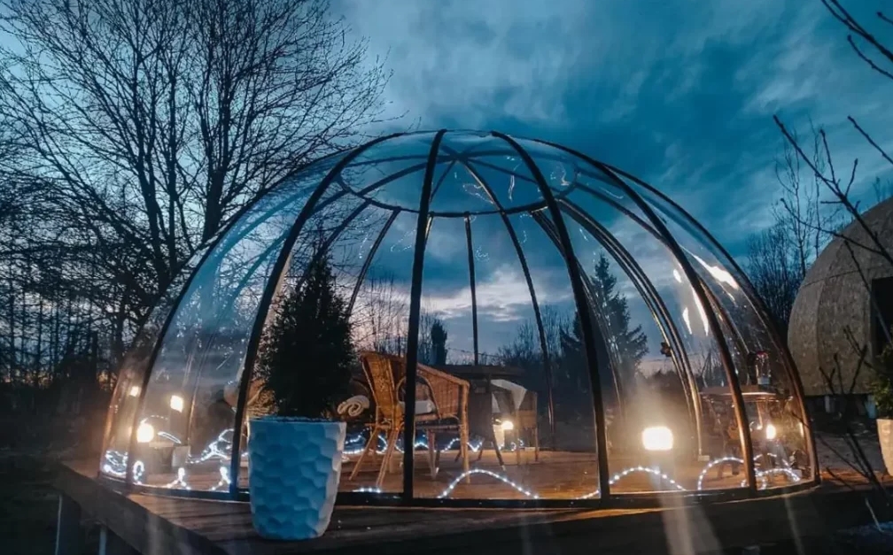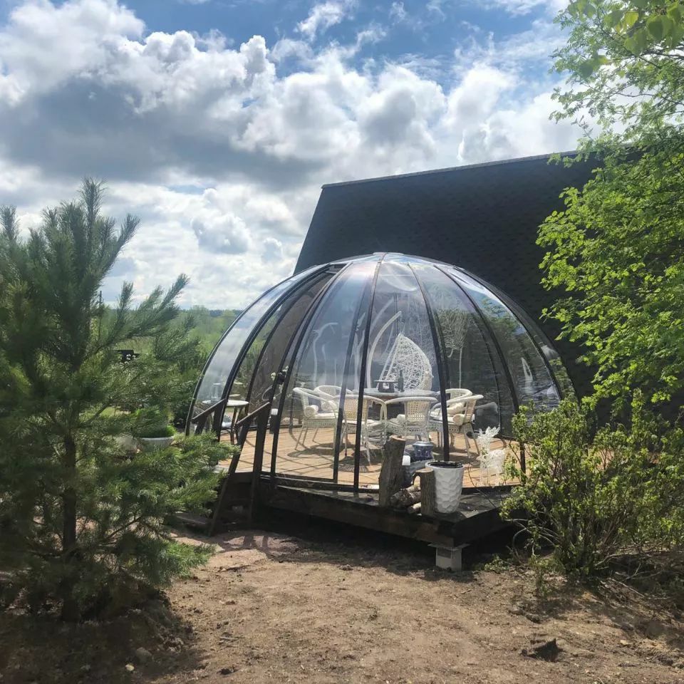- Купольная прозрачная беседка в ней комфортно разместятся 6—8 человек. Красивый интерьер с круглым столом и плетеными стульями поможет создать приятную атмосферу для отдыха. Через прозрачные стенки беседки можно любоваться природой и небом, наблюдать за проливным дождем и за закатом.