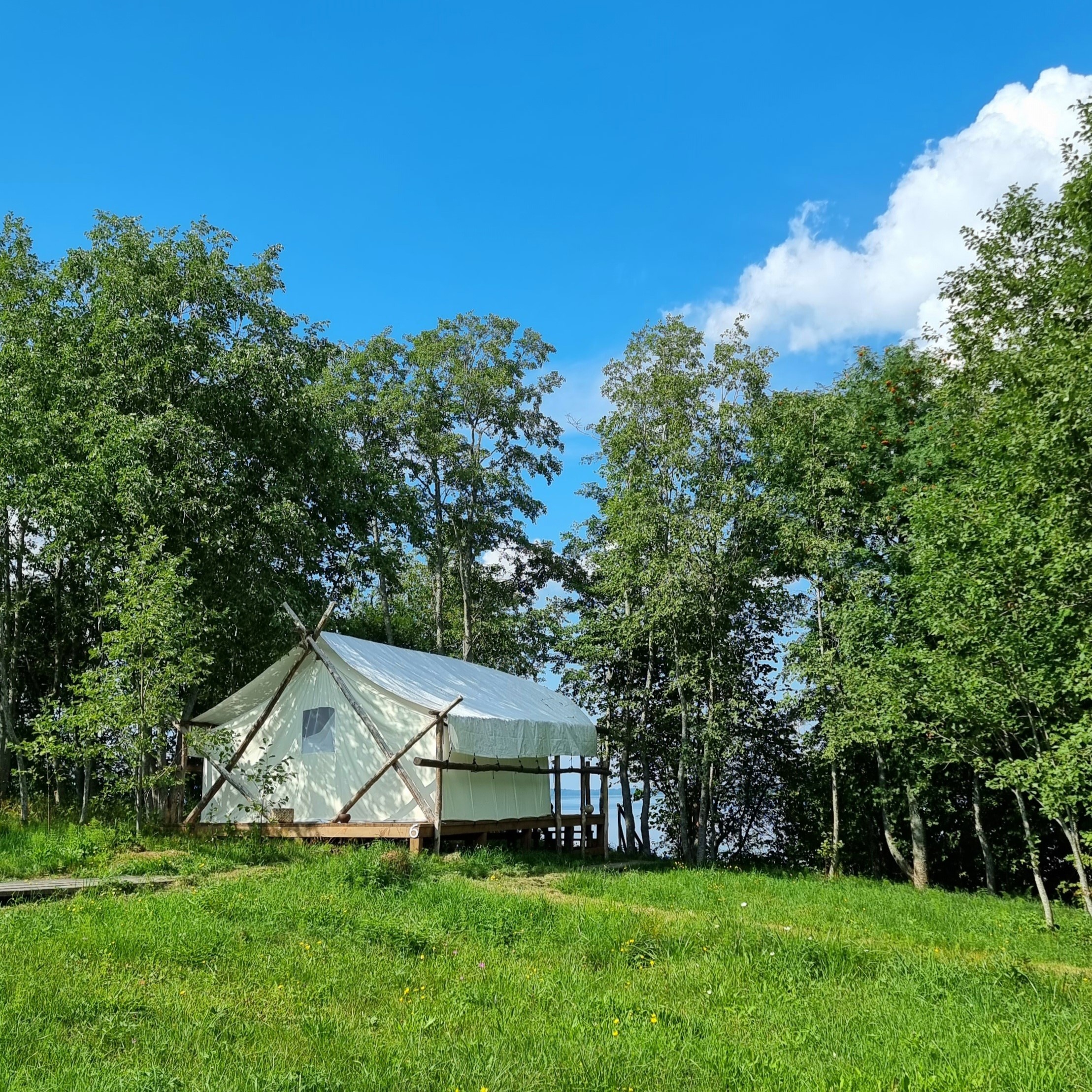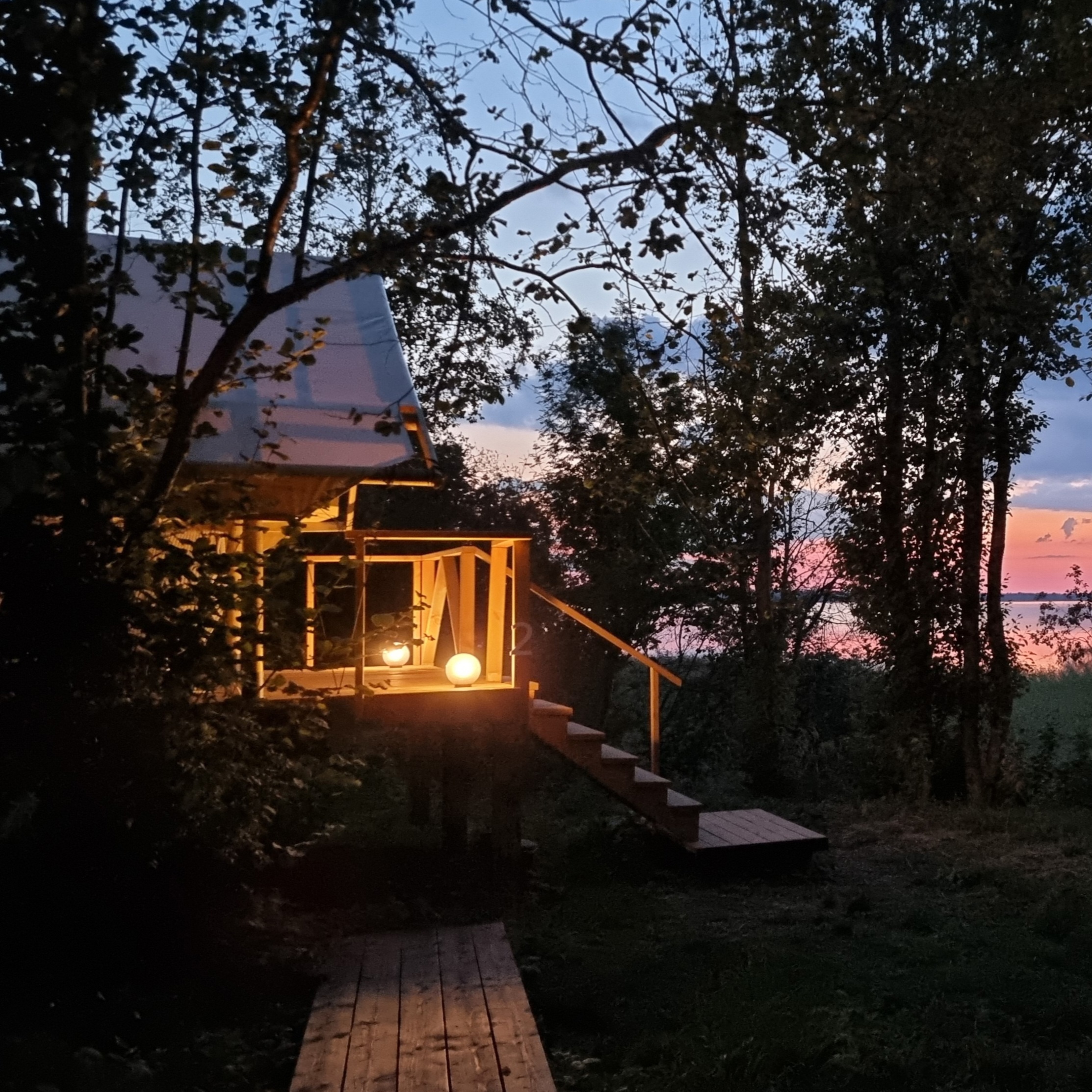Стоящая на возвышенности палатка с видом на озеро и закат, со спуском к озеру