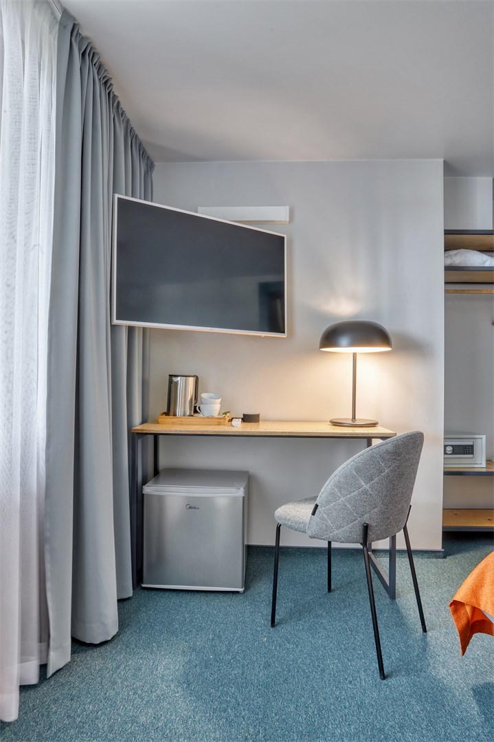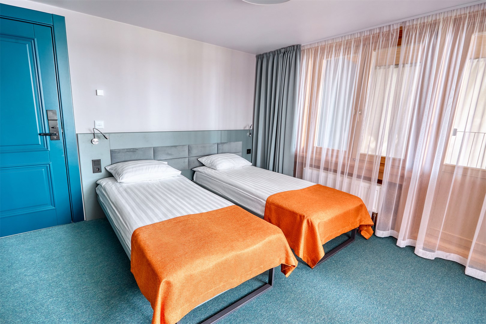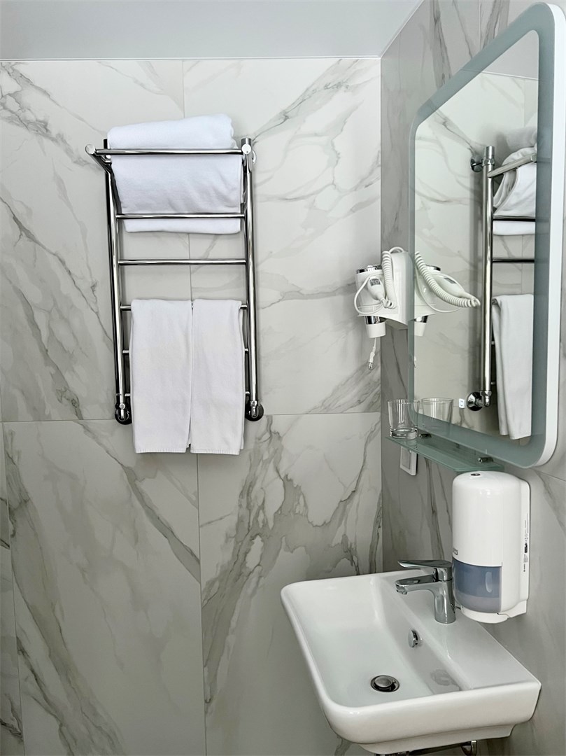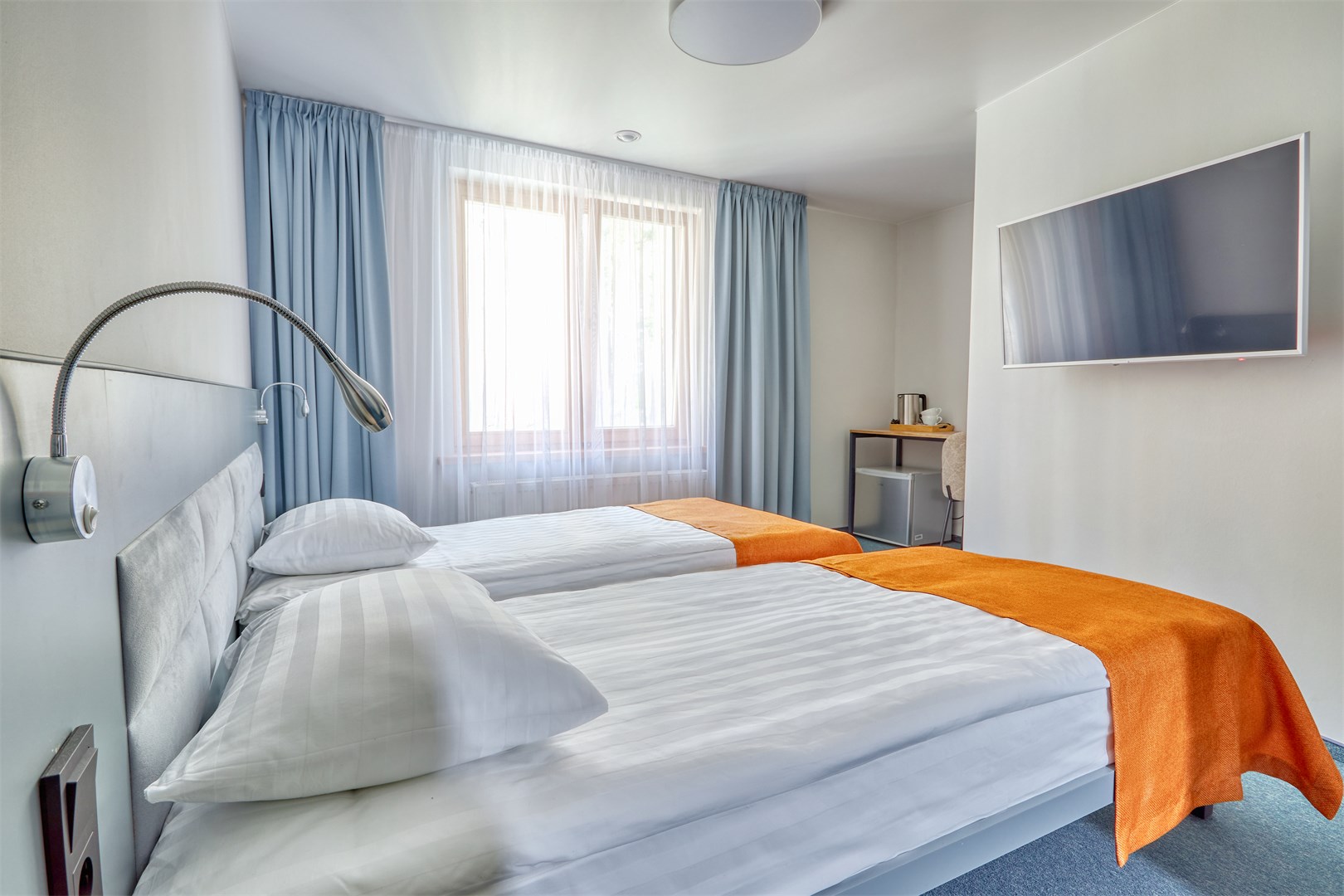 Стильный и современный однокомнатный номер. В номере две кровати 90*200 см или одна кровать 180*200 см, телевизор, мини холодильник, рабочий стол, ванная комната с душевой кабиной/ ванной и косметическими средствами, фен, тапочки, халаты, полотенца.
