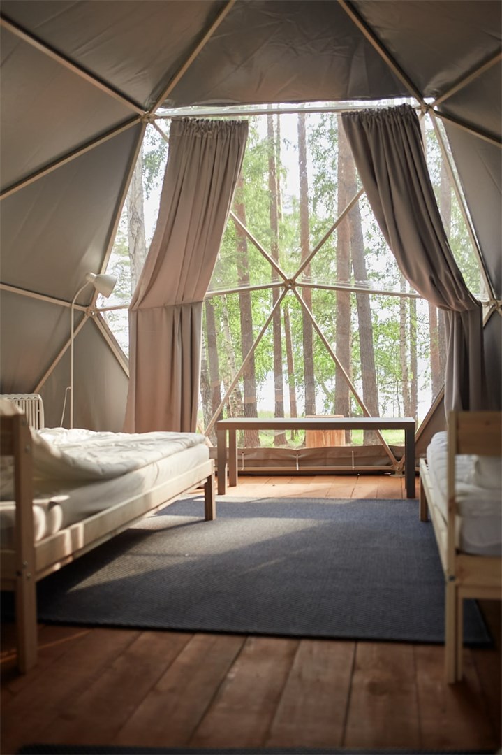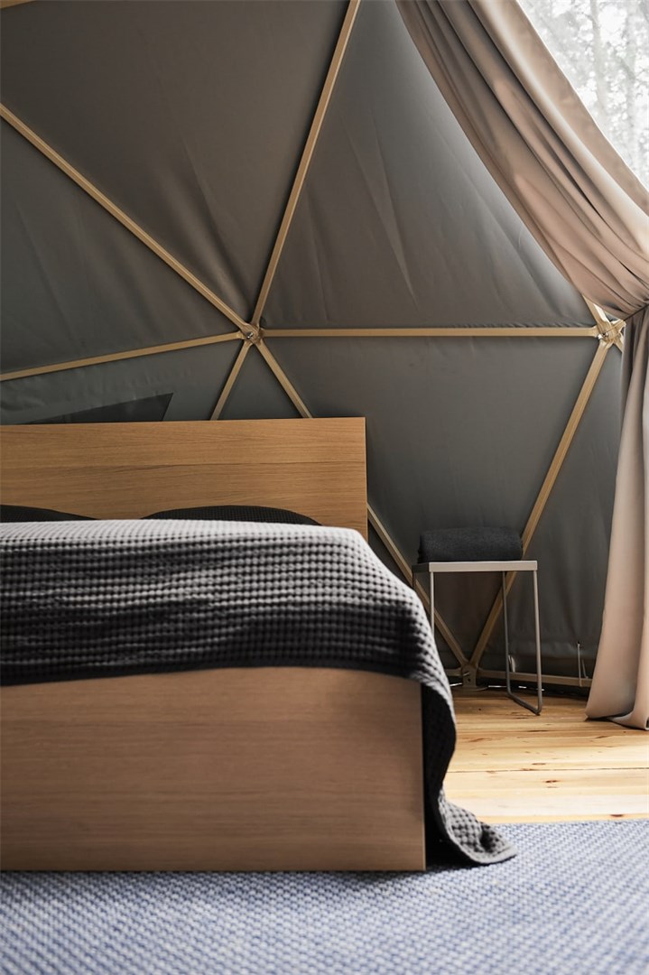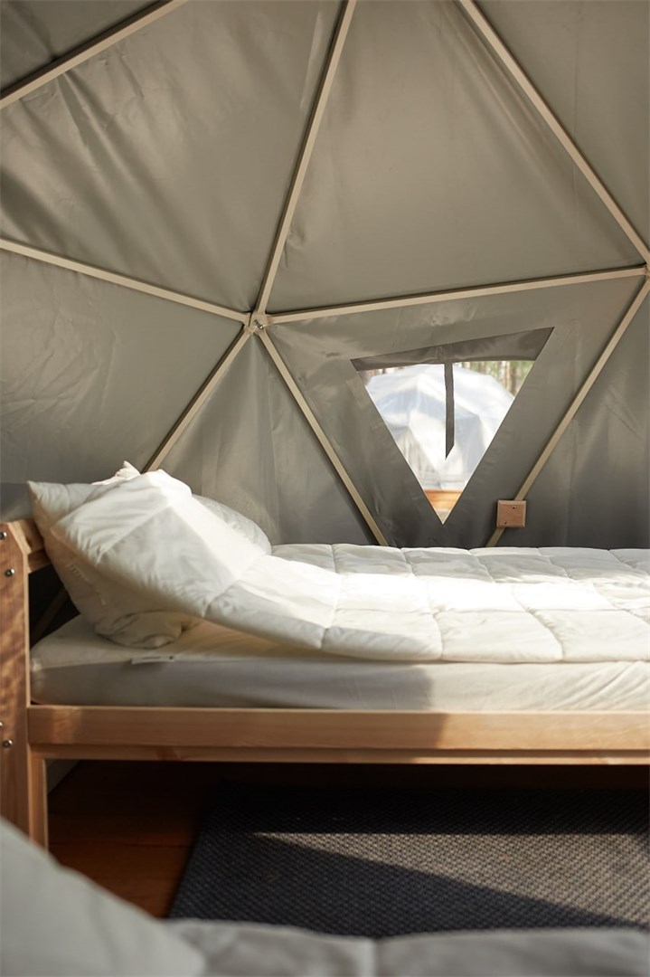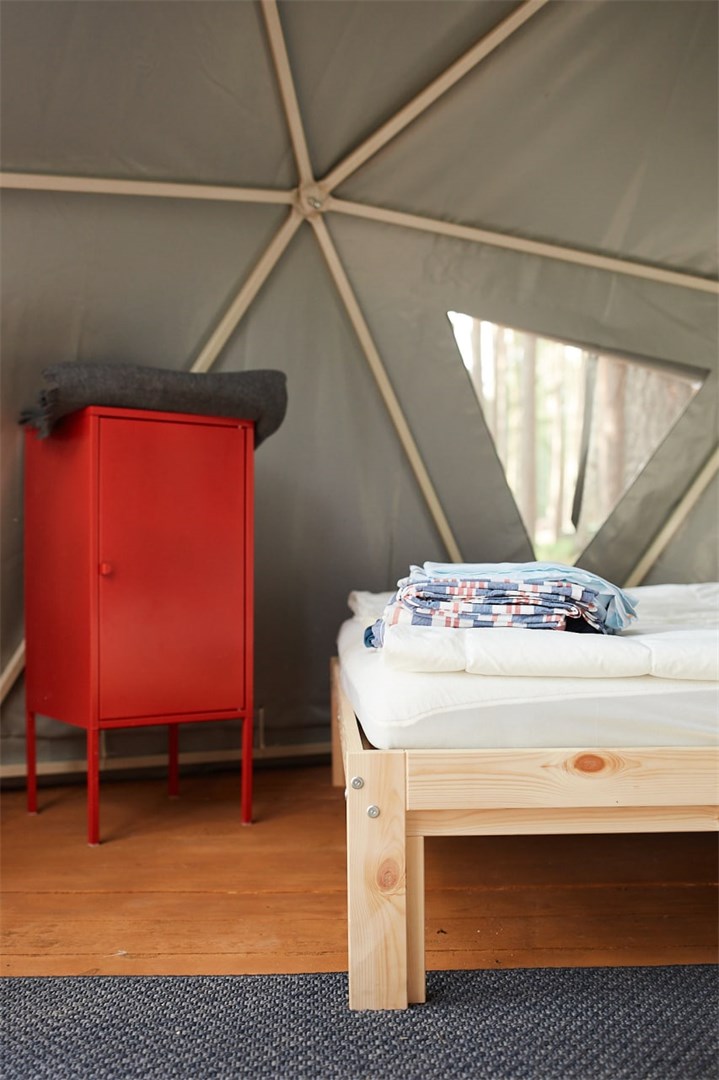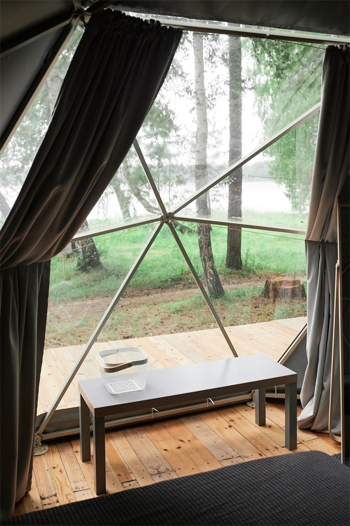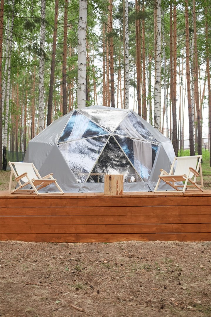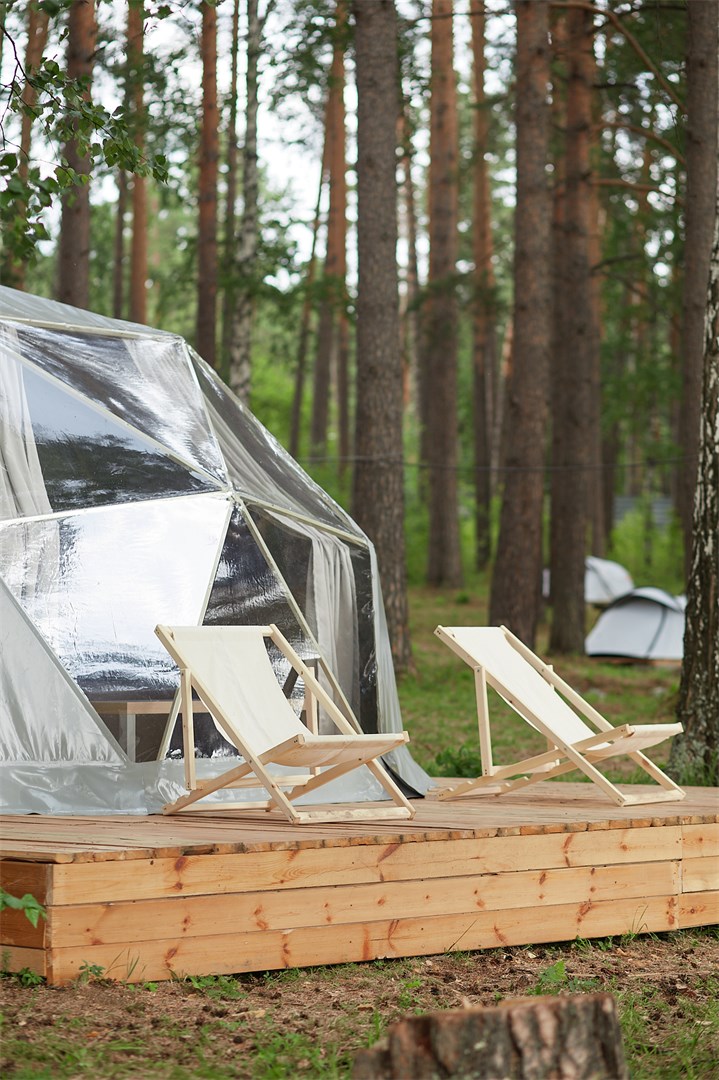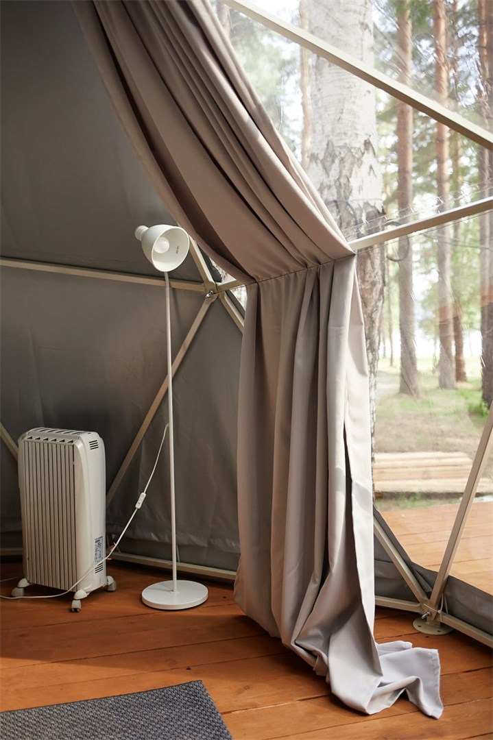 Глэмпинг стандарт - это комфорт гостиничного номера с возможностью отдыха на природе. Глэмпинг оснащен розетками, инфракрасным обогревателем, вентилятором, двумя кроватями 140х200, тумбой, напольной вешалкой и журнальным столиком. На террасе имеются складные кресла-шезлонги.