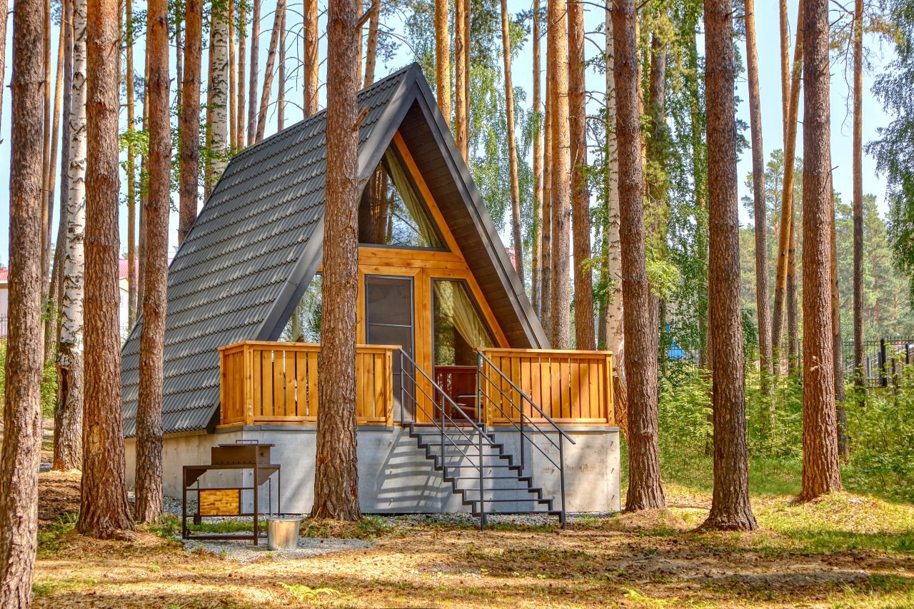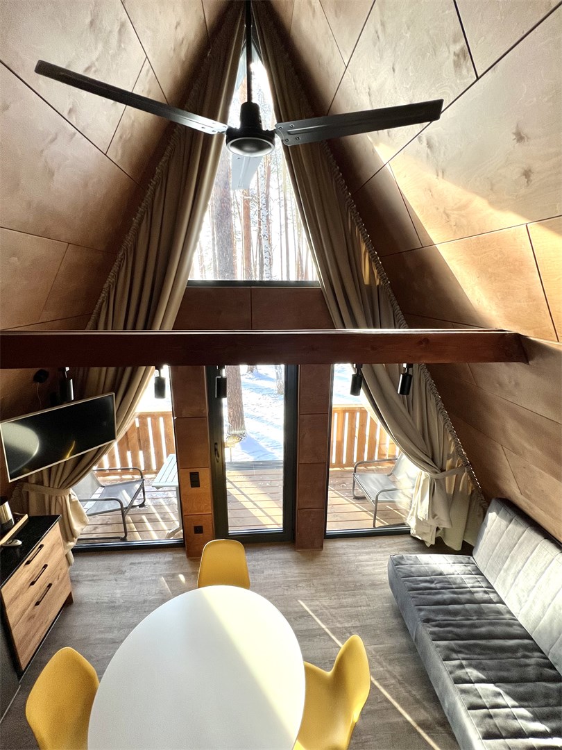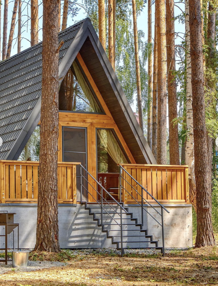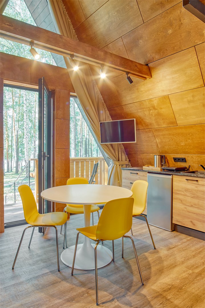 Отдельно стоящий современный двухуровневый номер "А-фрейм". В номере на втором уровне одна кровать 180*200 см. На первом уровне телевизор, мини-кухня с холодильником, обеденная зона, диван, ванная комната с душевой кабиной и косметическими средствами, фен, тапочки, халаты и полотенца.