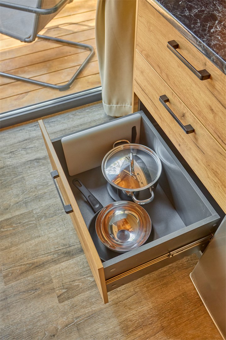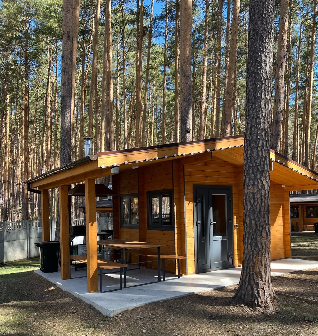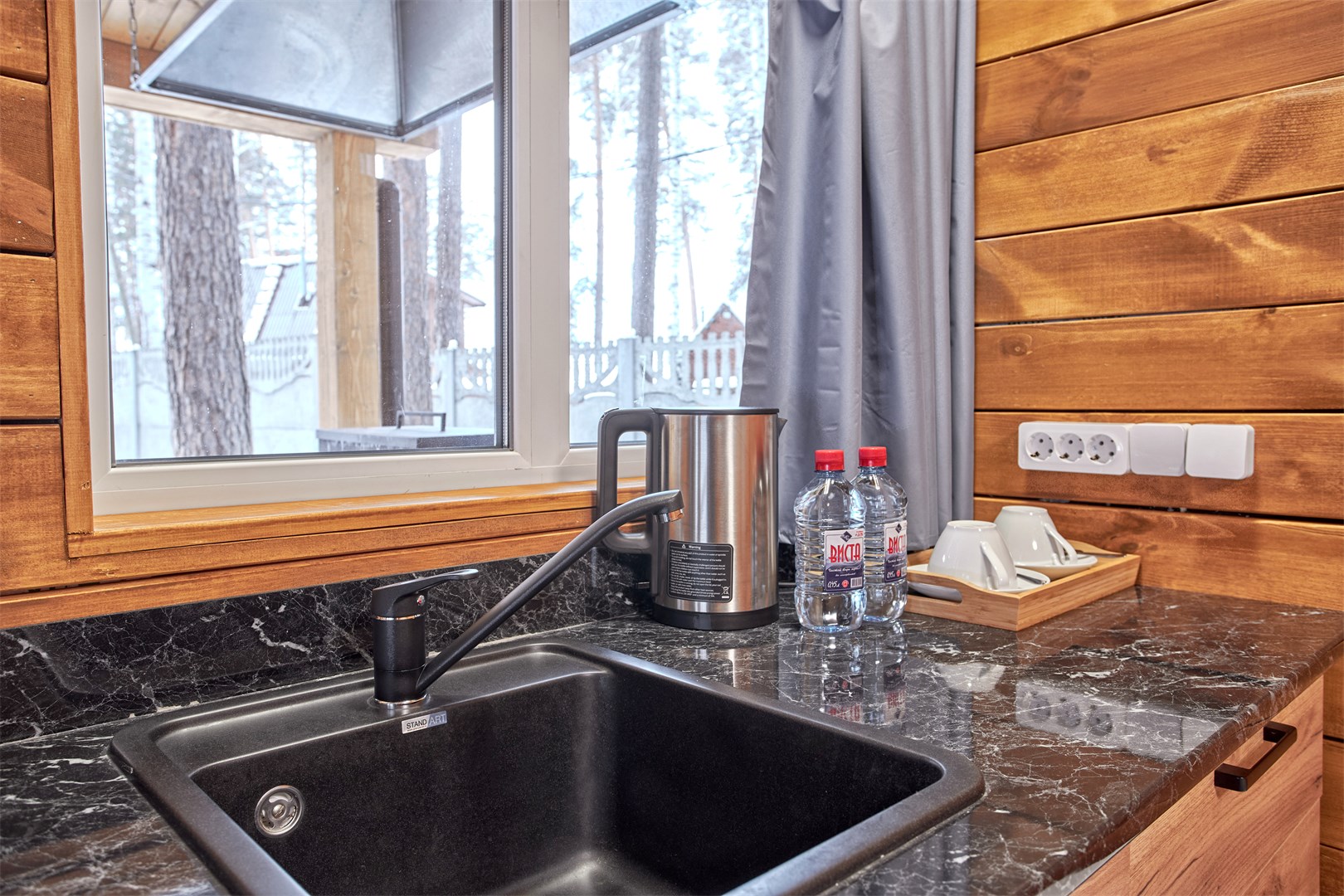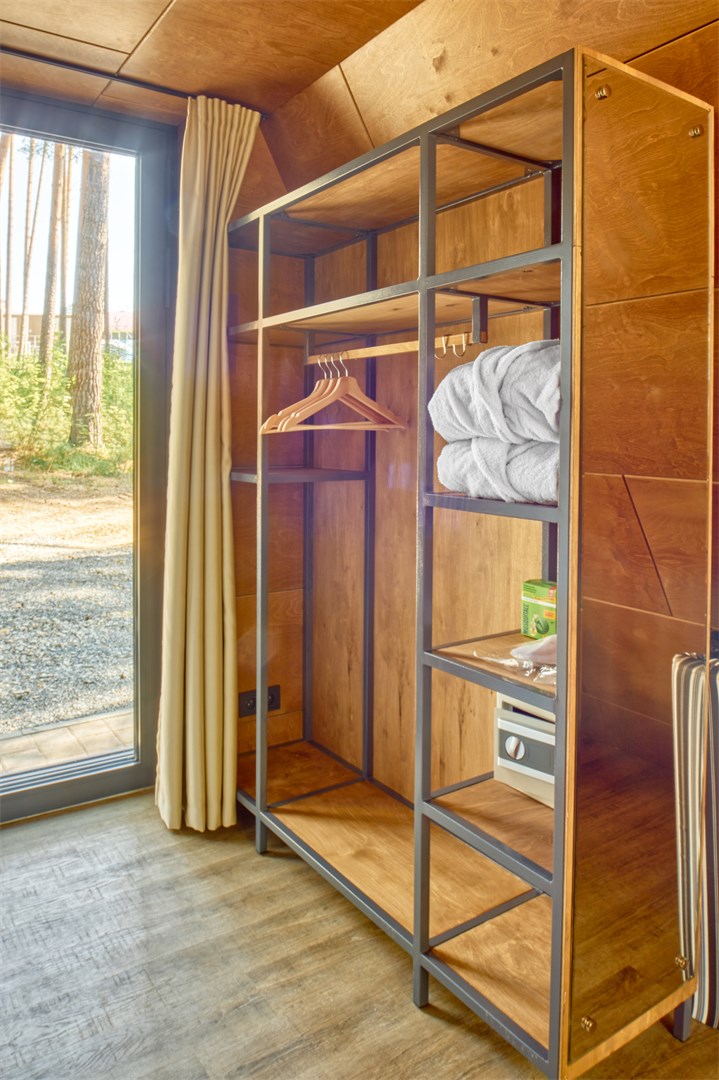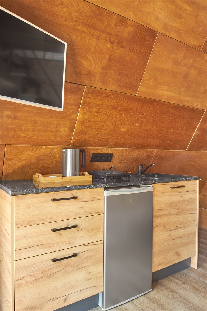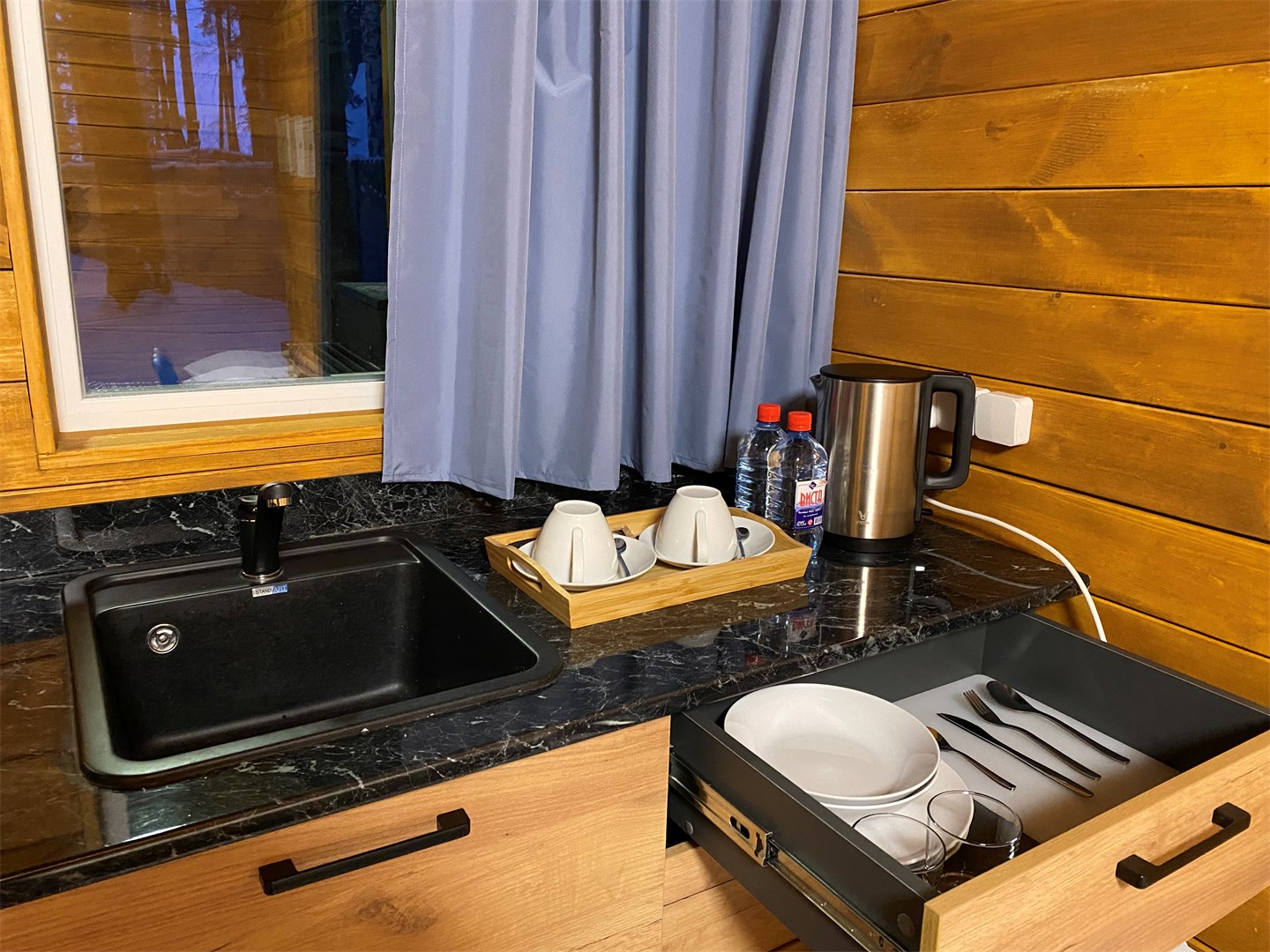 Глэмпинг оснащен кроватью 140х200, кухонным уголком с раковиной и мини холодильником. Имеется центральное отопление. Гостям предоставляются халаты и полотенца, есть необходимая посуда и столовые приборы. Удобная терраса со своей мангальной зоной.