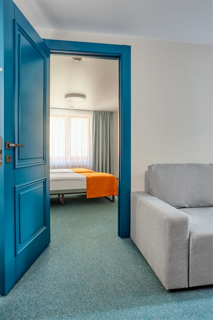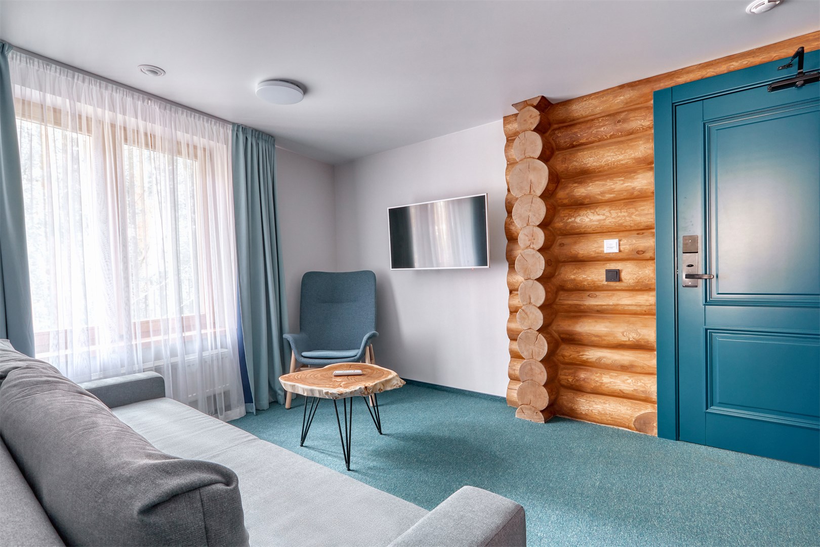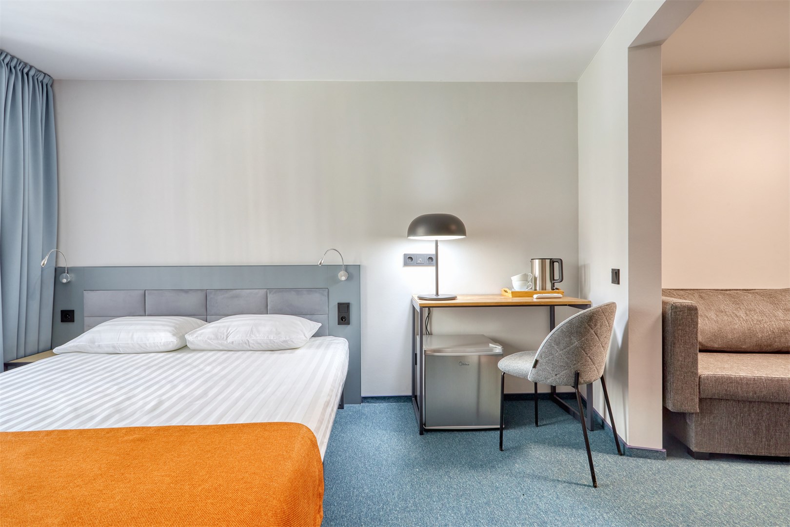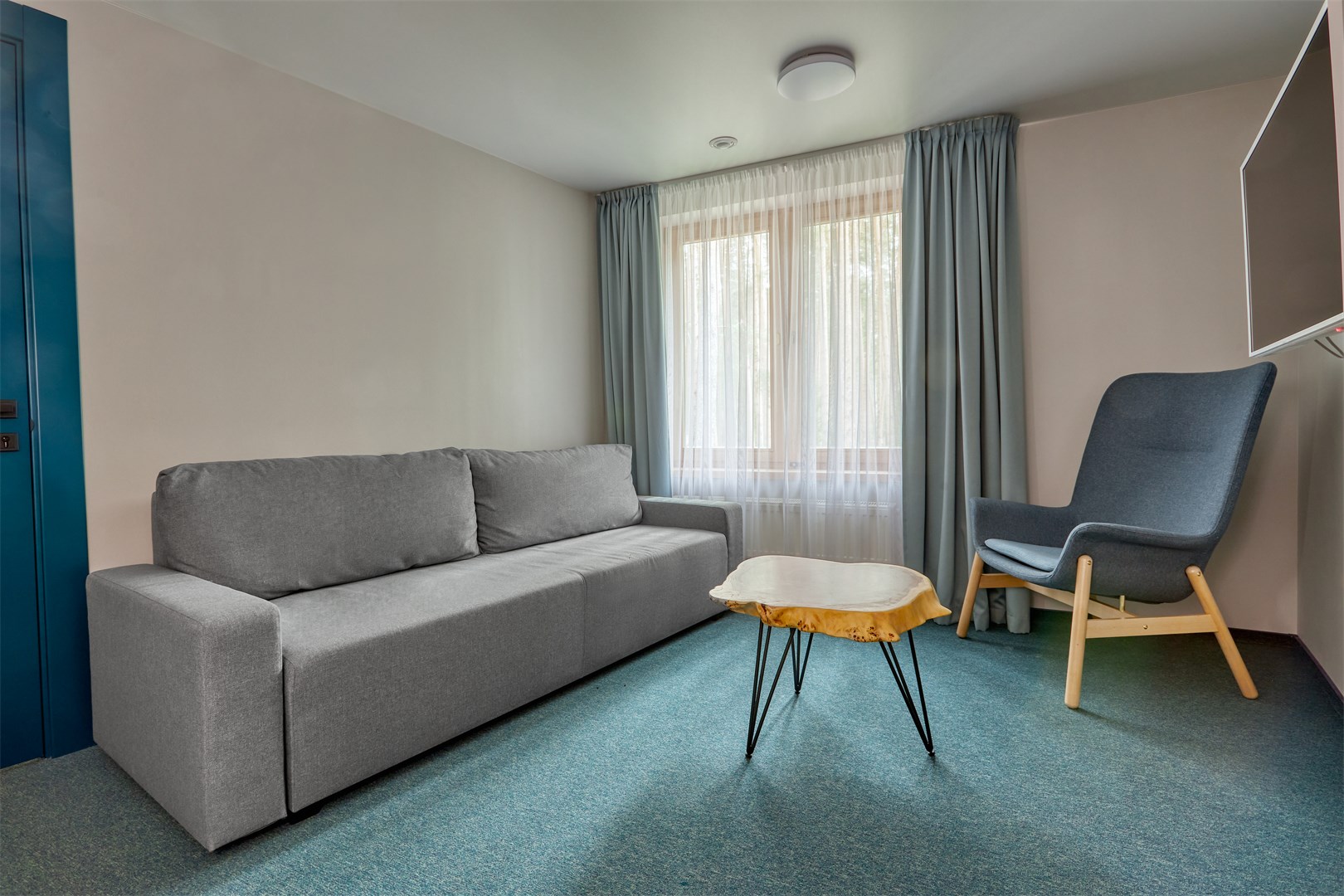 Стильный и современный двухкомнатный номер. В номере одна кровать 180*200 или две кровати 90*200, раскладной диван, телевизор, мини-холодильник, рабочий стол, ванная комната с душевой кабиной и косметическими средствами, фен, тапочки, халат и полотенца.