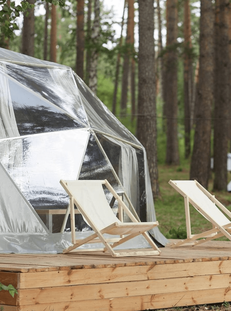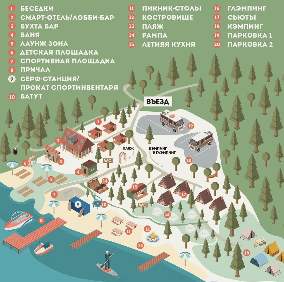Территория активного отдыха БЕРЕГ — это площадка для комплексного активного отдыха на свежем воздухе. Инфраструктура Берега продумана так, чтобы можно было спокойно приехать на уикенд, выбрав один из типов размещения: глэмпинг (шатер вместимостью до пяти человек), смарт-отель или сьют (домик А-фрэйм).