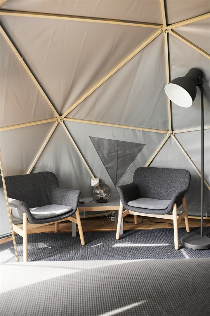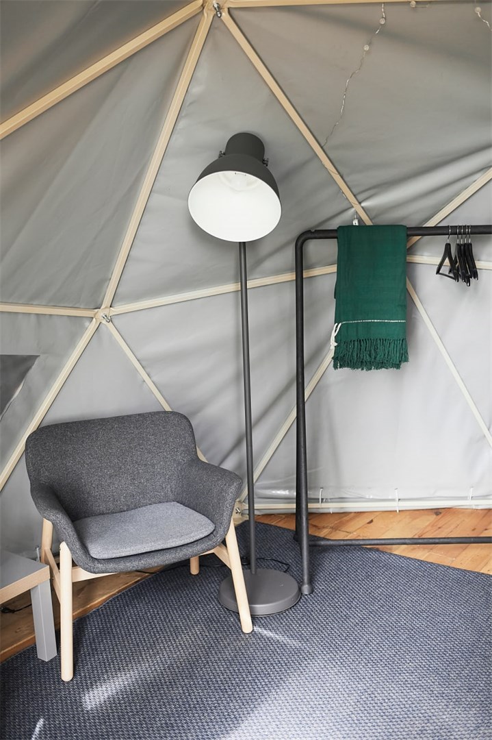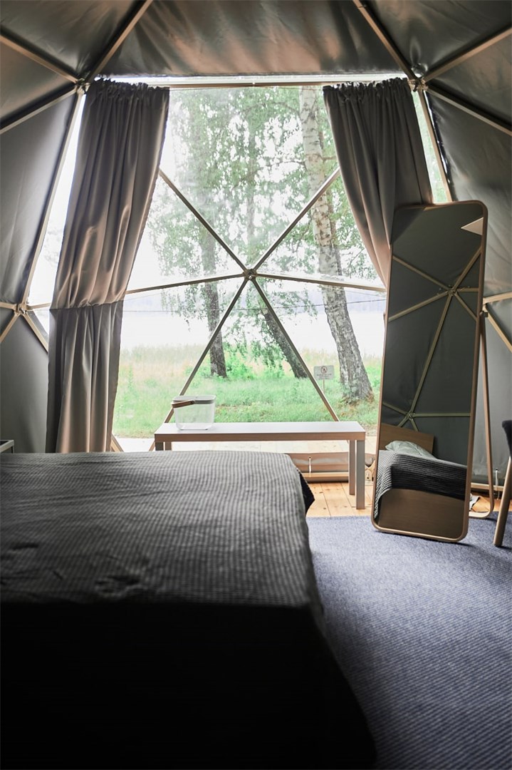 Глэмпинг повышенной комфортности оборудован одной кроватью 160*200, инфракрасным обогревателем, розетками, напольным зеркалом, мягкой зоной с журнальным столиком. На террасе имеются складные кресла-шезлонги.