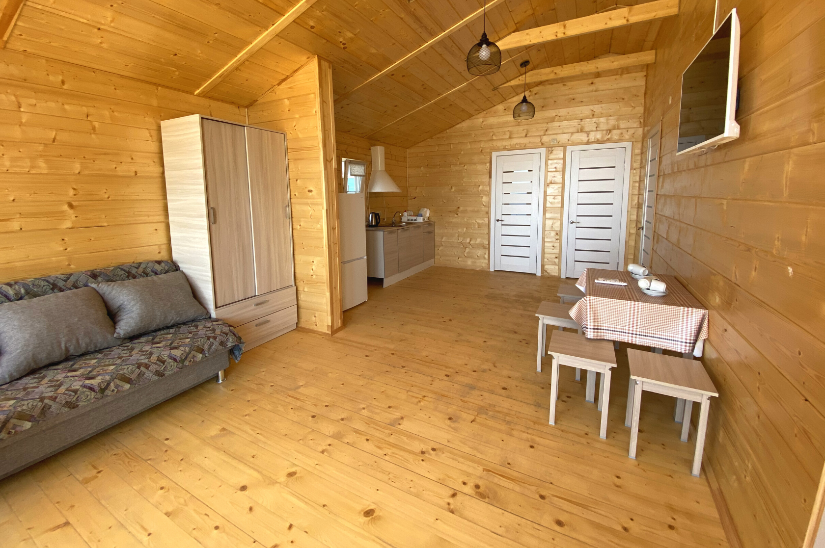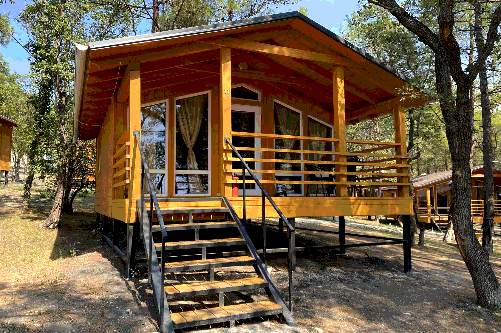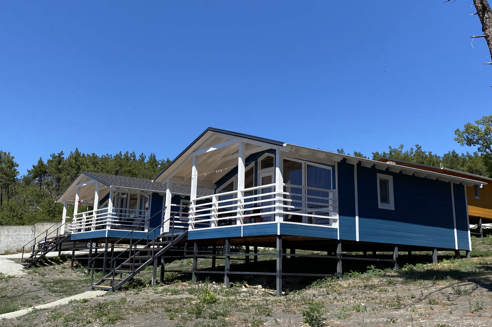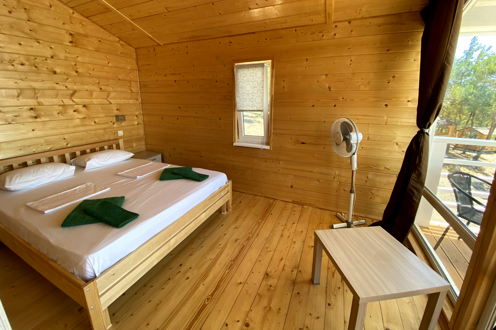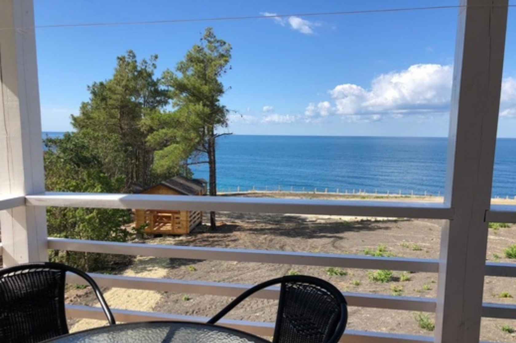 - Дома со всеми удобствами (душ с горячей водой, фен, туалет, мини-кухня, посуда) + у каждого коттеджа есть терраса с мебелью