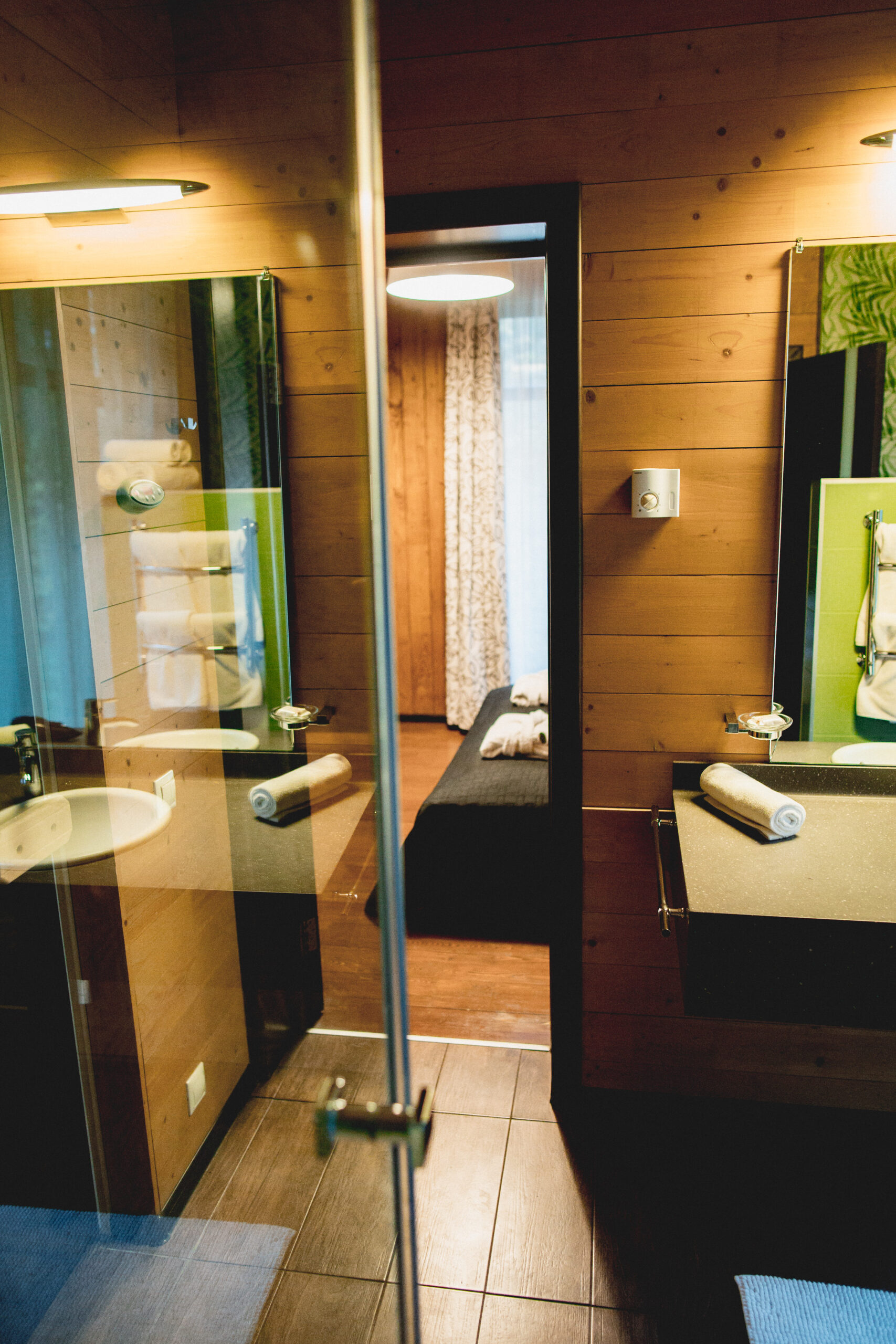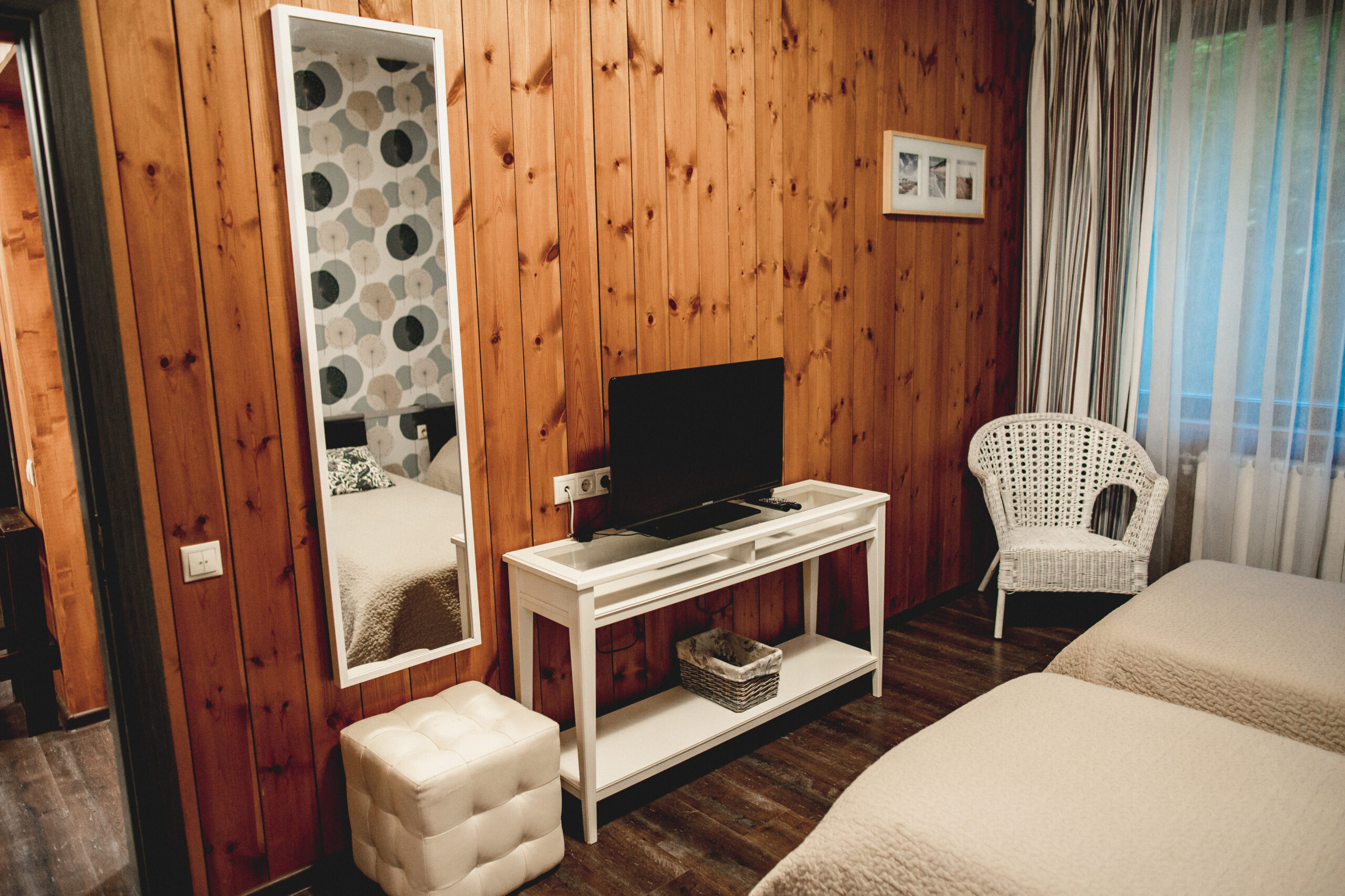 3 спальни с двуспальными кроватями и 2 спальни с двумя раздельными кроватями на первом и втором этажах. Кровати можно раздвинуть по предварительному запросу. В каждом из номеров есть своя ванная комната с санузлом, умывальником и душевой кабиной;