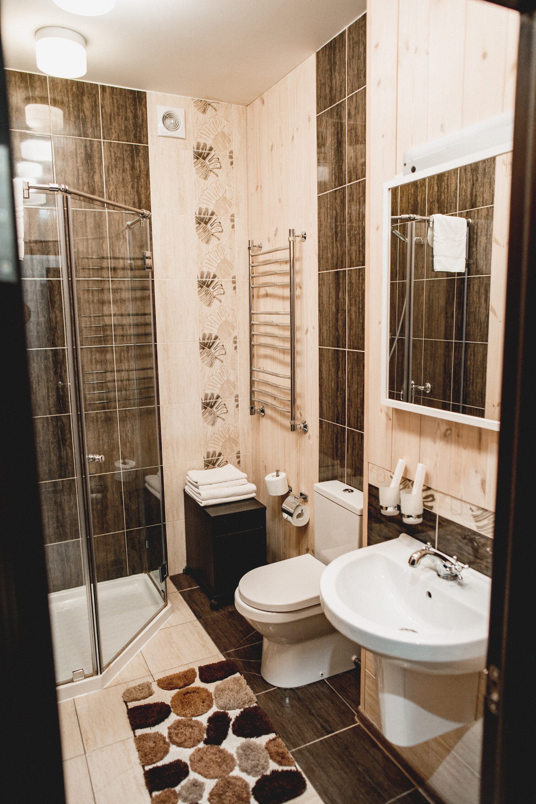 ванная комната с душевой кабиной, умывальником и туалетом;