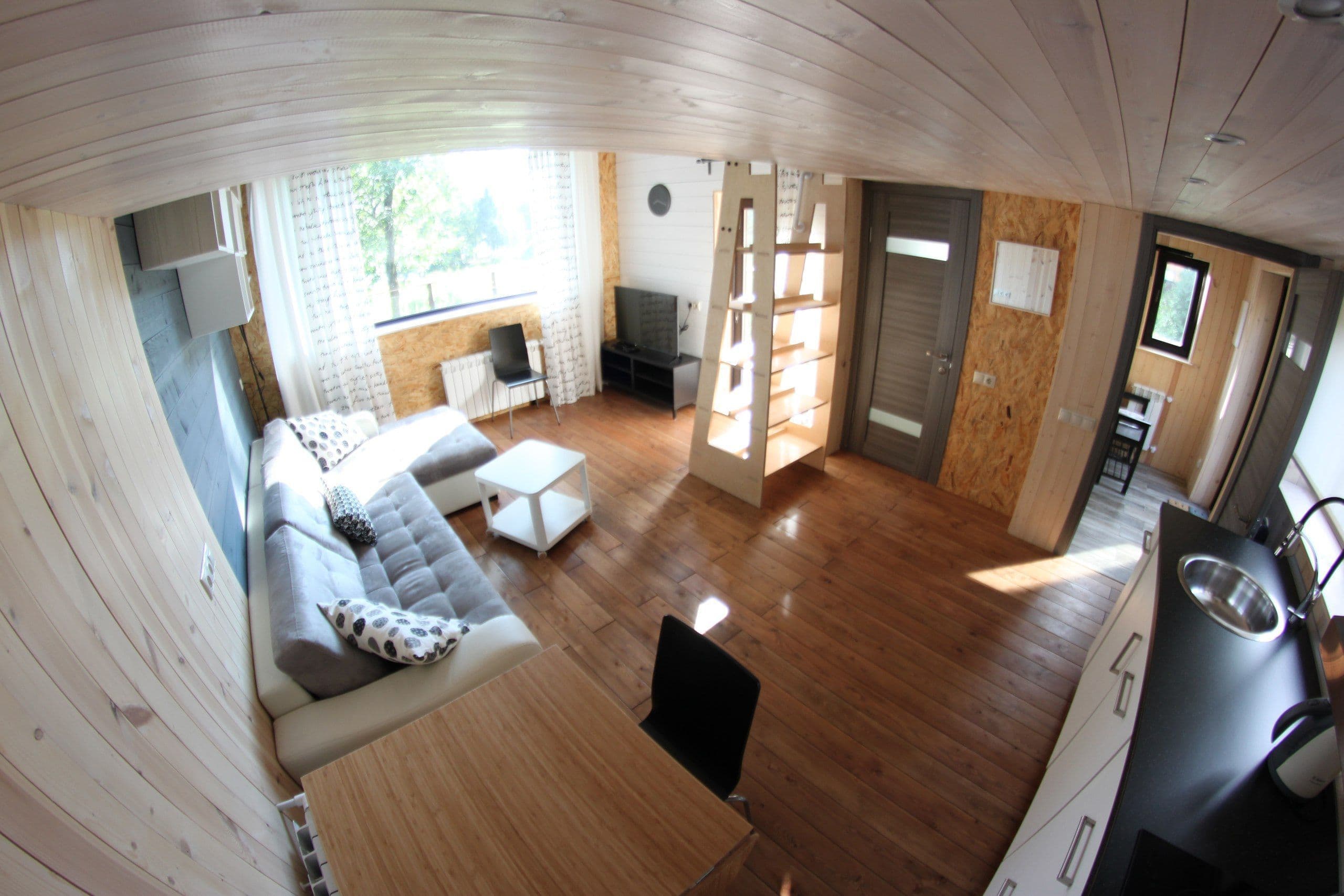 гостиная с двуспальным диваном, столом и полноценной кухней. Она укомплектована мойкой, варочной панелью, СВЧ и набором посуды, а также посудомоечной машиной, электрическим чайником и холодильником. В коттедже стоит бутыль питьевой воды 19 л с ручной помпой. В каждом коттедже имеется капсульная кофемашина;