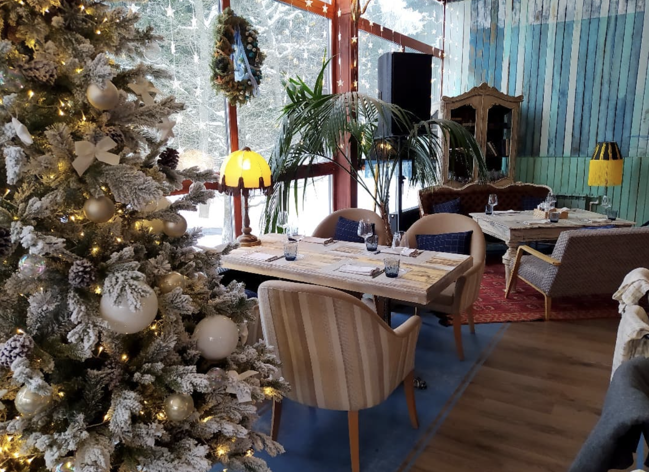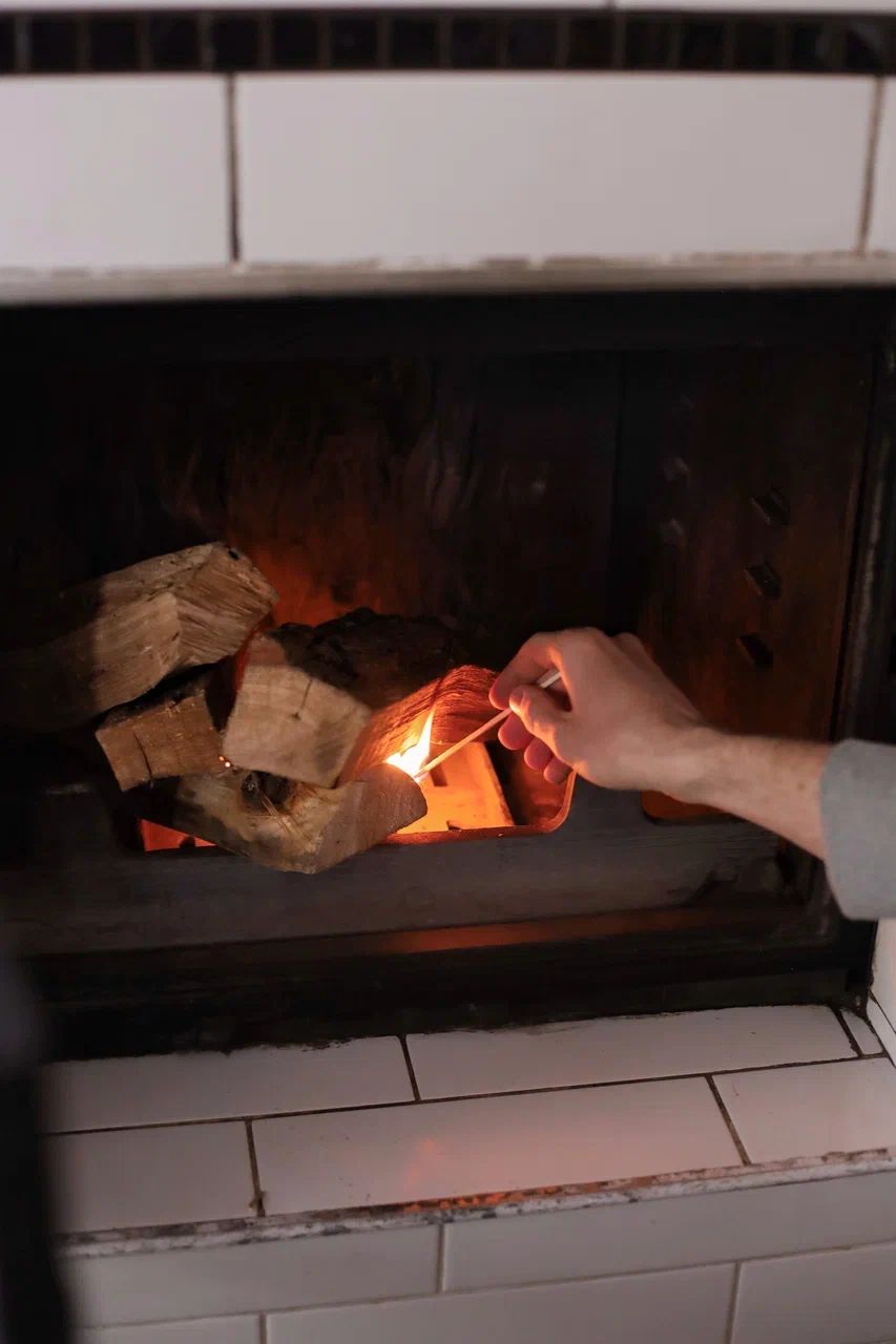 гостиная с двуспальным диваном, большим столом на 8 персон и дровяным камином;