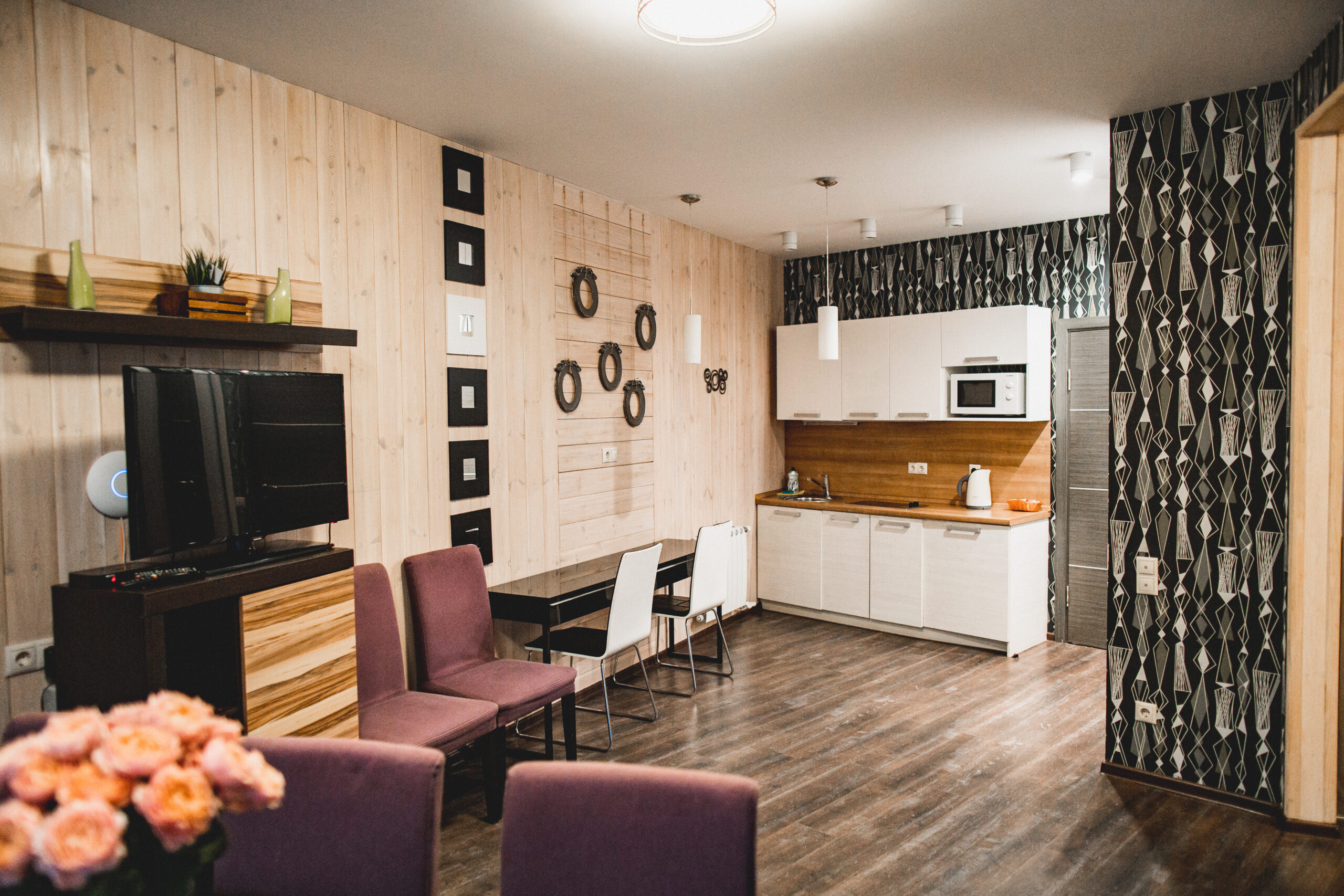 гостиная с большим столом на 10 персон, электрическим чайником и холодильником;