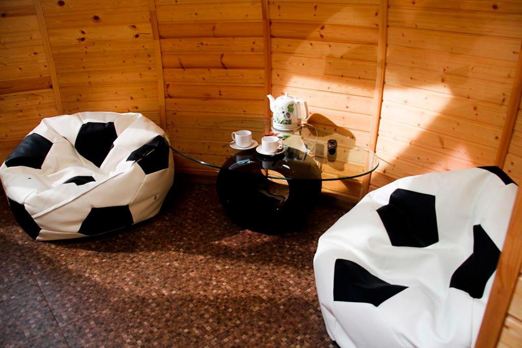 - Стеклянный стол и два кресла мешка в форме футбольных мечей;