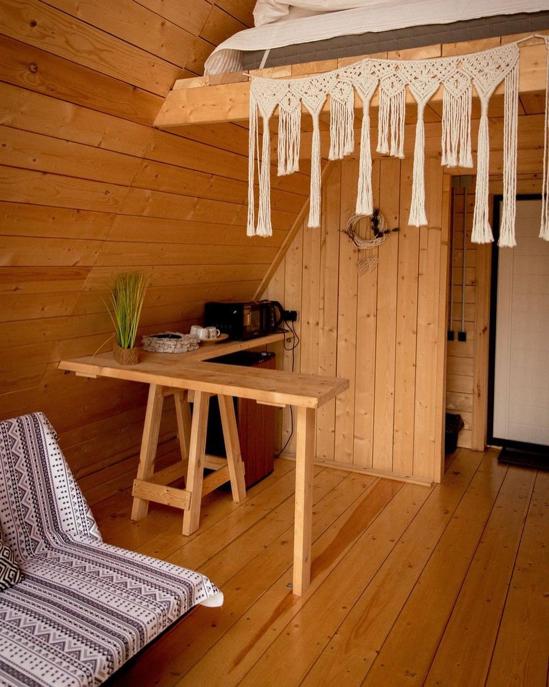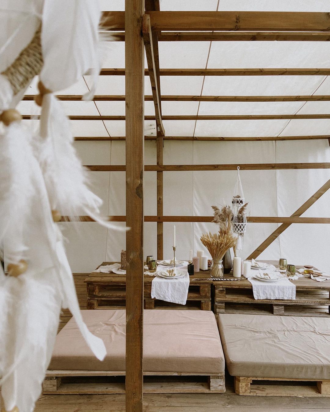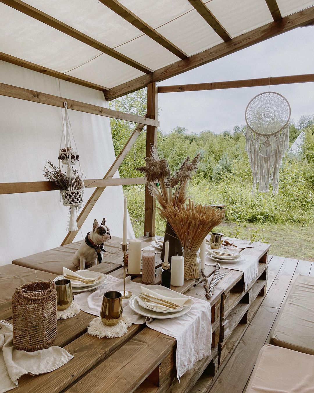 — мебель в шатрах из свежих брусьев, последний штрих – множество с любовью подобранных деталей;