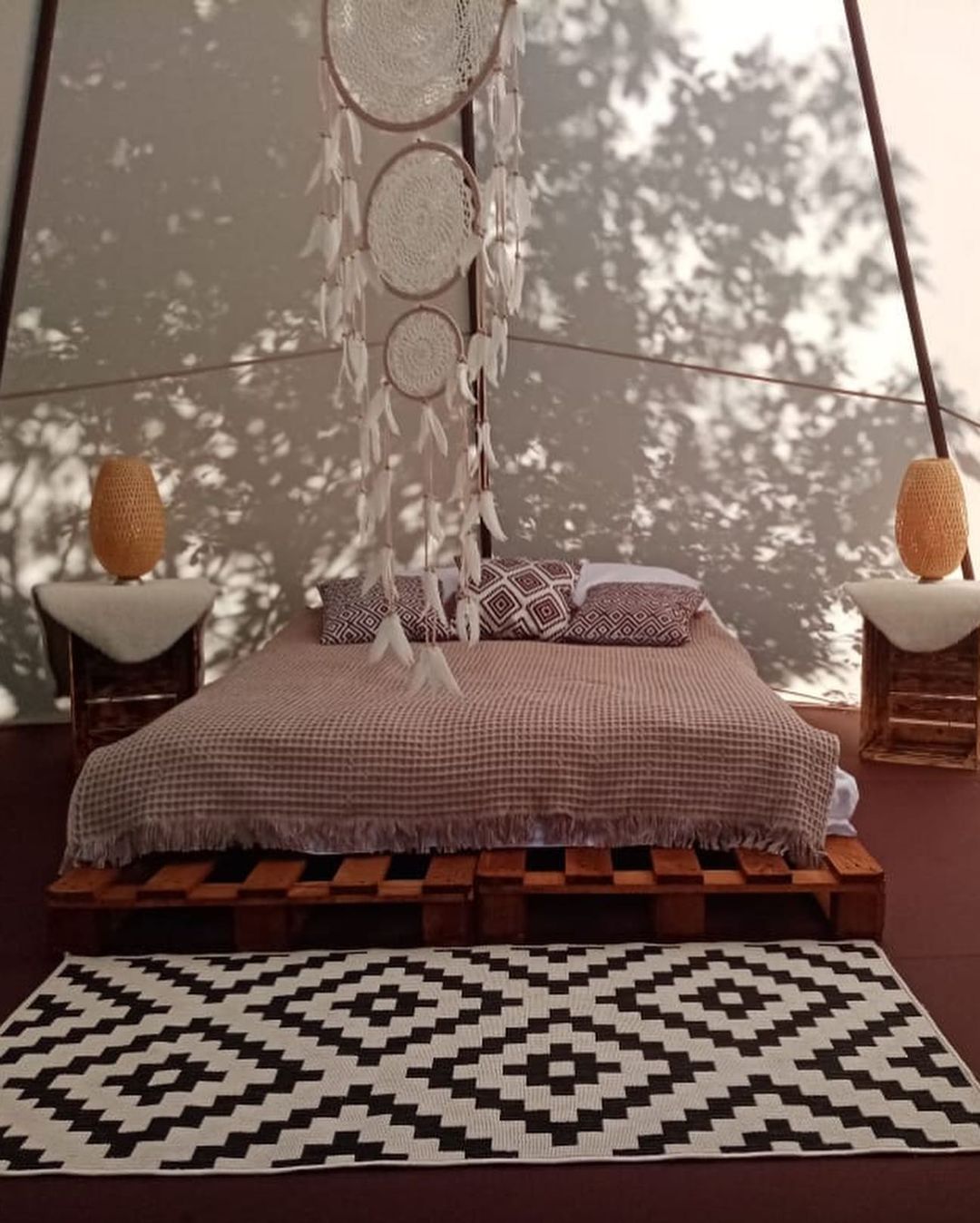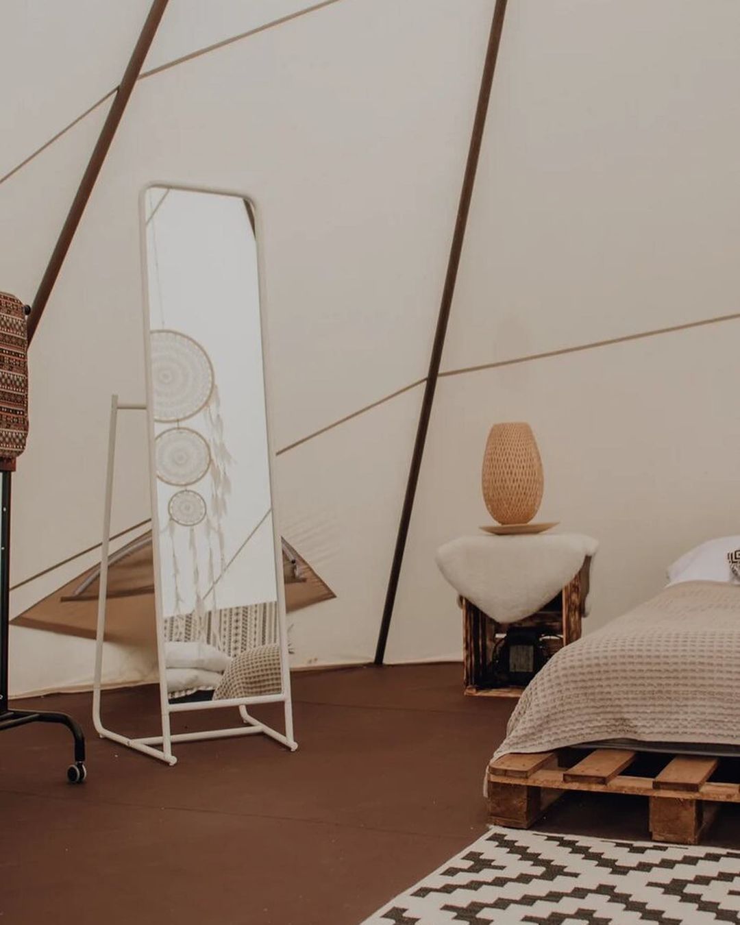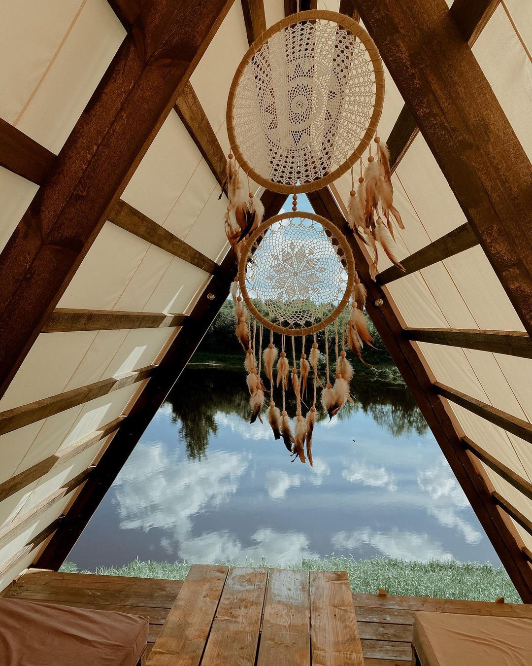 Все шатры и домики выполнены в минималистичном стиле бохо-шик с большим вниманием к деталям: фонари, ловцы снов, свечи и текстиль создают неповторимую атмосферу. На территории глэмпинга можно отдохнуть в лаунж-зоне с удобными креслами у каждого шатра, полежать в гамаке, уединиться в пространстве для медитации с видом на внутреннее озеро, провести время в шатре-гостинной.