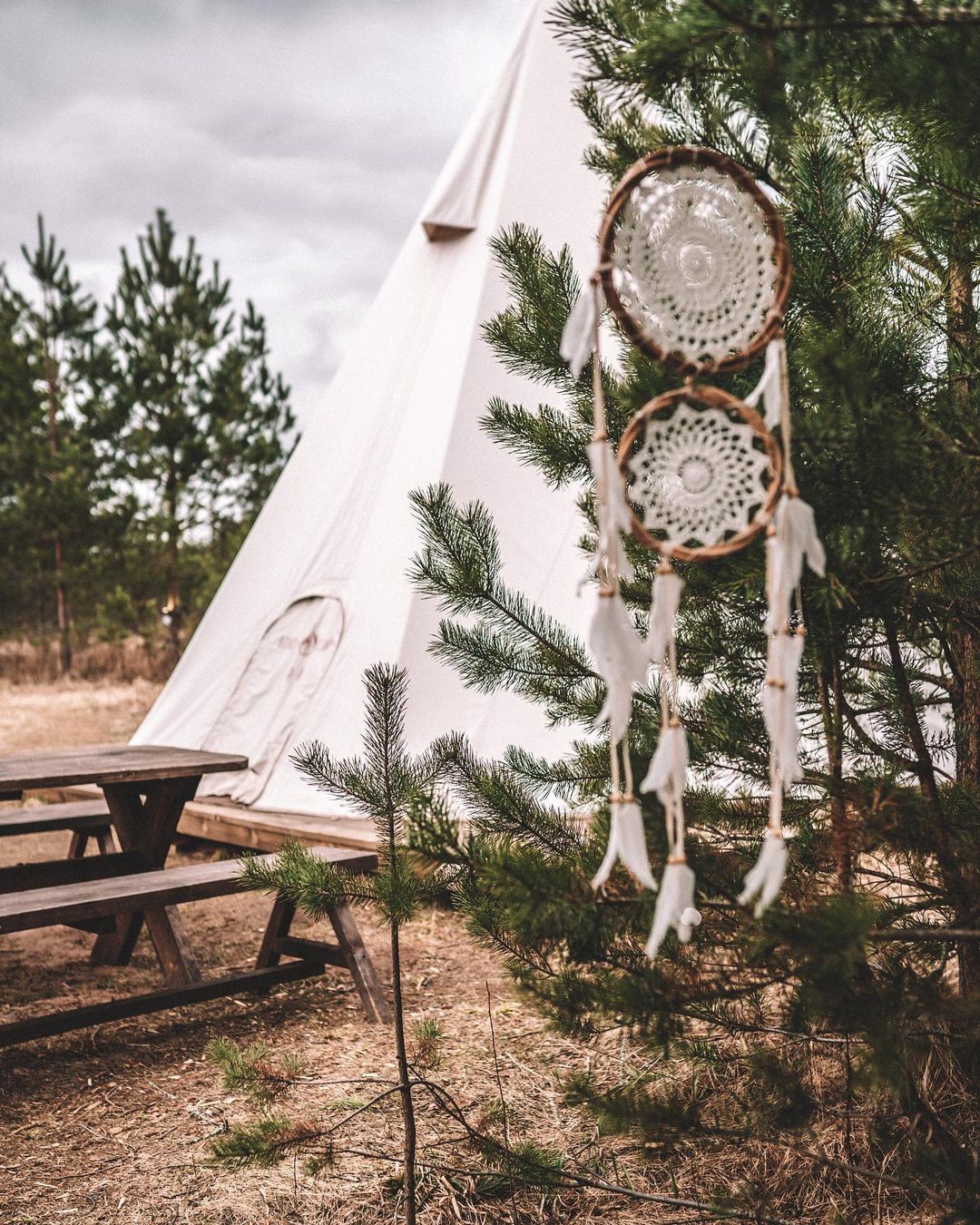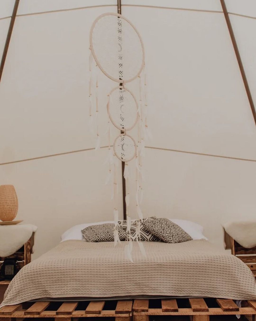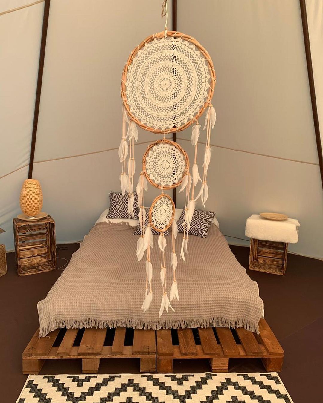 Все шатры и домики выполнены в минималистичном стиле бохо-шик с большим вниманием к деталям: фонари, ловцы снов, свечи и текстиль создают неповторимую атмосферу. На территории глэмпинга можно отдохнуть в лаунж-зоне с удобными креслами у каждого шатра, полежать в гамаке, уединиться в пространстве для медитации с видом на внутреннее озеро, провести время в шатре-гостинной.