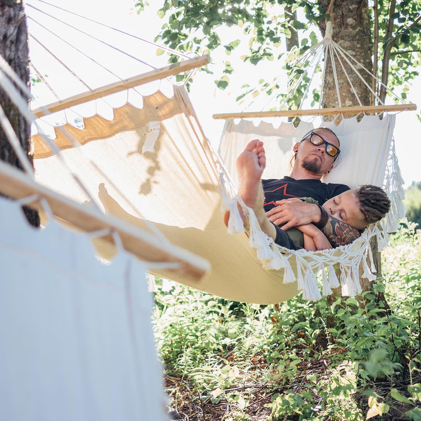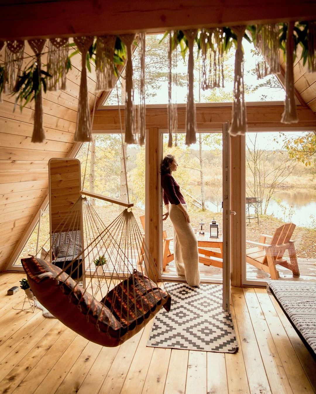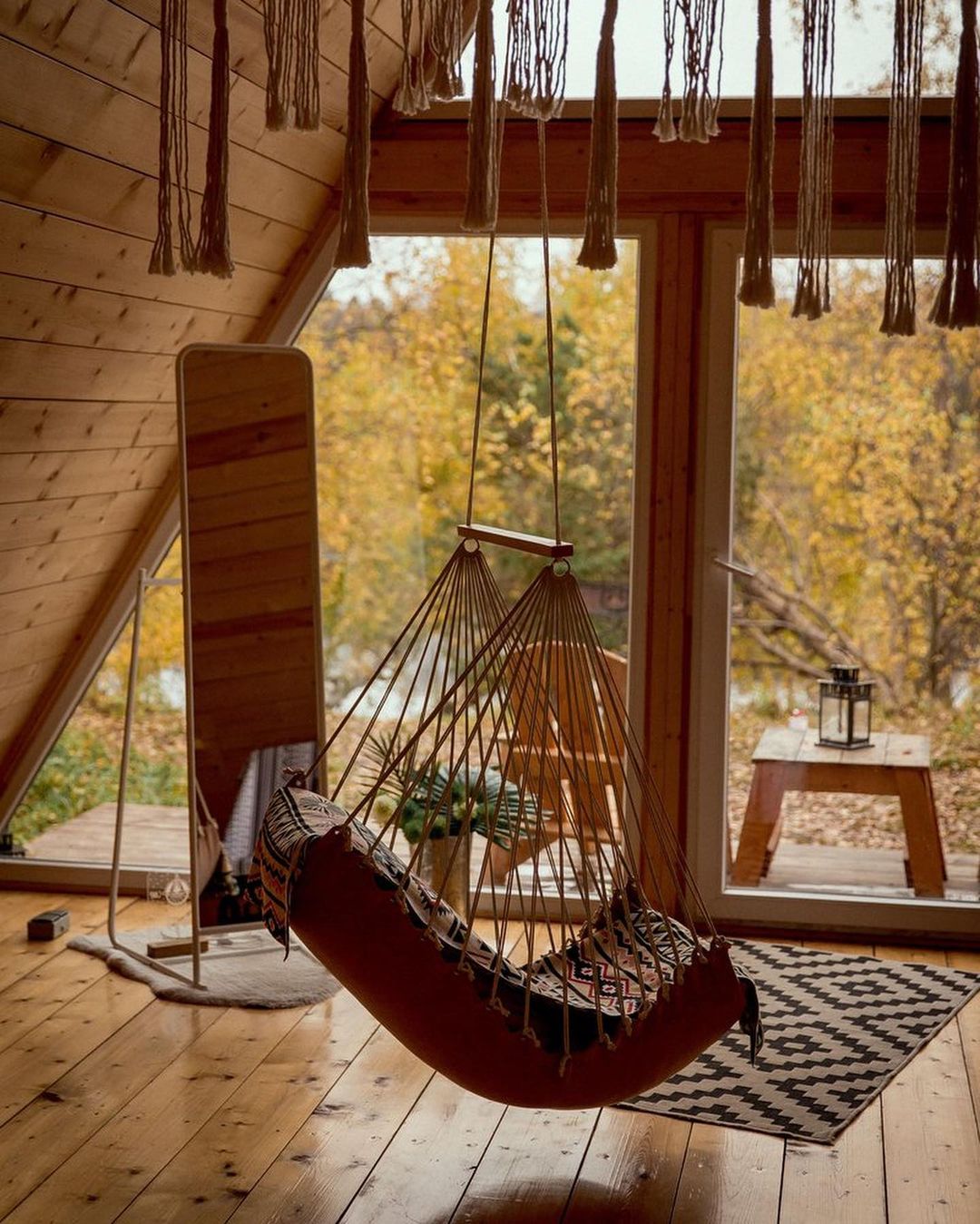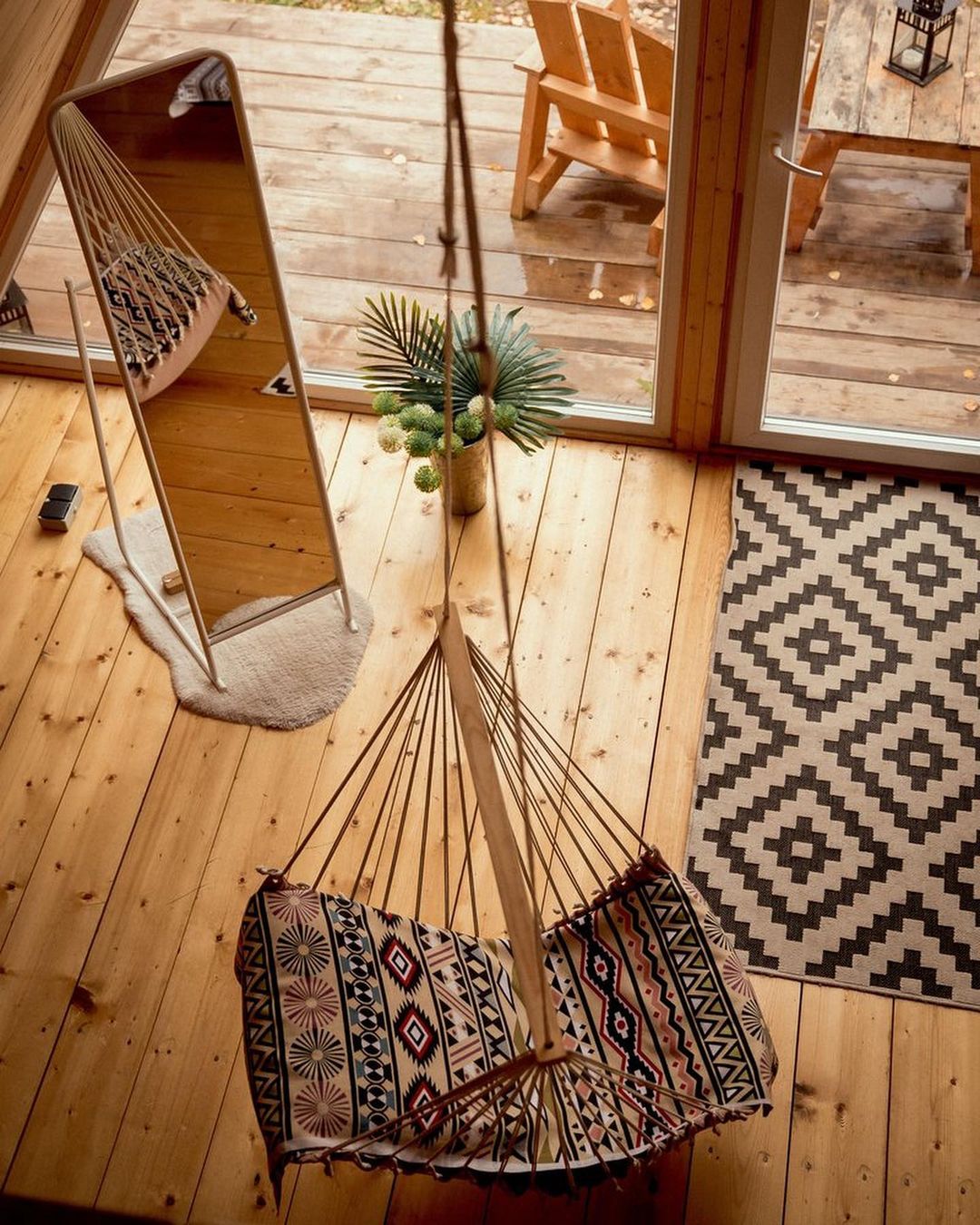 - Зона с гамаками между деревьями и качелями, оформленная в бохо стиле.