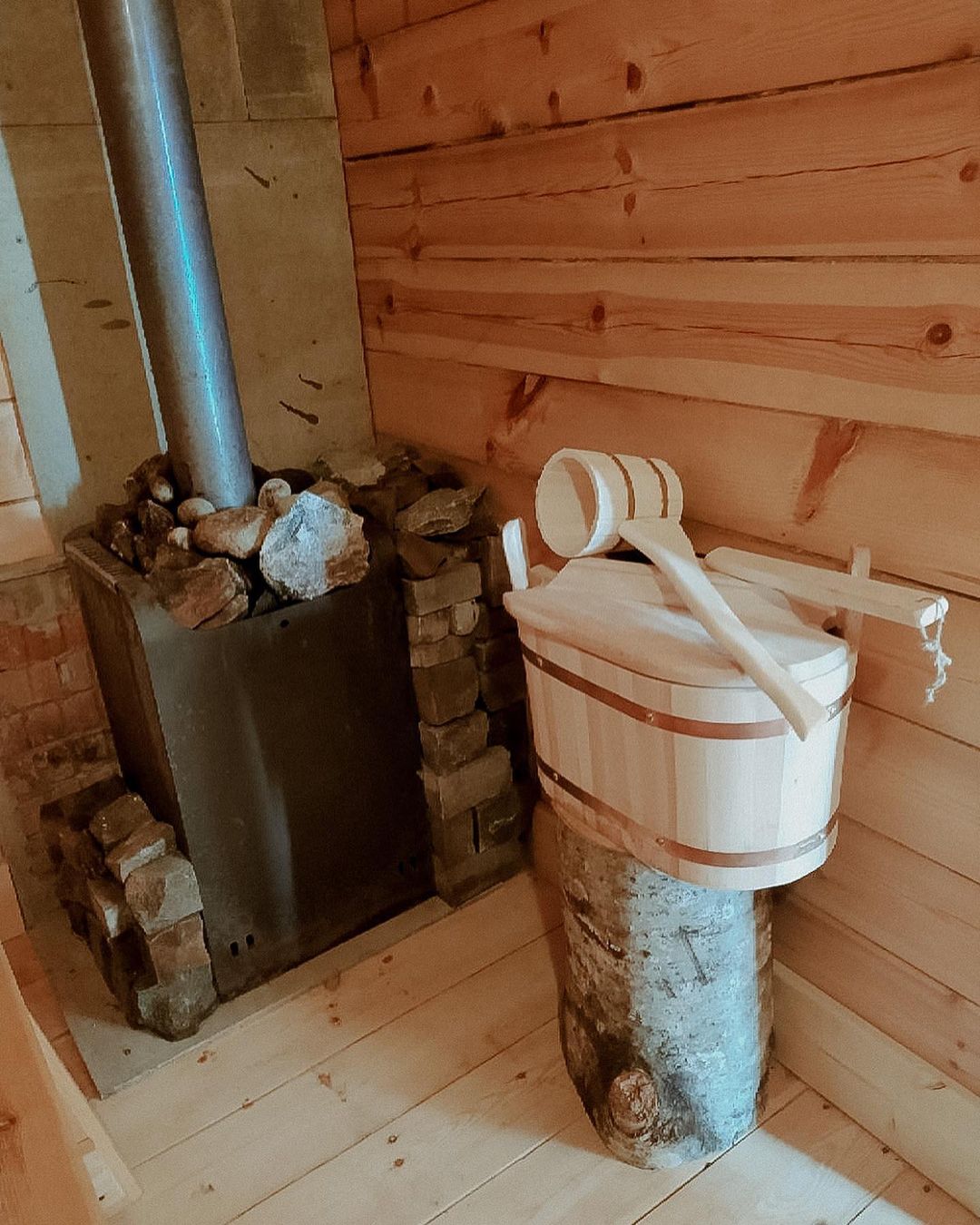 — особенности: в бане все устроено, как в деревне: стоит кадка с водой, чтобы ополоснуться, внутри душ не предусмотрен по технических моментам, химией внутри пользоваться запрещено.