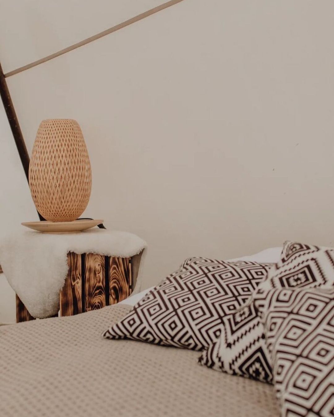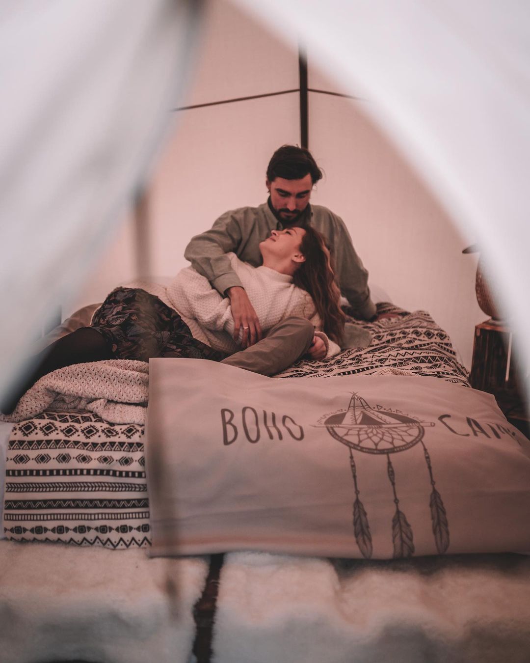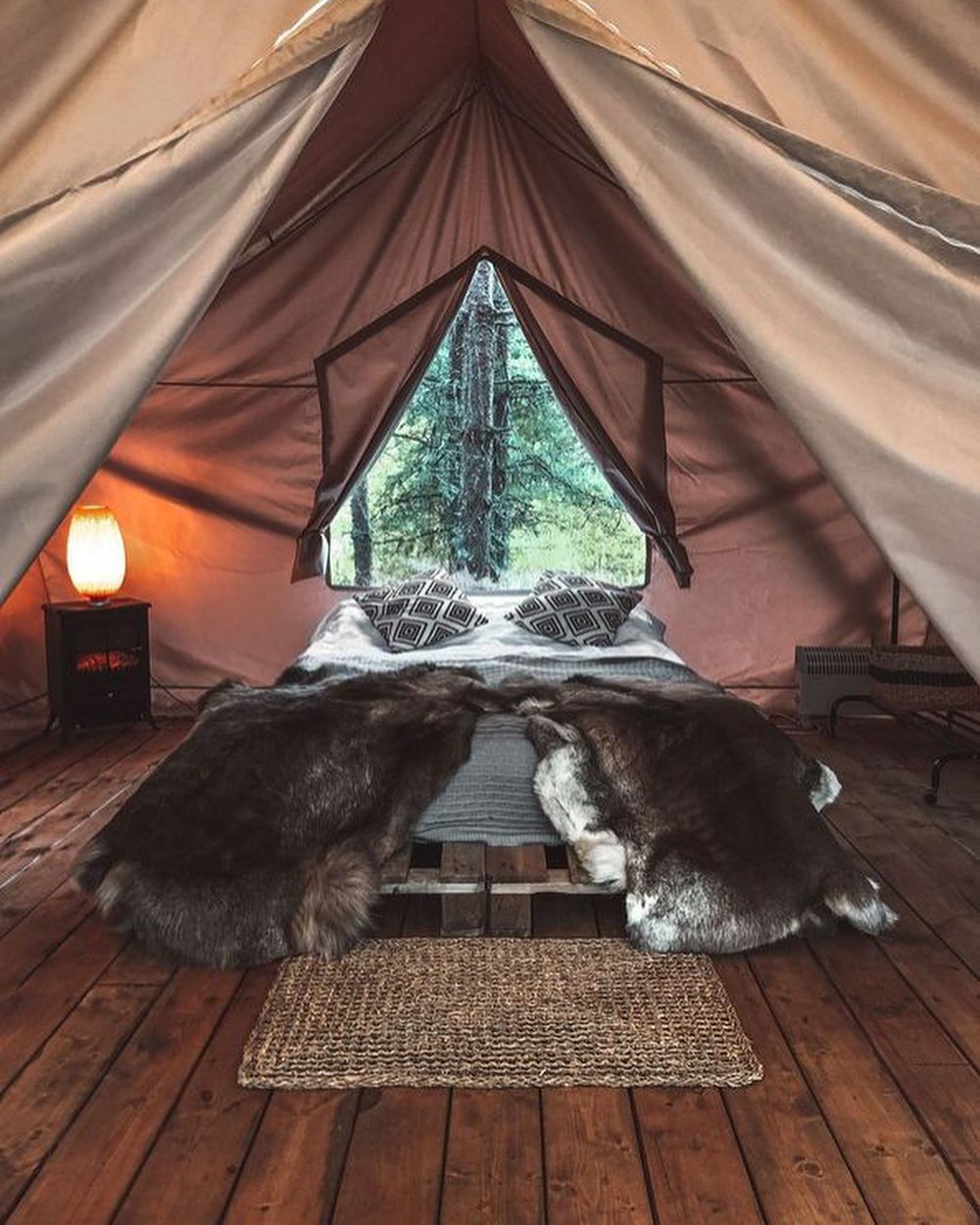 — внутри тента удобная кровать, тёплые пледы, белоснежное постельное белье и полотенца уровня отеля;