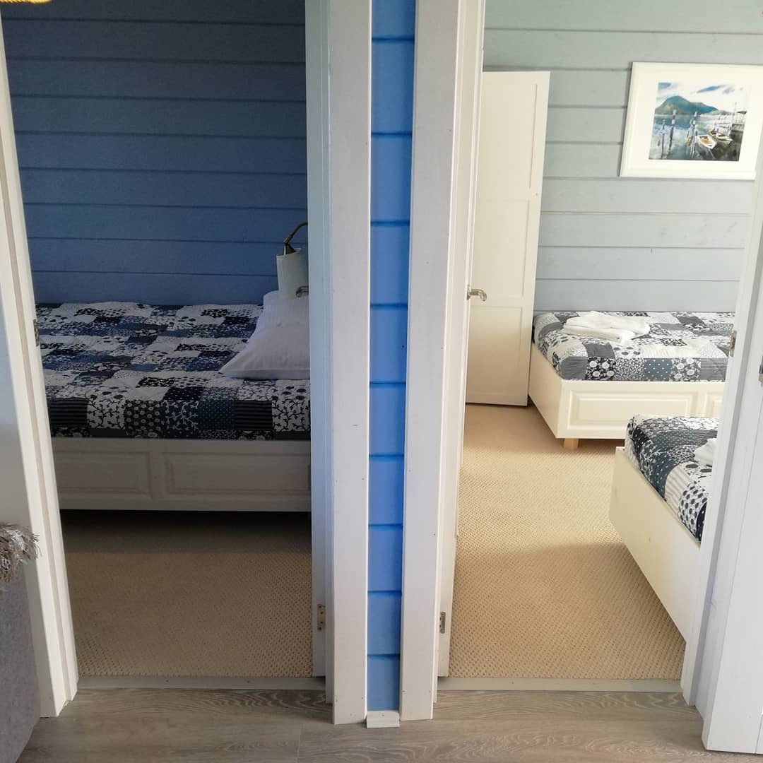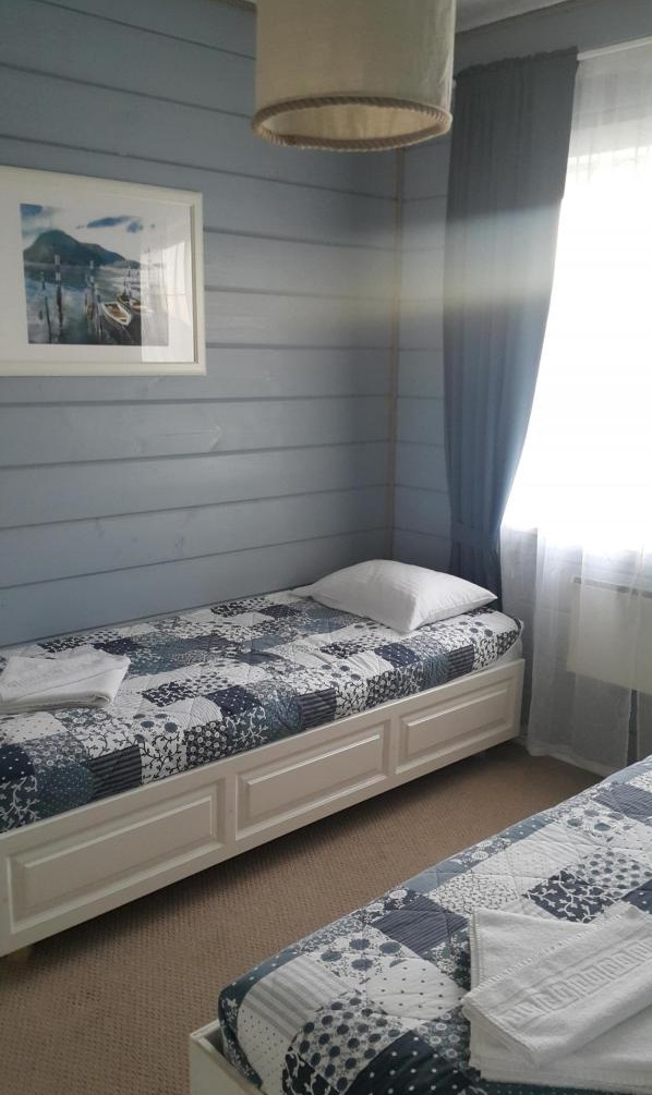 — две спальни, одна с двуспальной кроватью 160х200 (вид на озеро), вторая с двумя односпальными кроватями 80х200 (возможно объединение в двуспальную),