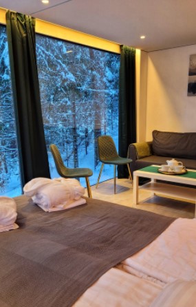 В стоимость проживания включено: проживание для семьи (не более 2 взрослых + ребёнок до 7 и 3 лет), постельные и косметические принадлежности, полотенца, халаты, тапочки, комплиментарный карельский чай, пользование мангальной зоной (мангал, шампуры).