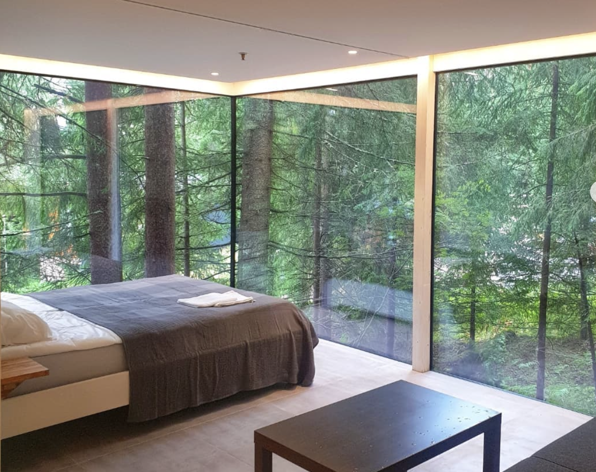Коттедж с видом на лес: Новый (сдан летом 2021г), современный дом с дизайнерским подходом и панорамным видом на лес. Дом представляет собой единое пространство: кухня-спальня-гостиная. Дом очень тёплый, уютный. Идеально подойдёт для семьи (кровать отделяется от дивана плотной шторой). Кухня полностью оборудована: вся необходимая посуда, микроволновая печь, холодильник. Санузел, кровать, диван, журнальный столик, кресла.