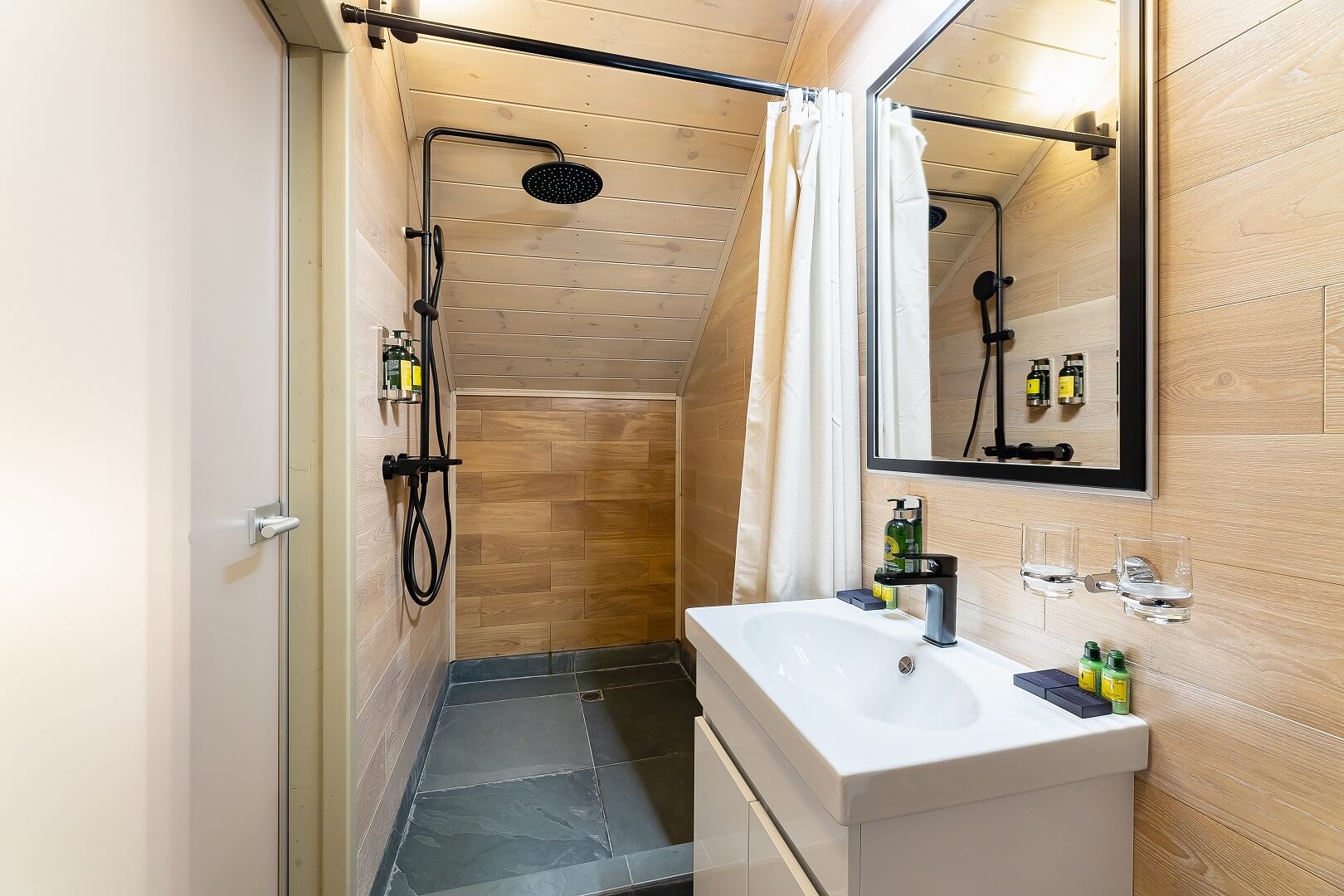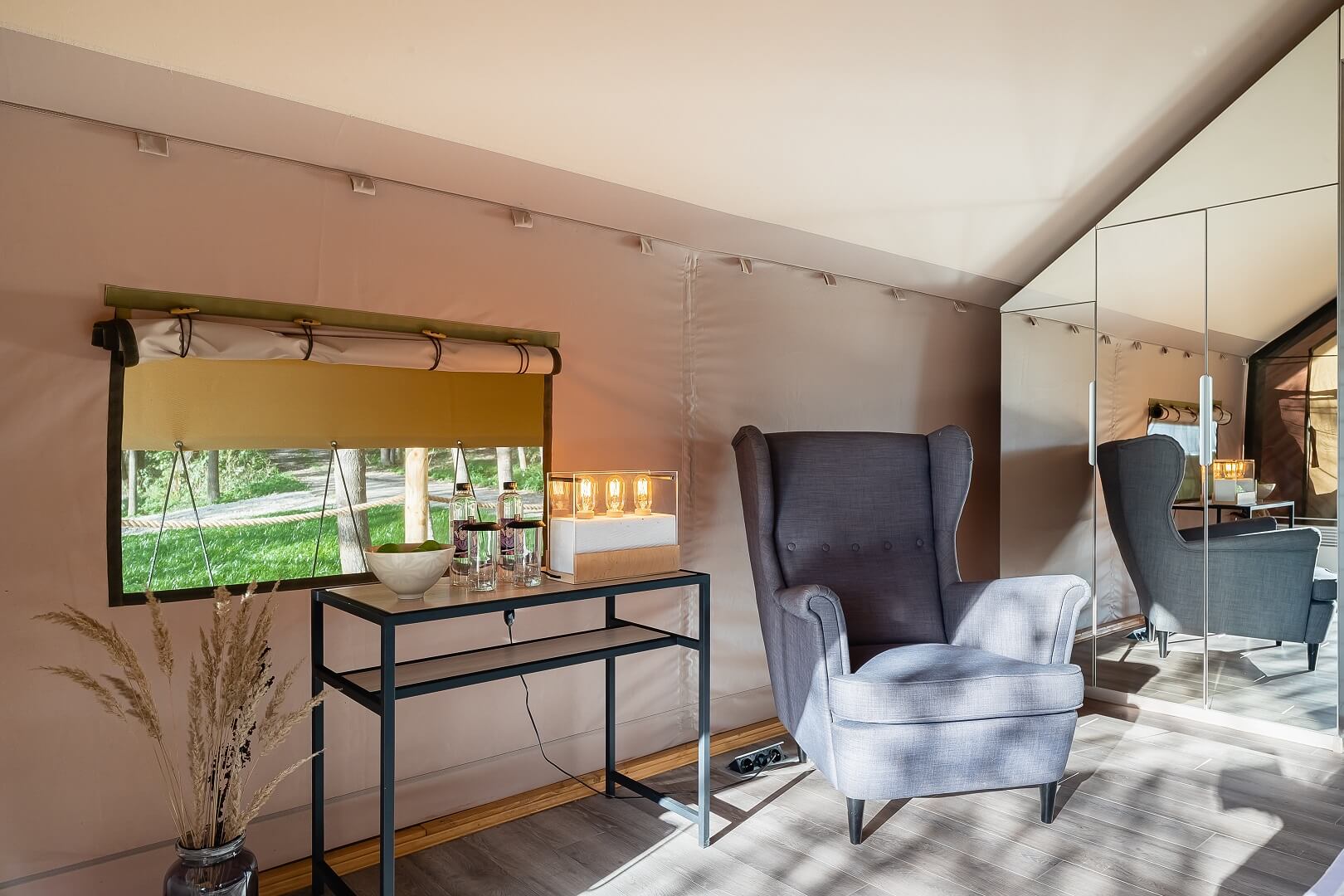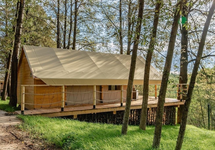 В каждом круглогодично доступном для проживания глэмпинг-шатре есть душ и туалет, подогреваемые полы, чайная станция, фен, полотенца, халаты и тапочки, французская косметика L'Occitane и гигиенические наборы.
