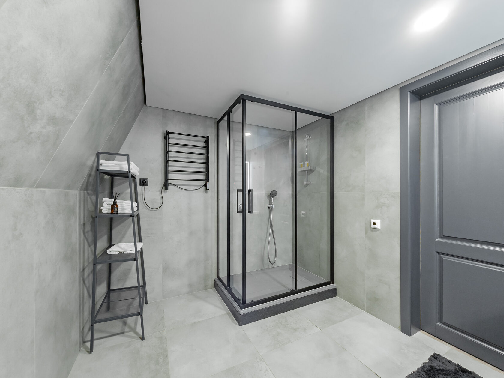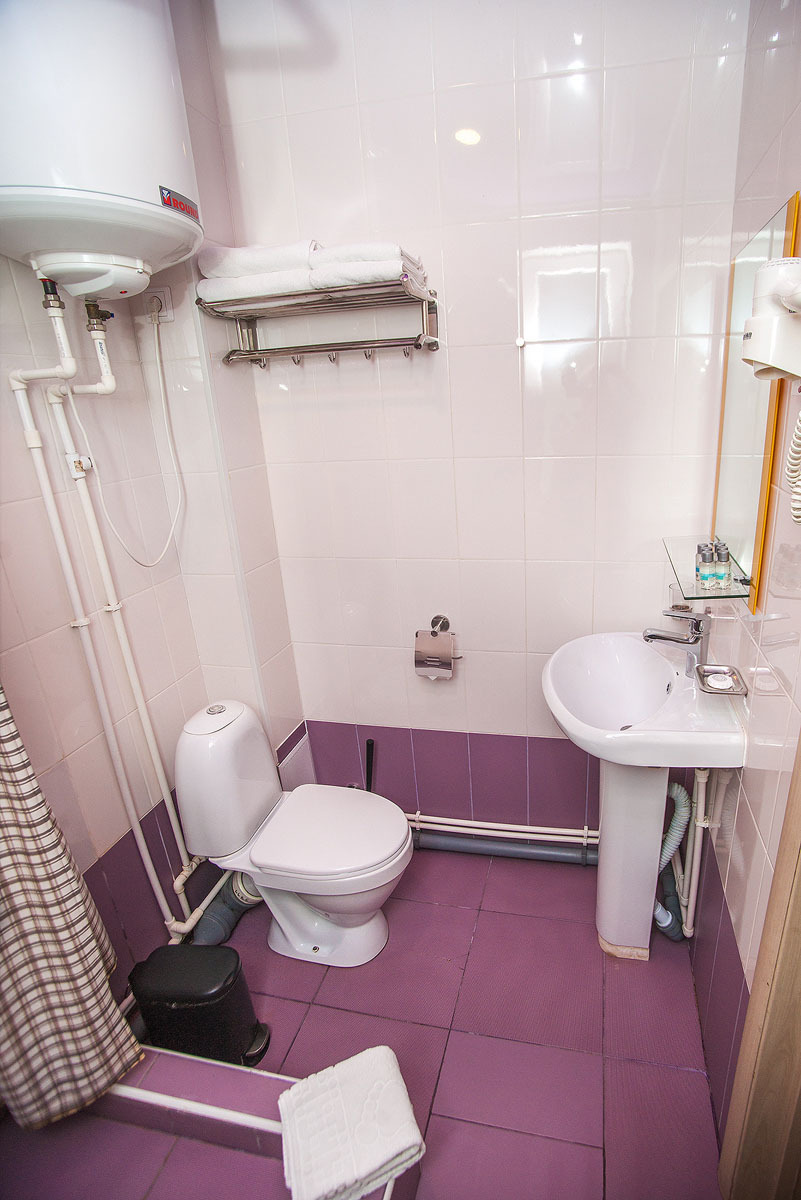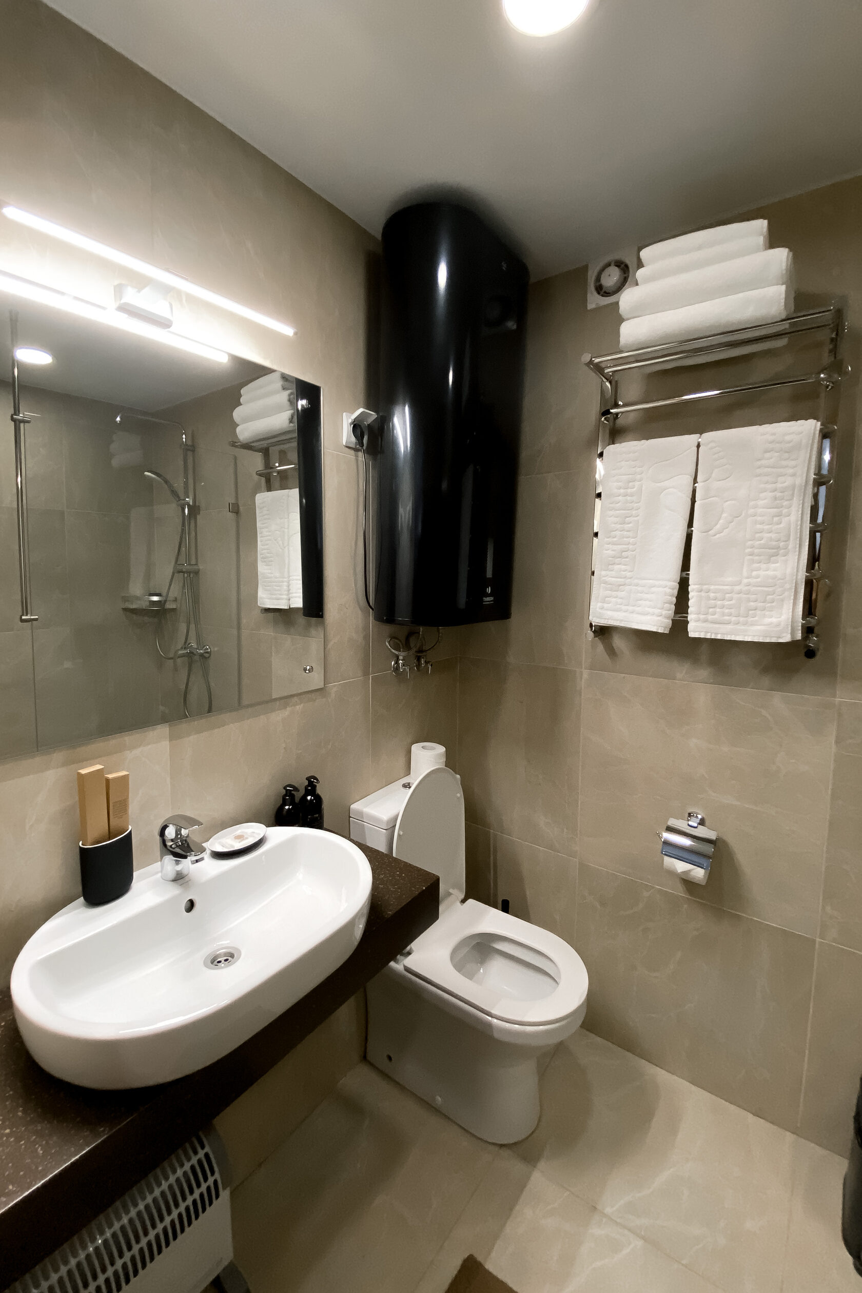 Номер укомплектован душевой кабиной и раковиной. Теплый, оборудованный всем необходимым, санузел находится в шаговой доступности от номера