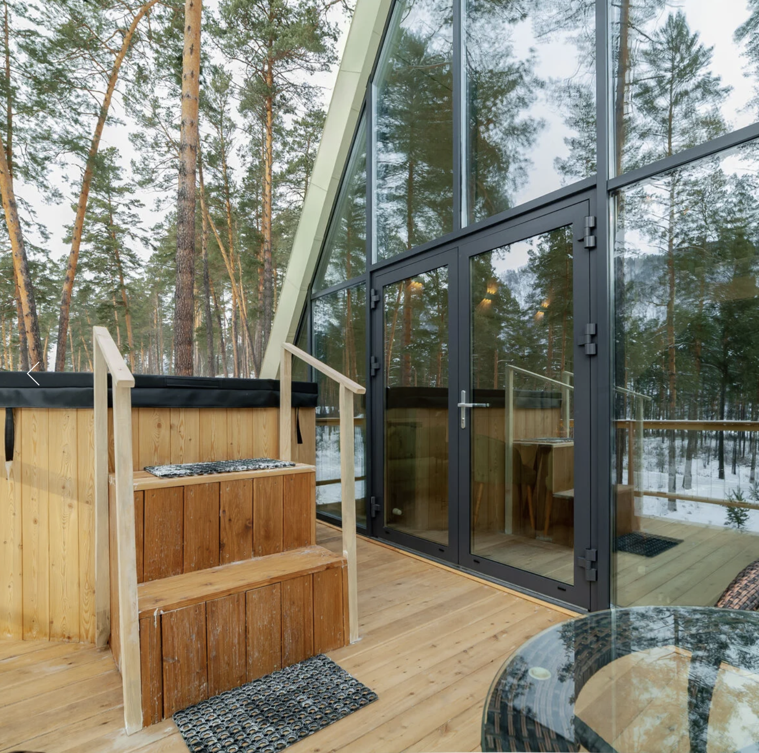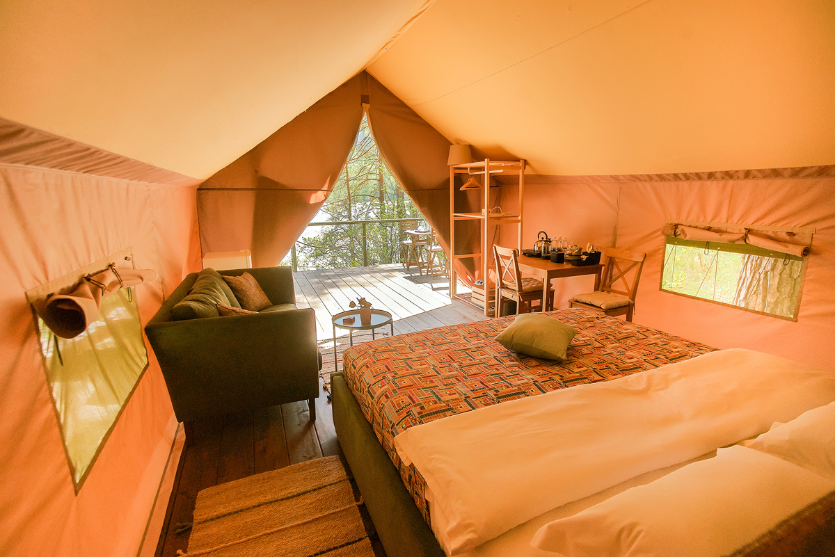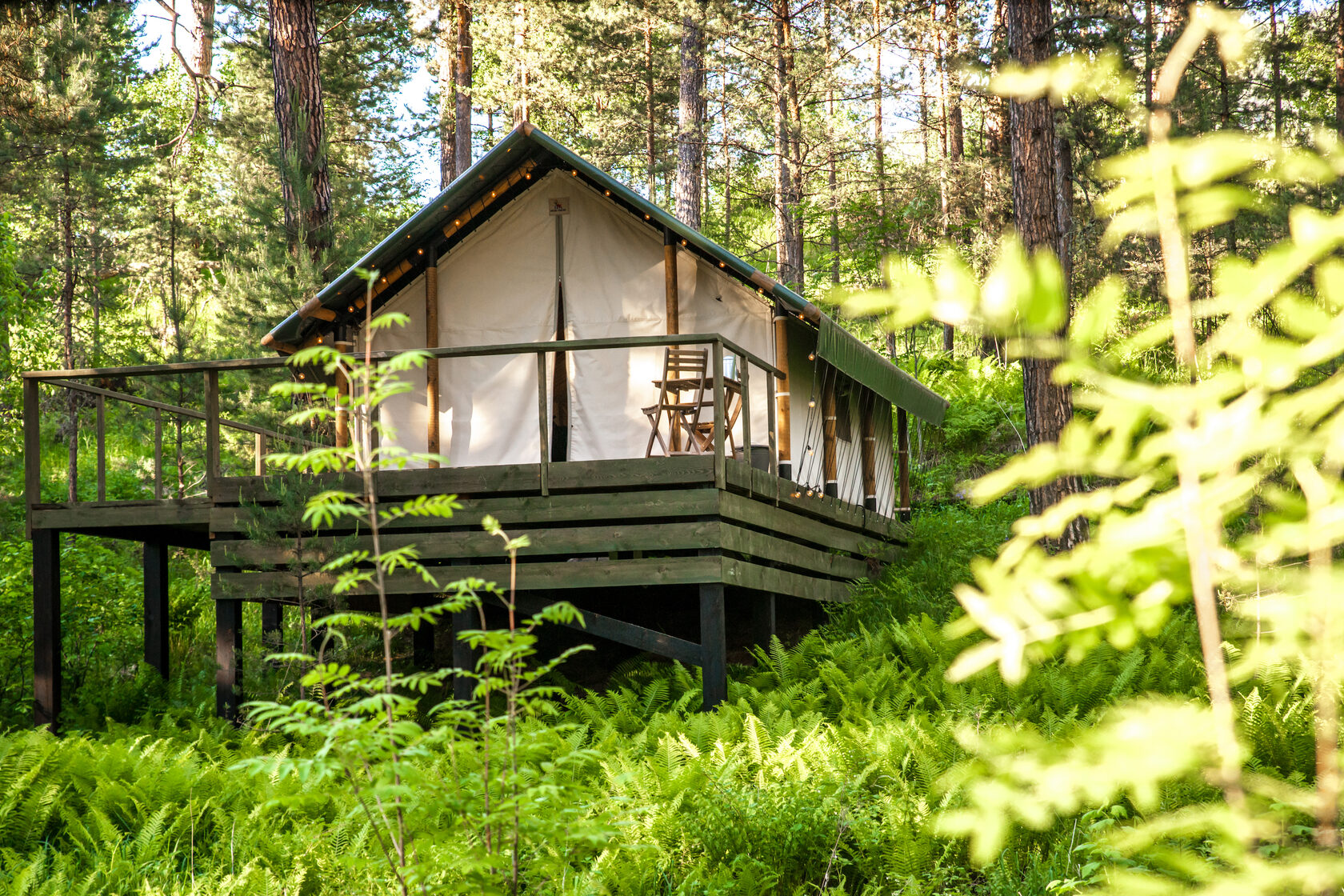 Комфортабельный сафари-тент на жестком конструктиве. Два варианта : у реки и с панорамным видом на лес