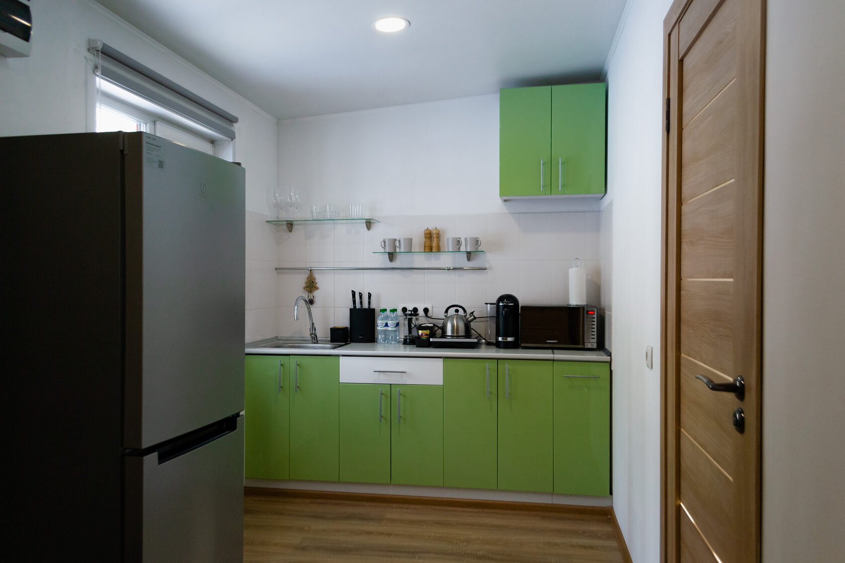 Кухня: кухонный гарнитур, минихолодильник, индукционная плита, чайник, микроволновая печь, посуда, бокалы, столовые приборы,